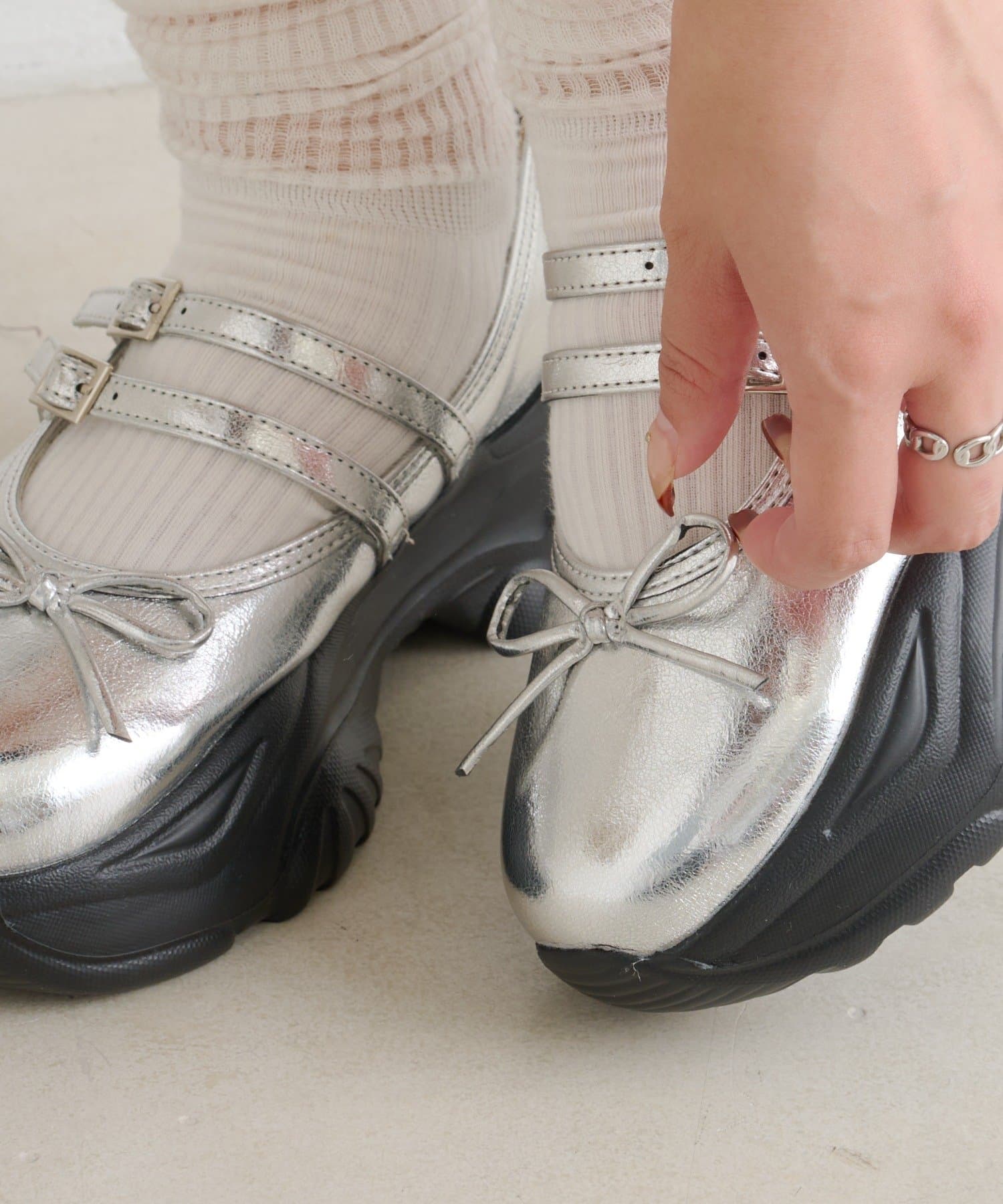 ・厚底スニーカーデザインに華奢なベルトをプラスしたバレエシューズ