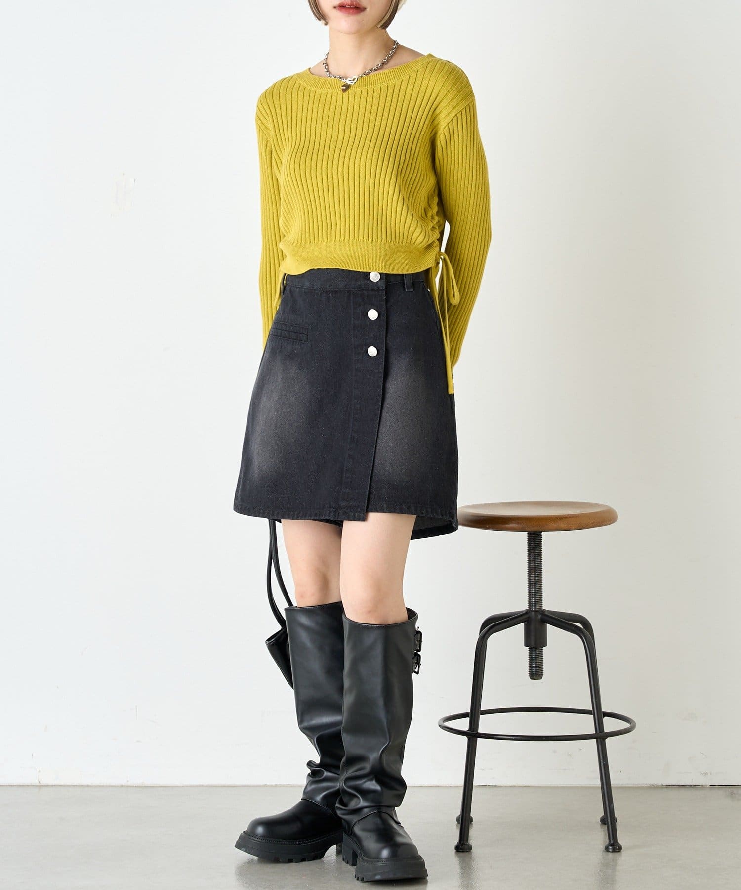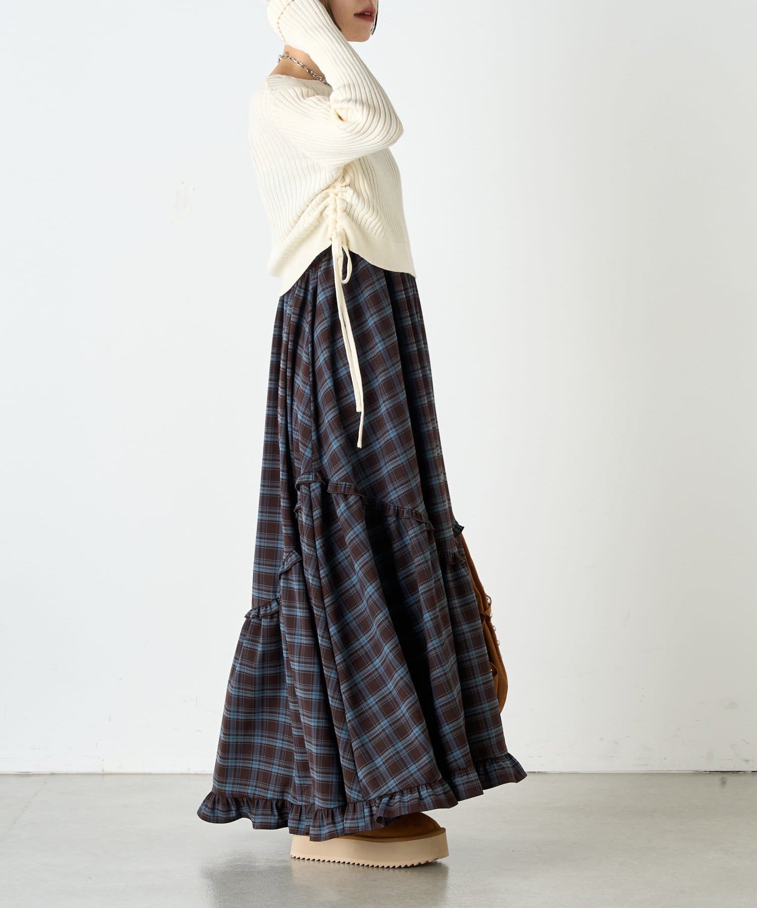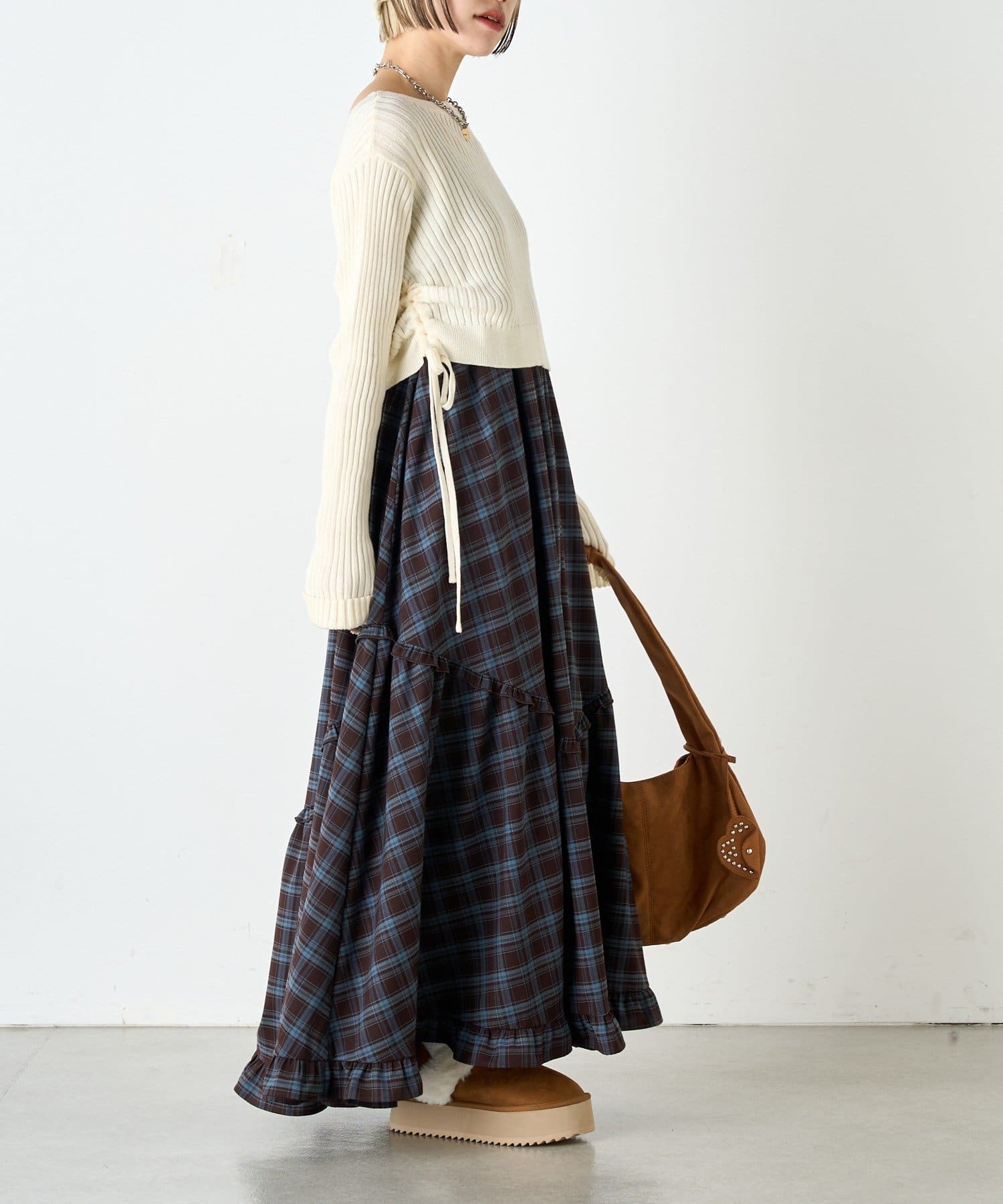 ・ドロストを絞って短め丈のスタイルはロングスカートでもミニでも脚長効果!