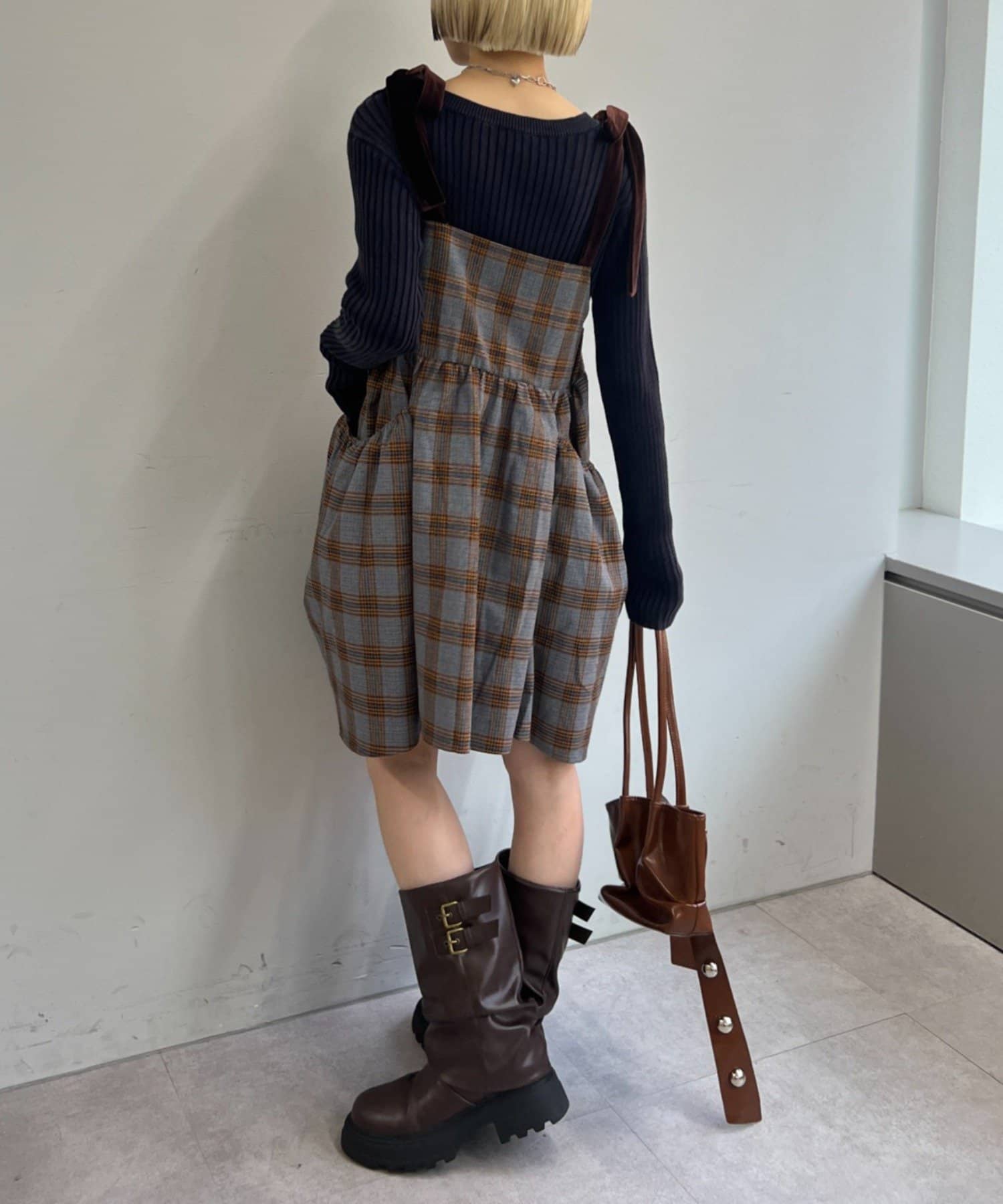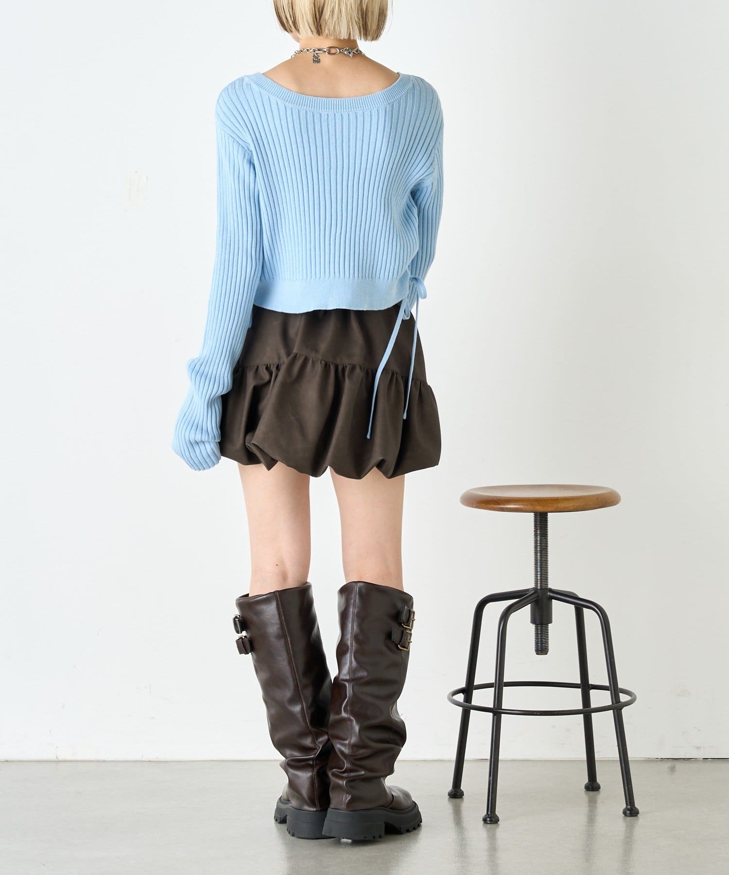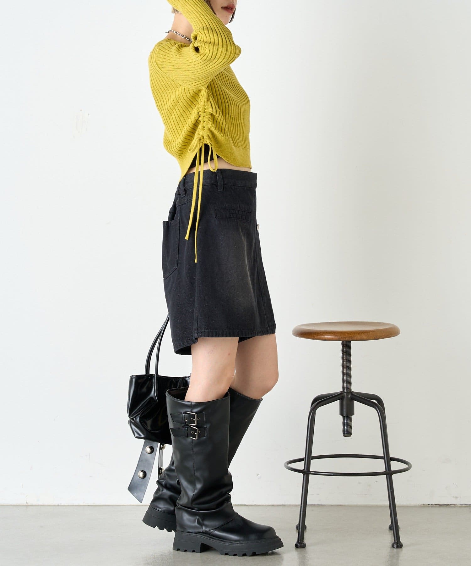 ・ドロストを絞って短め丈のスタイルはロングスカートでもミニでも脚長効果!