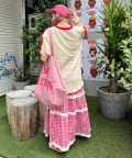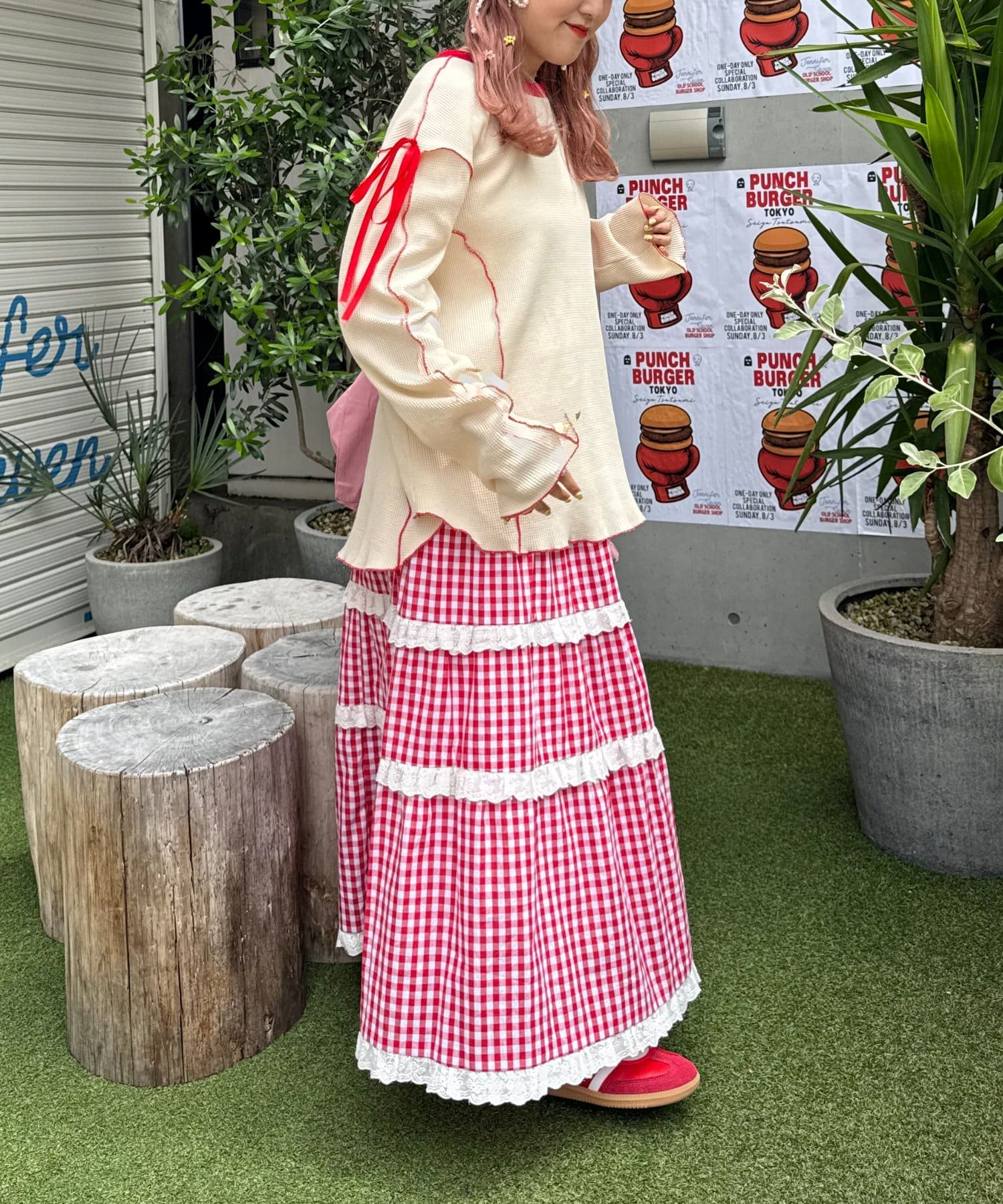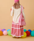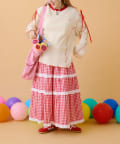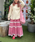 ・少し大きめのシルエットを生かしロングスカートと合わせたゆったりしたスタイルに