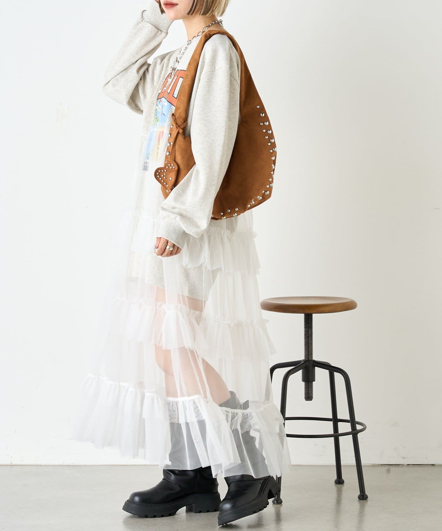 ・スウェット自体もお尻が隠れるくらいの丈感なので、チュールの透け感を生かしショートパンツ×ロングブーツがカワイイ!