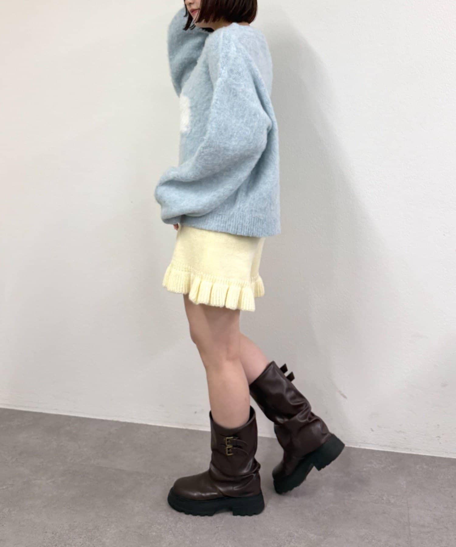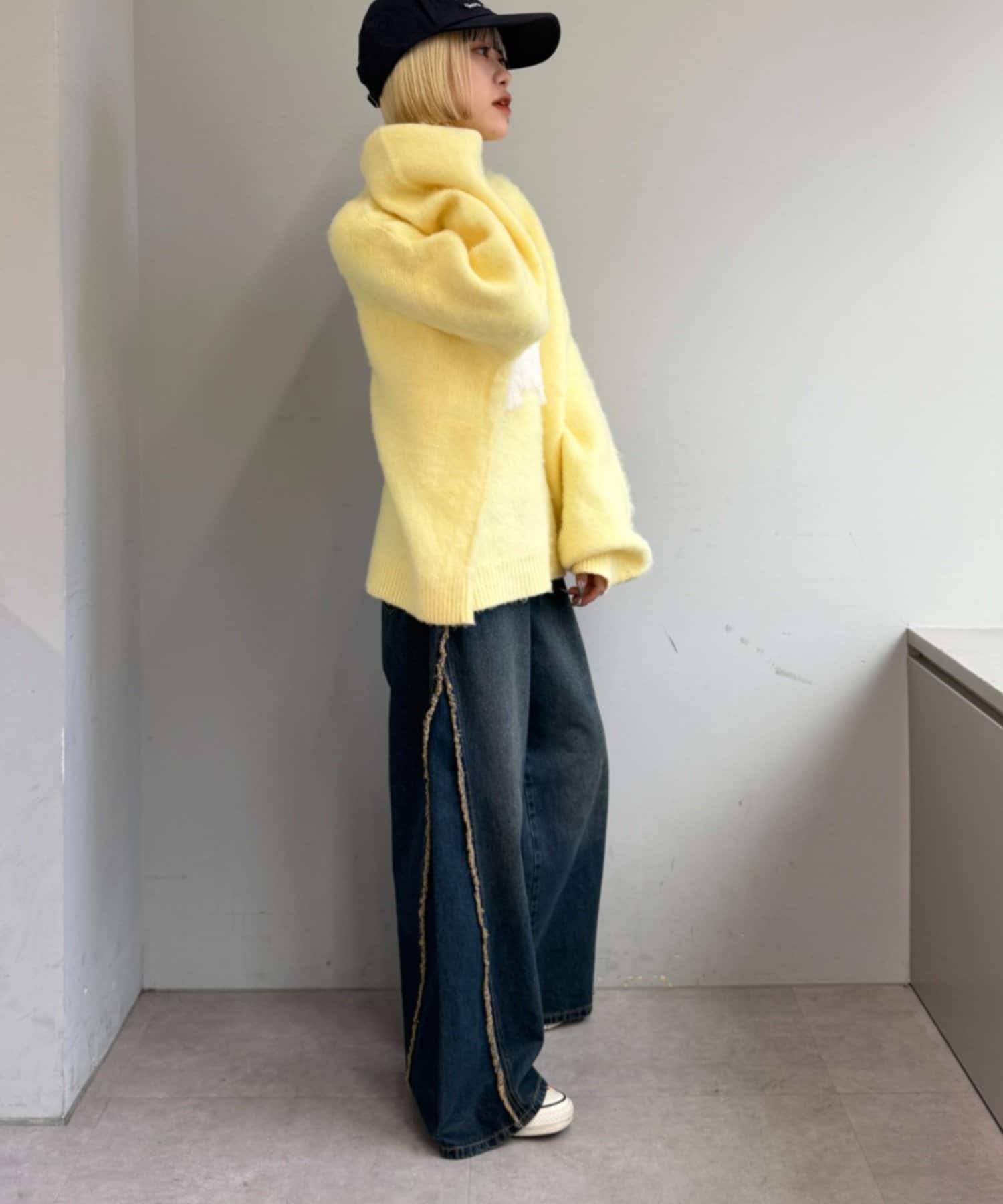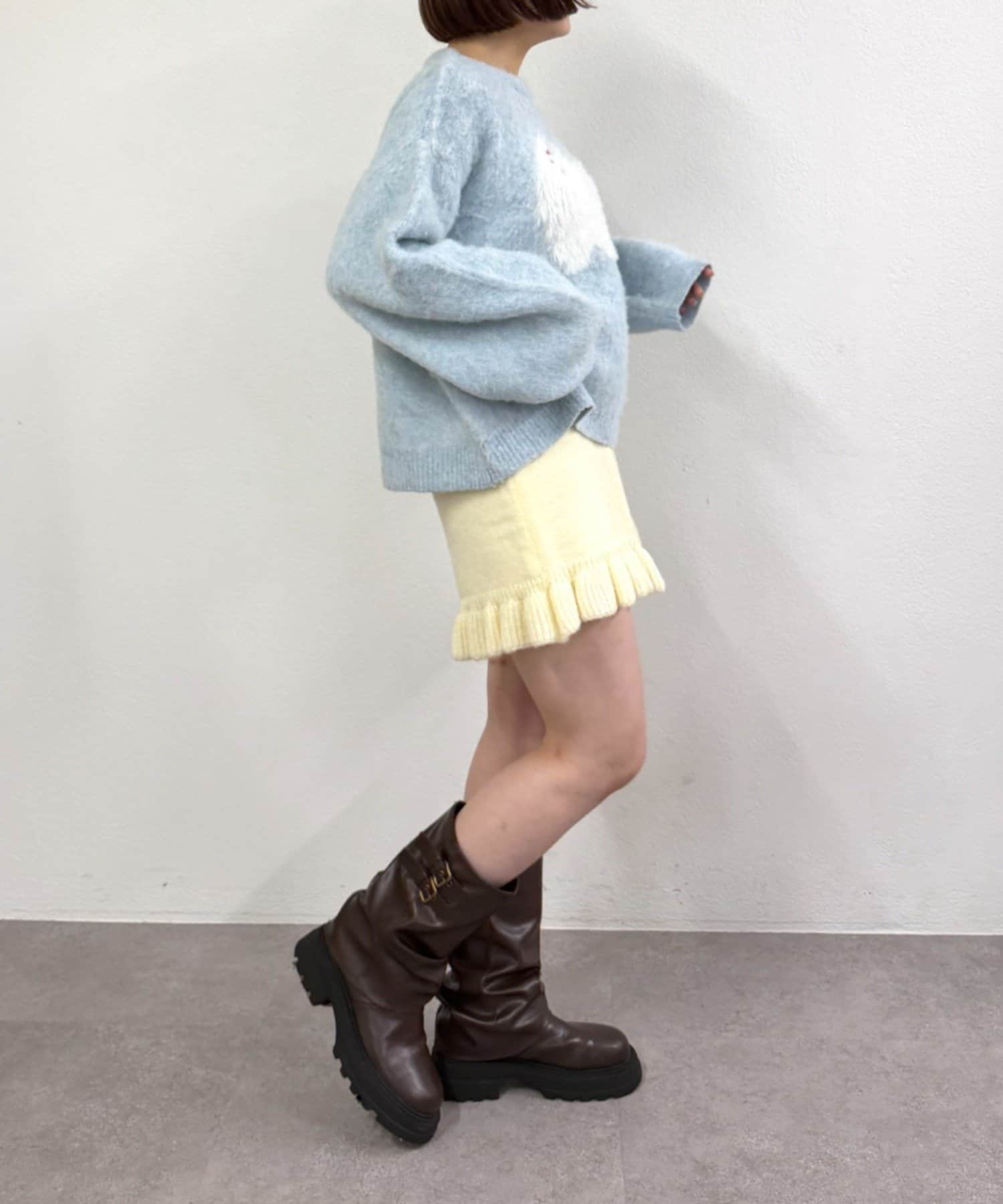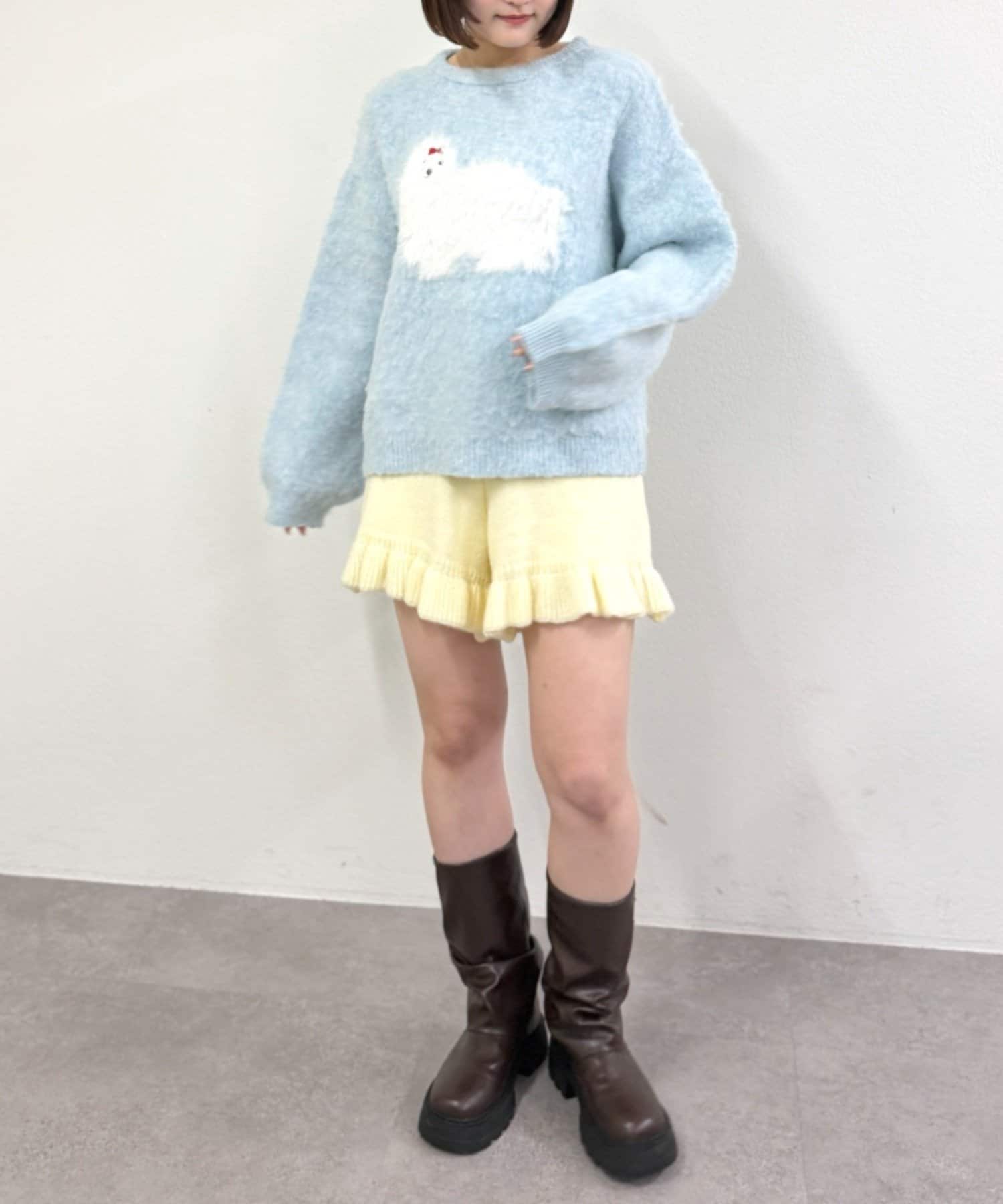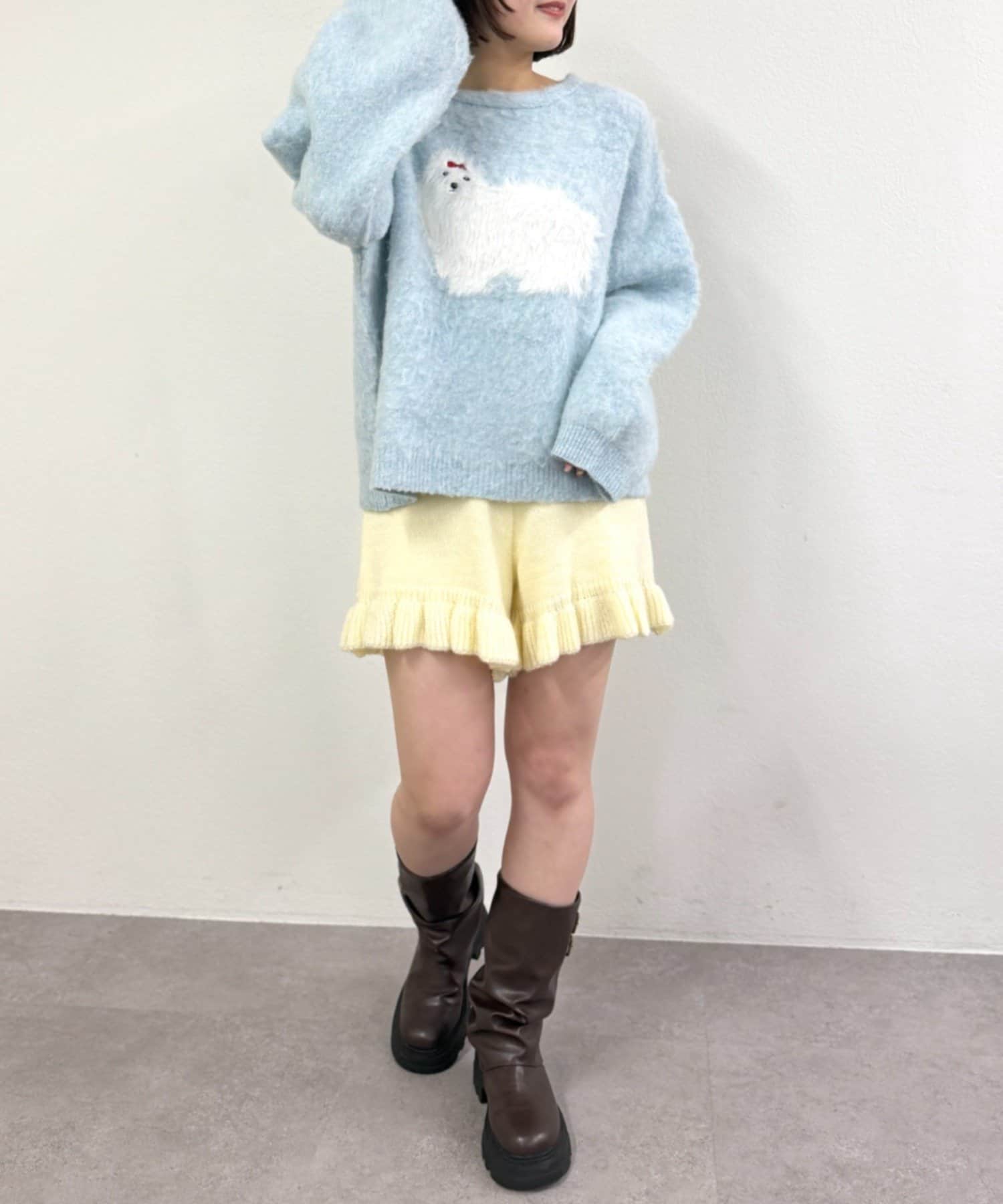 ・カラーのタートルを重ねることで首元にポイントが生まれ、犬ニットの可愛さがより引き立つコーデに