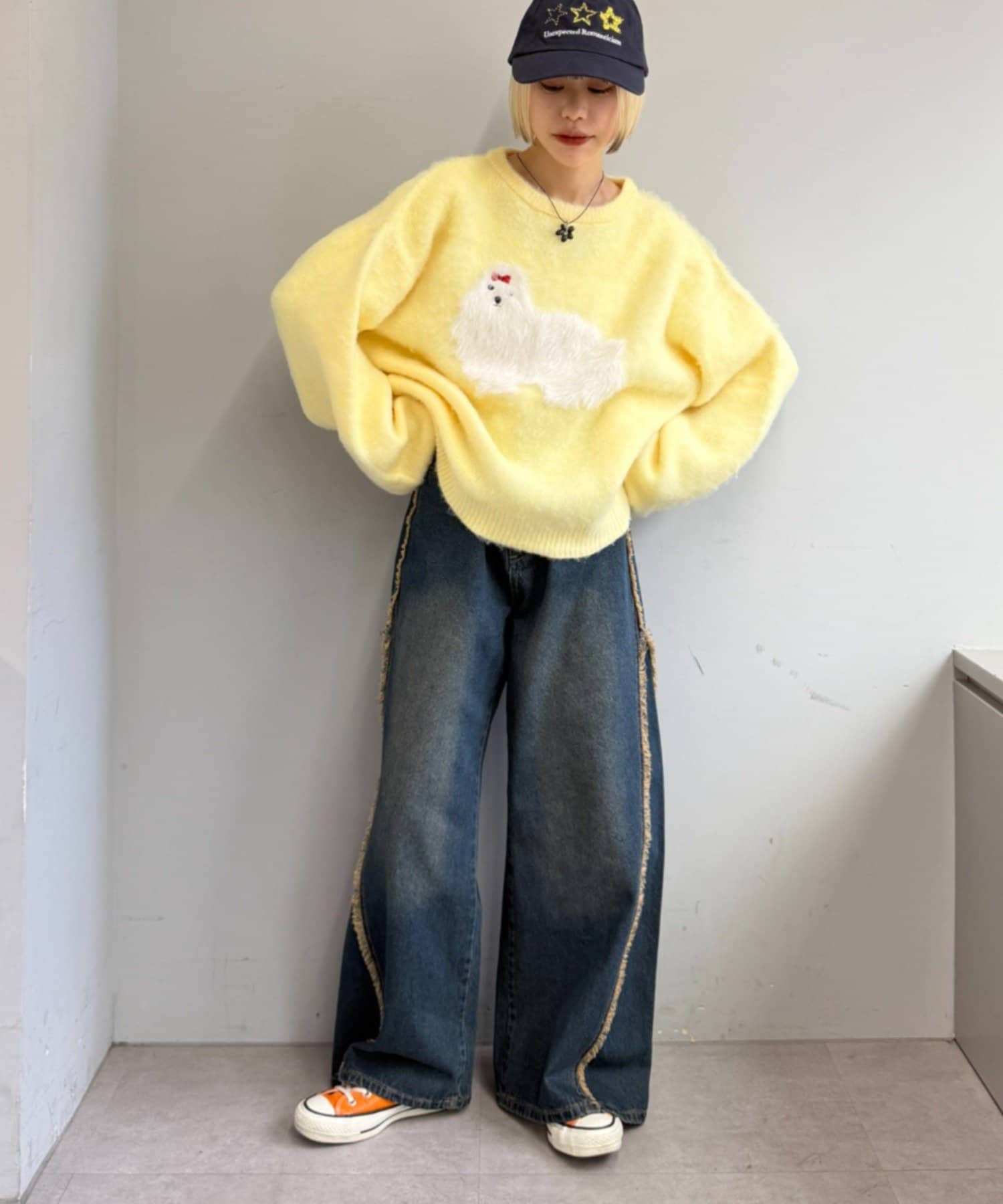 ・ゆったりシルエットで抜け感を演出しつつ、犬モチーフで遊び心をプラス