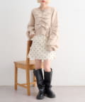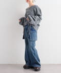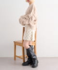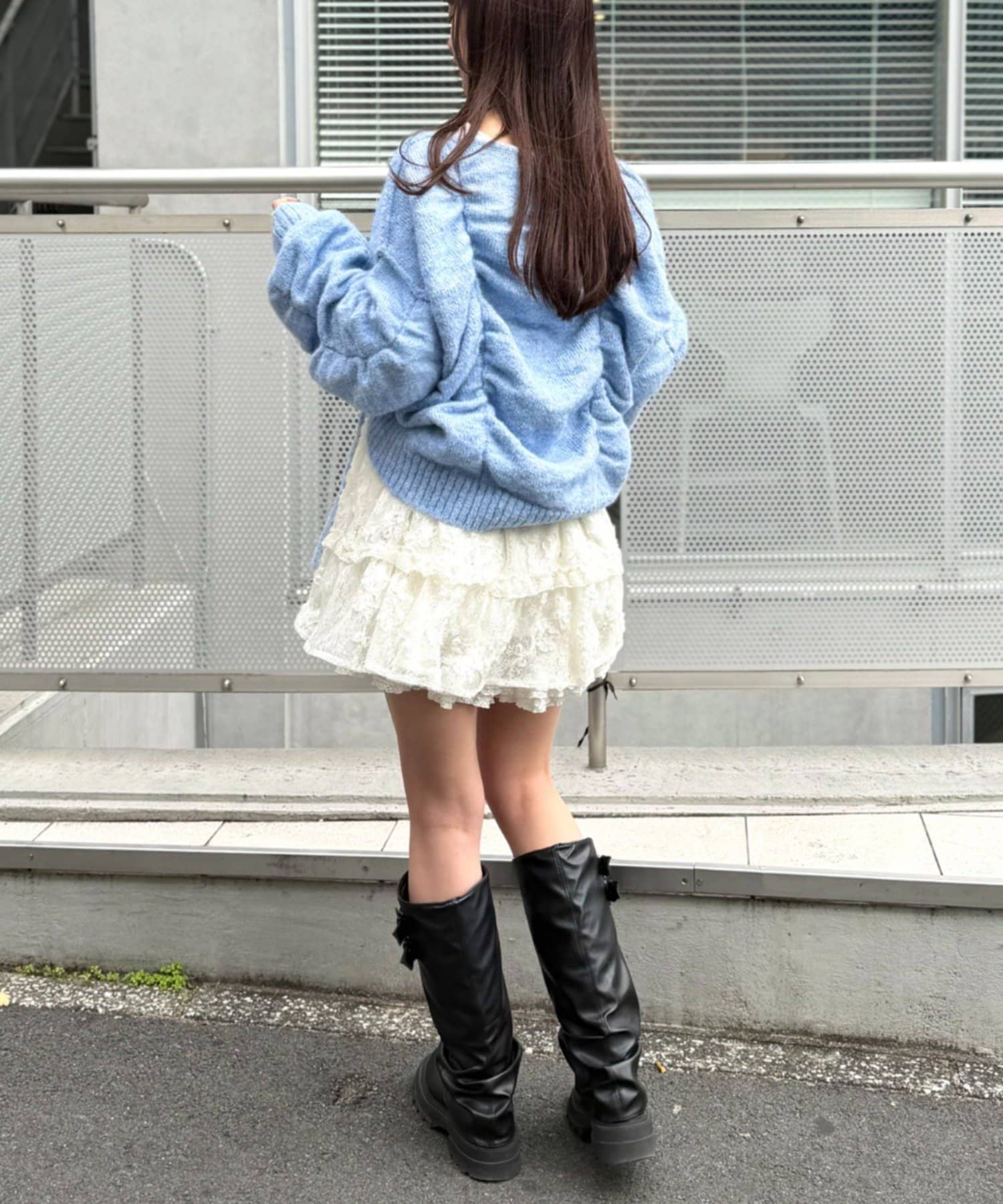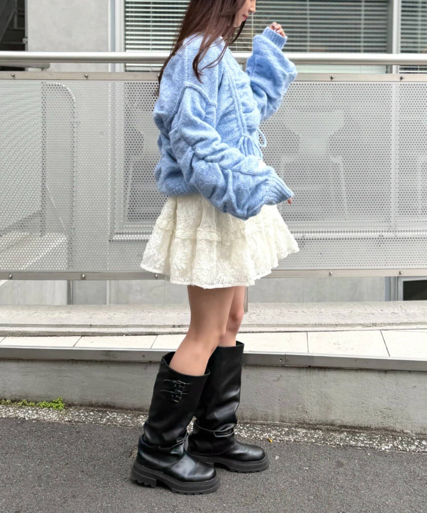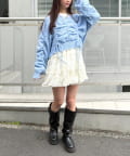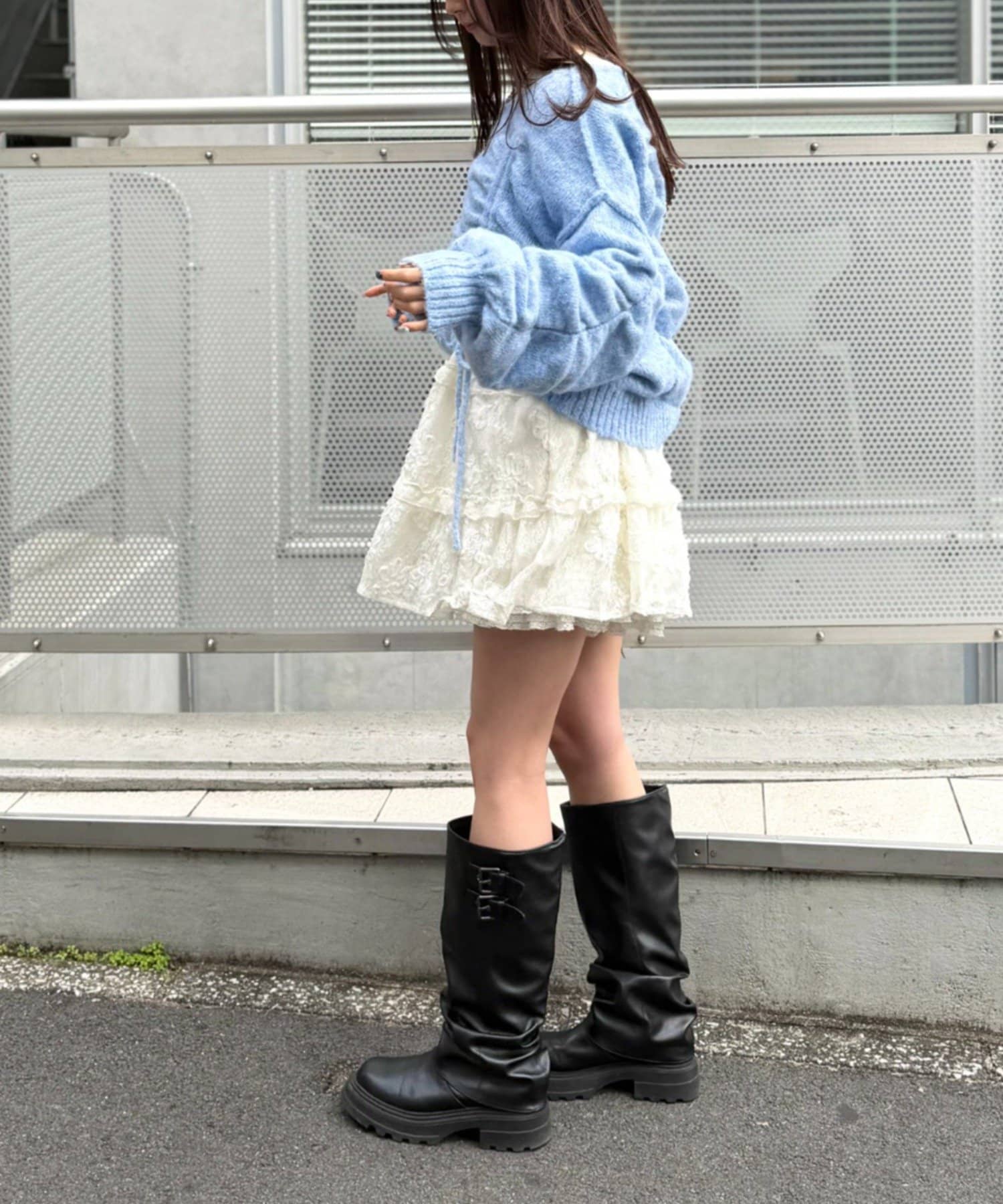 ・下にキャミワンピをレイヤードしてミニボトム×ロングブーツ、レイヤードスタイルにデニムを合わせるのもかわいいです!