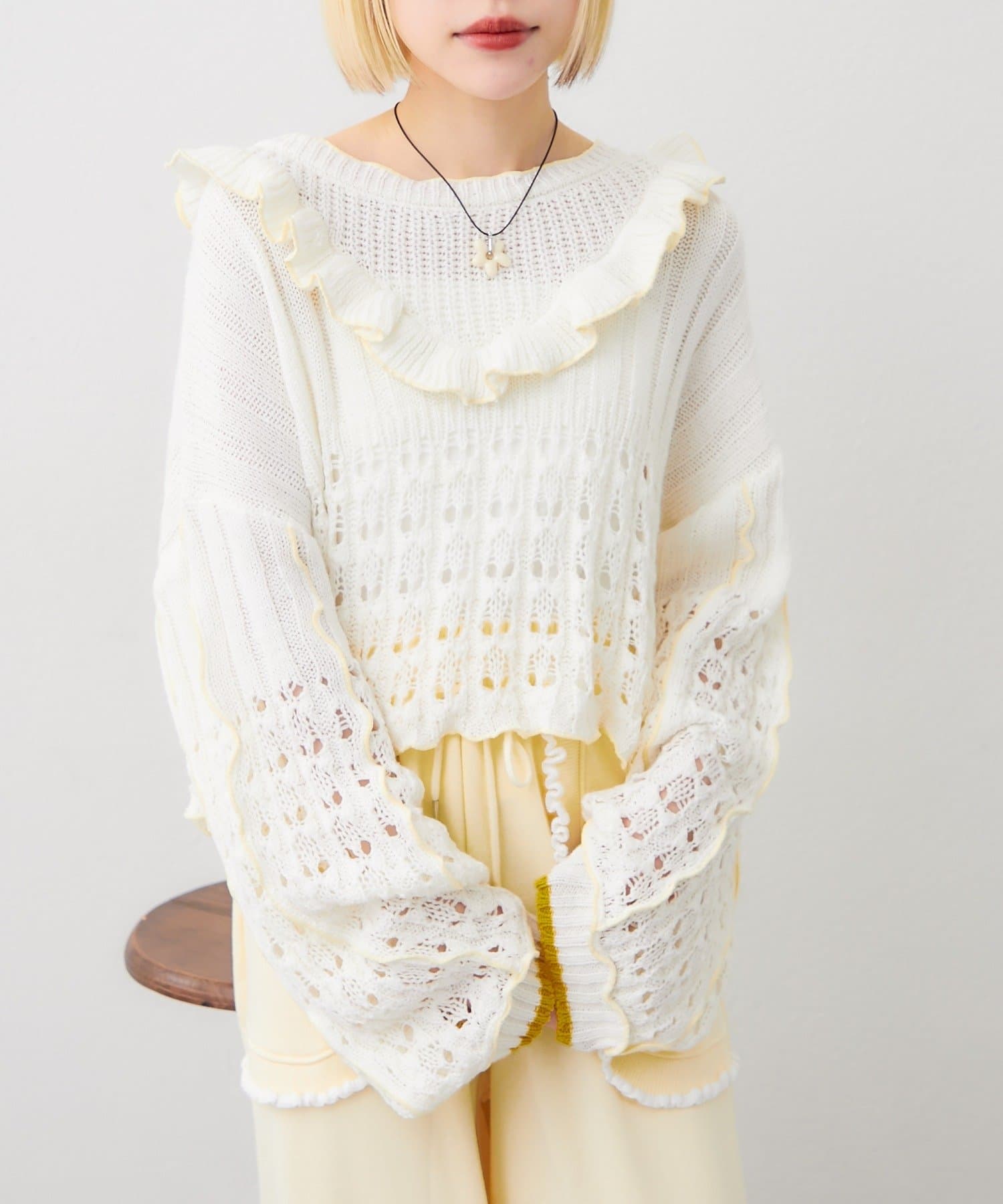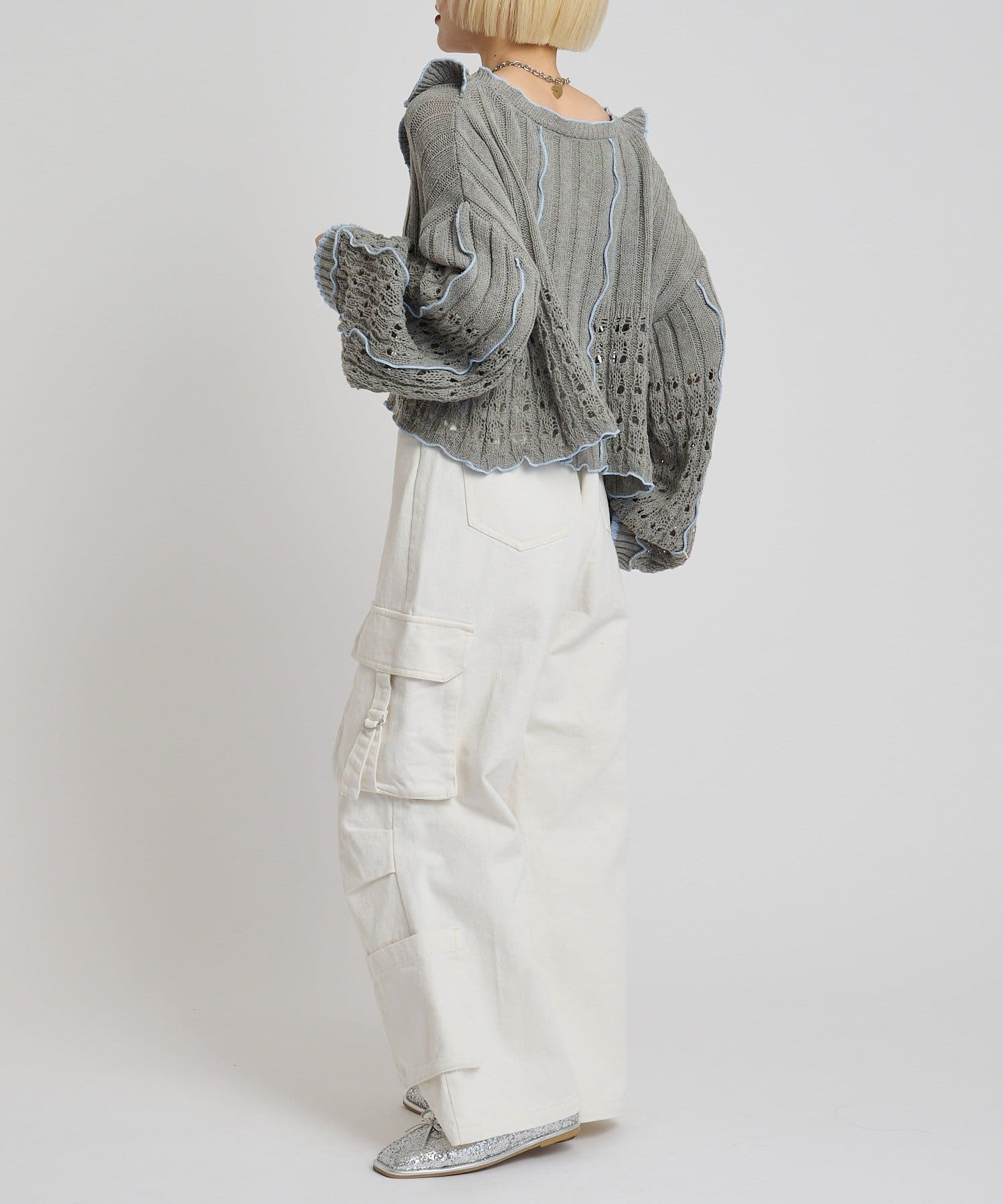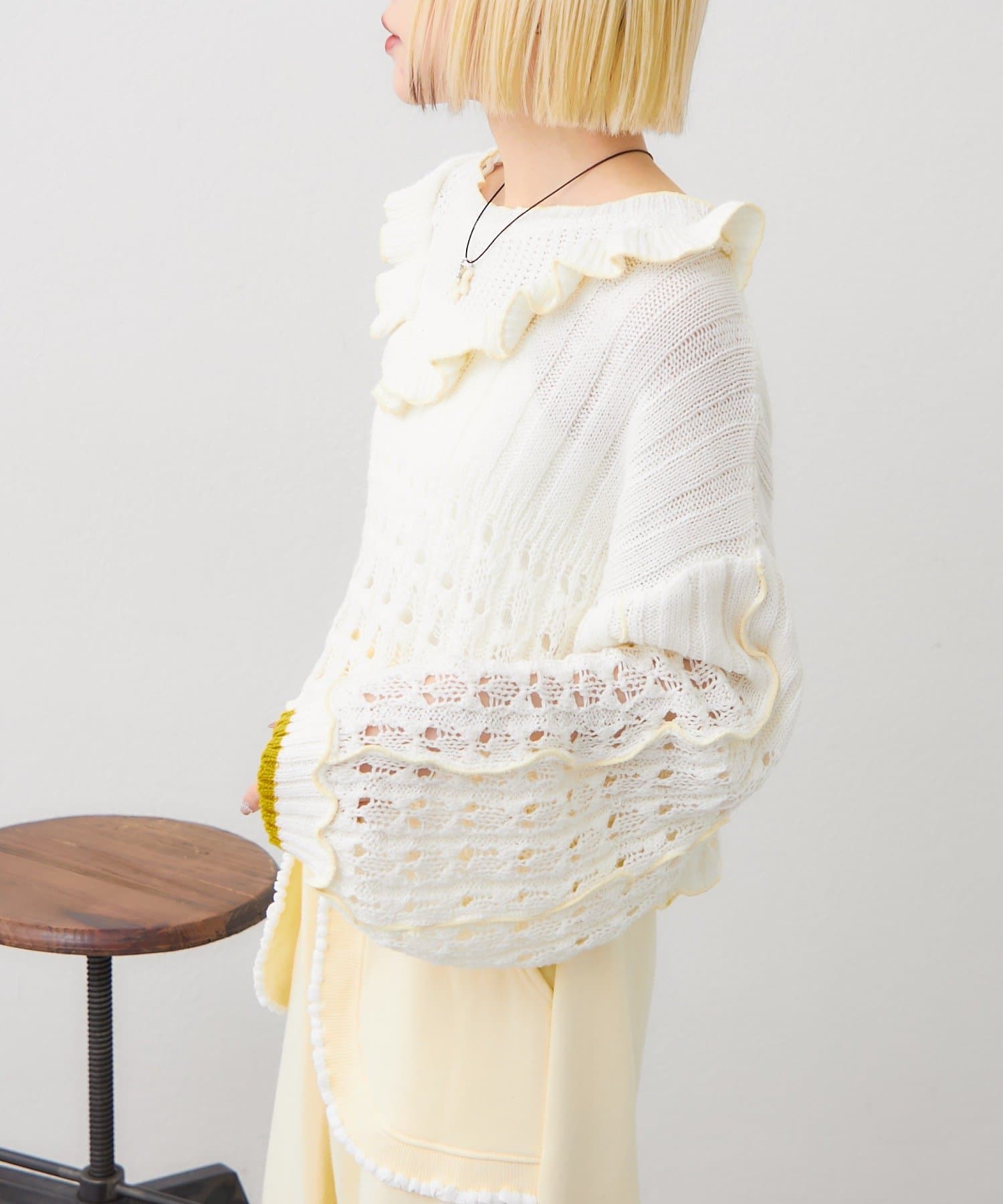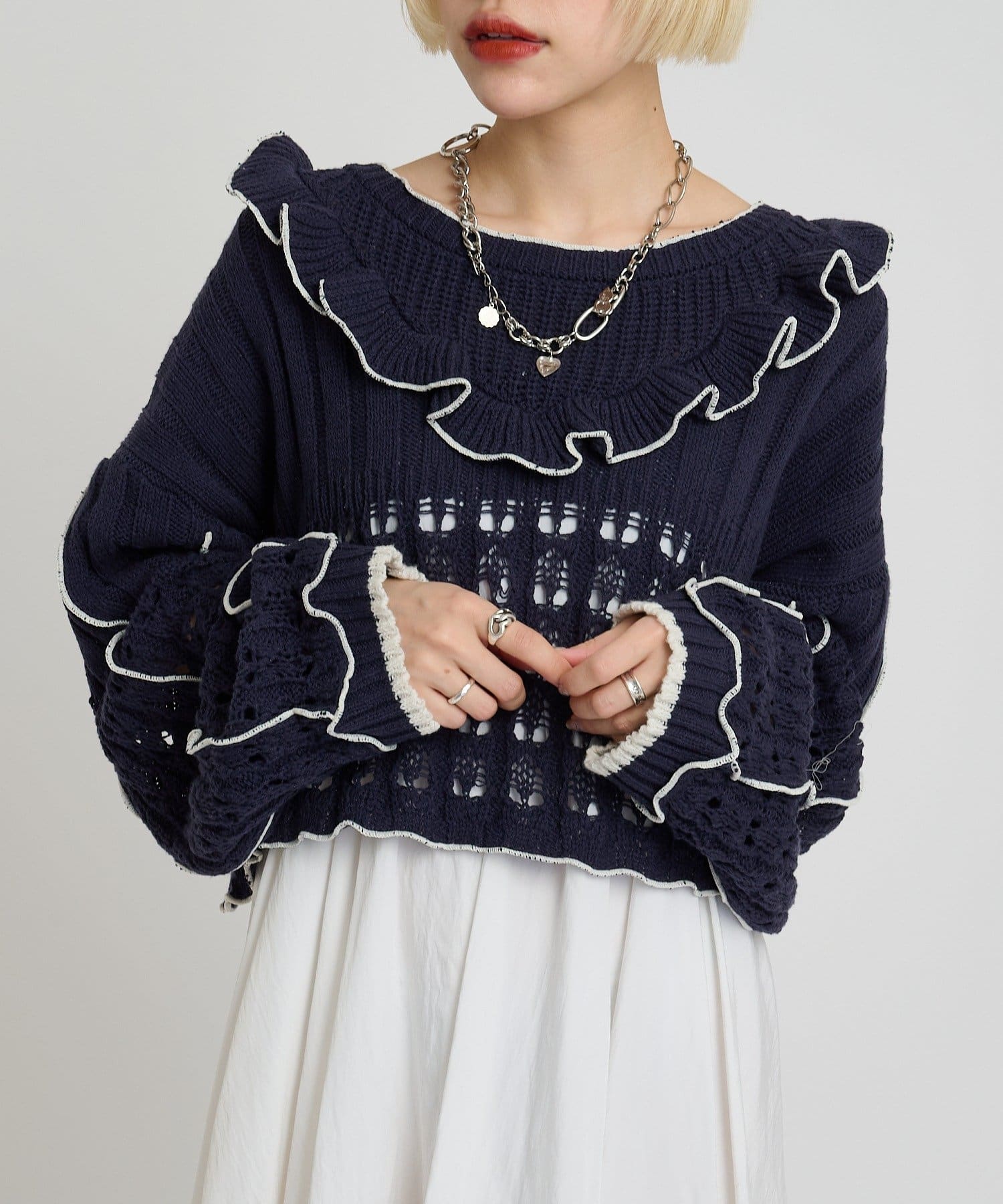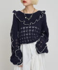 配色フリルが映える 透かし編みニットプルオーバー