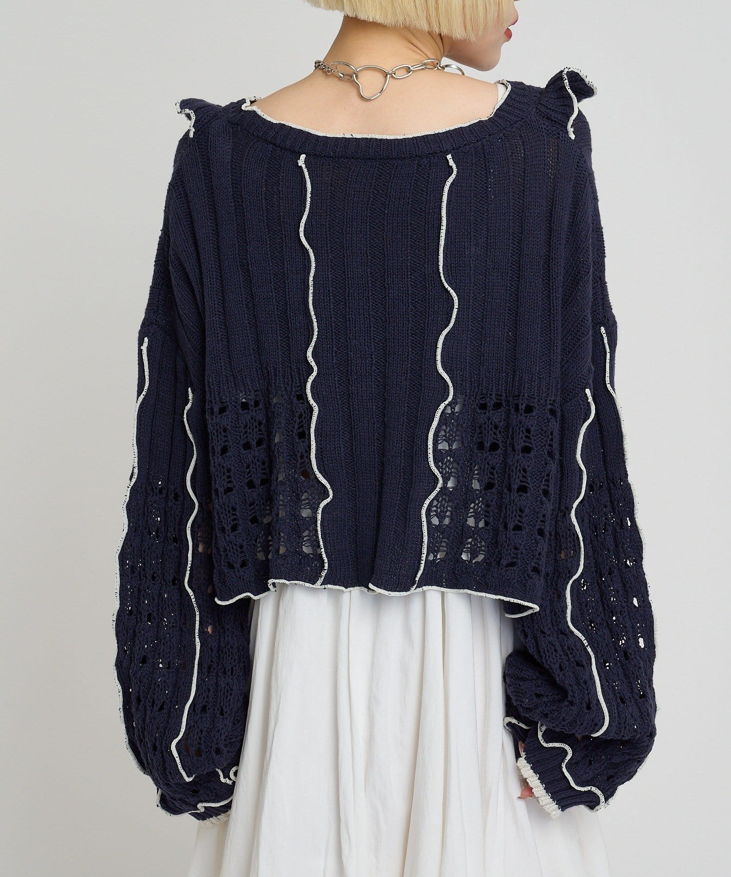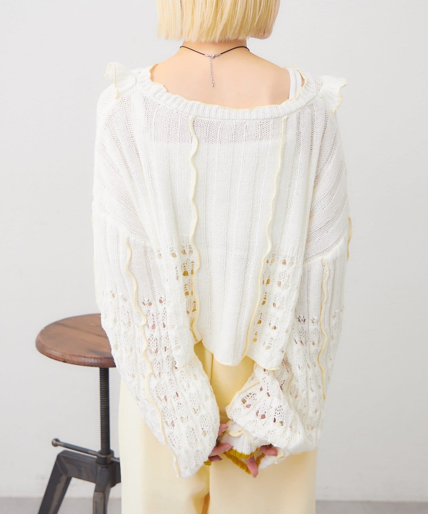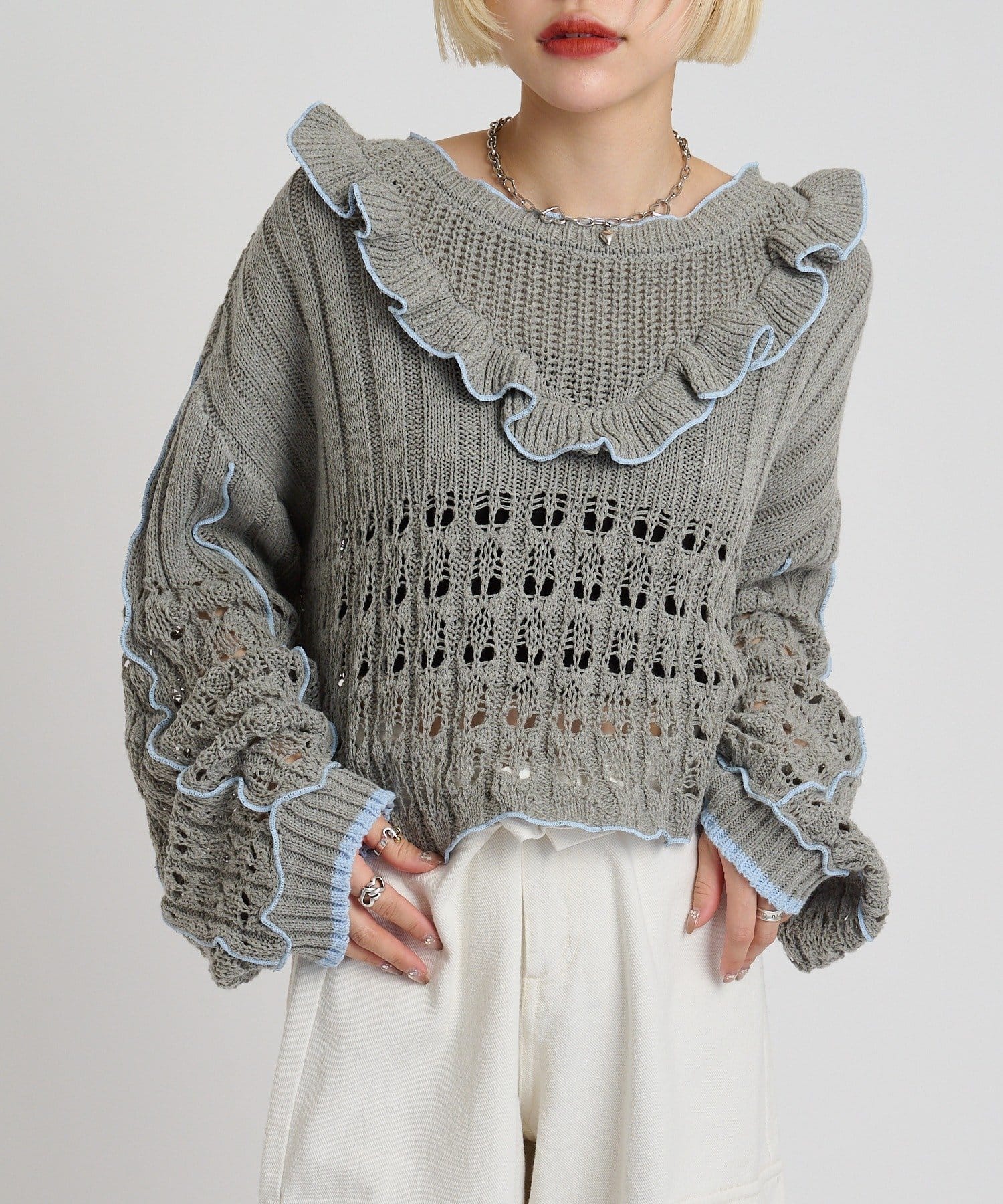 配色フリルが映える 透かし編みニットプルオーバー