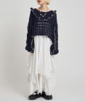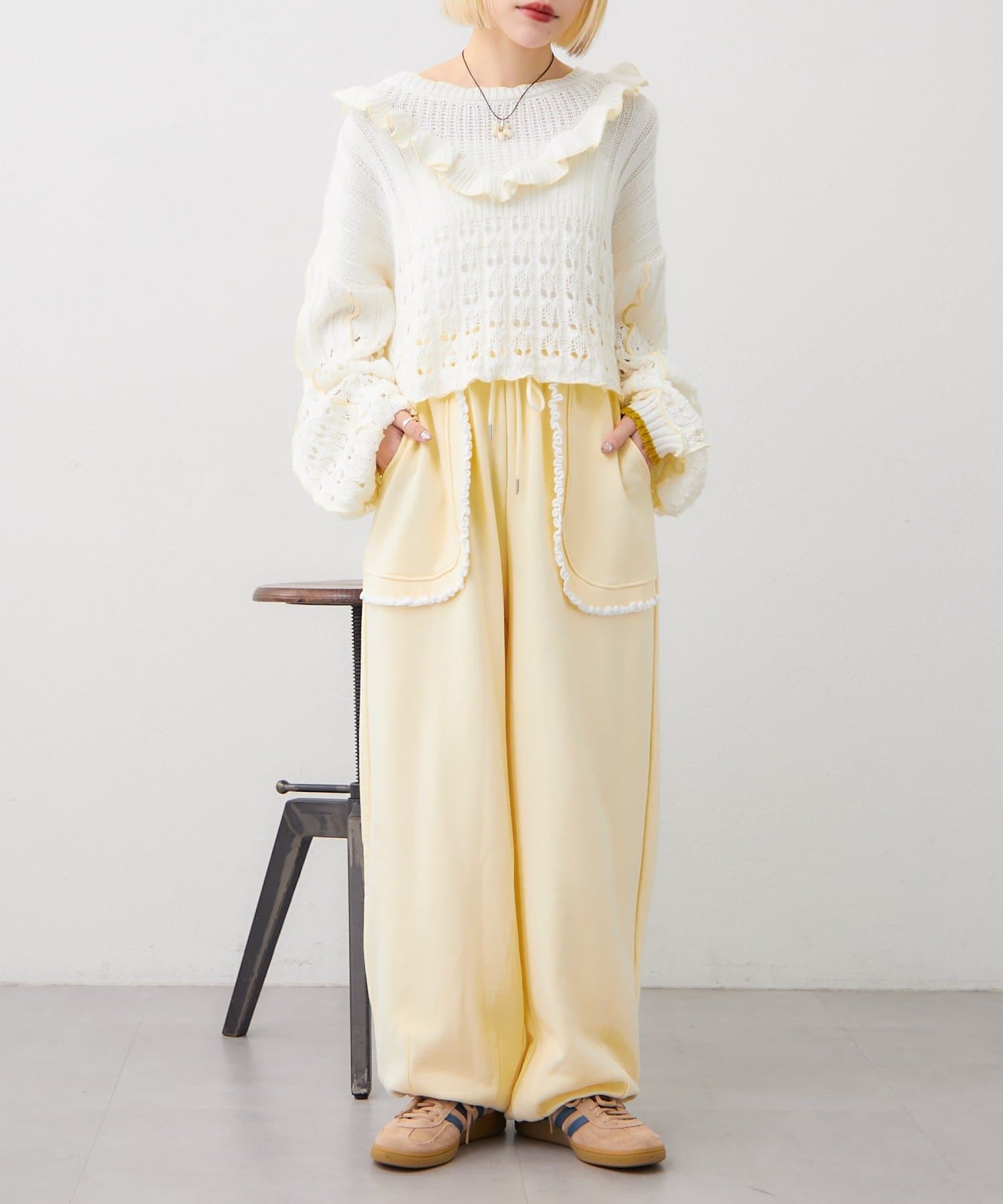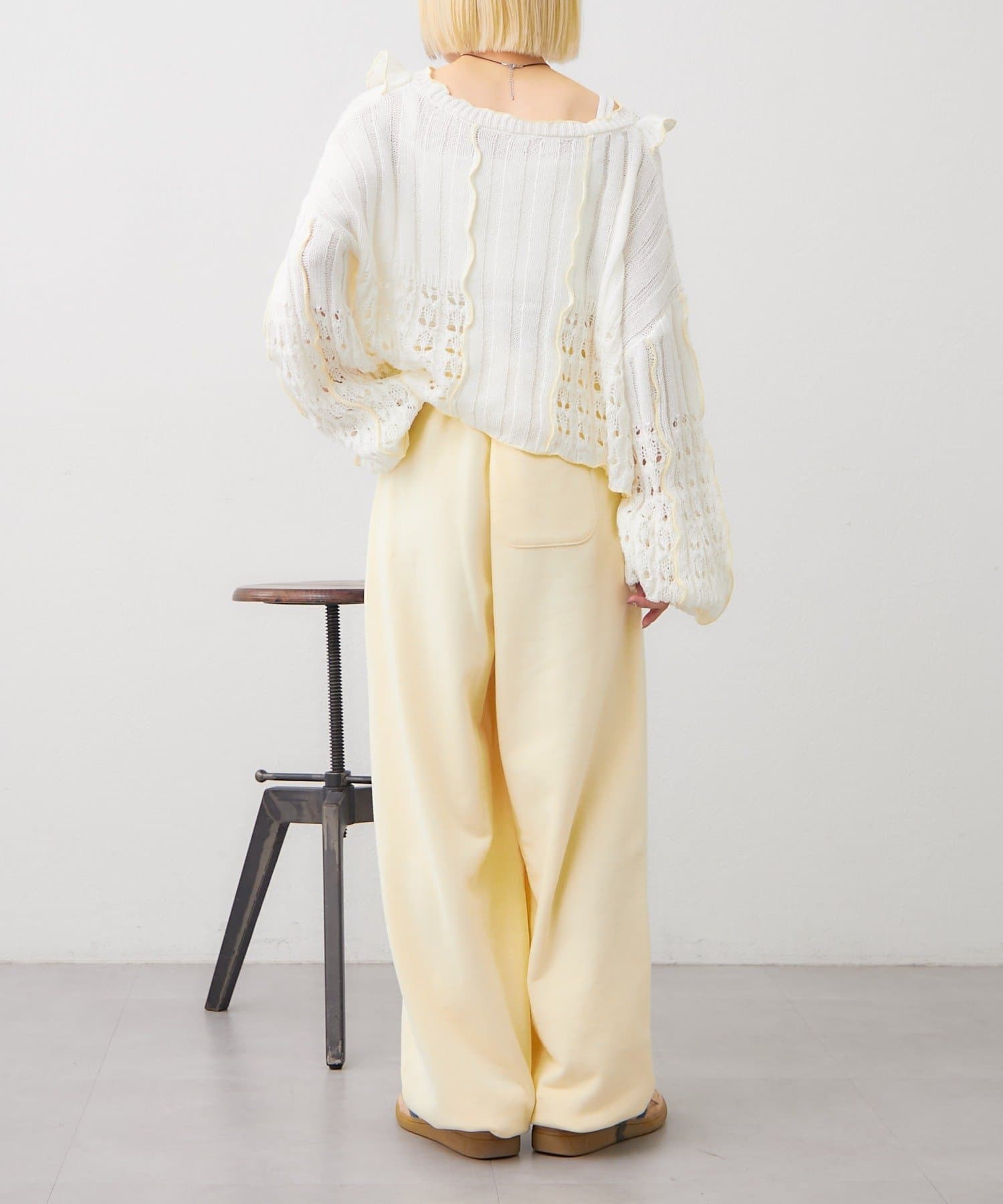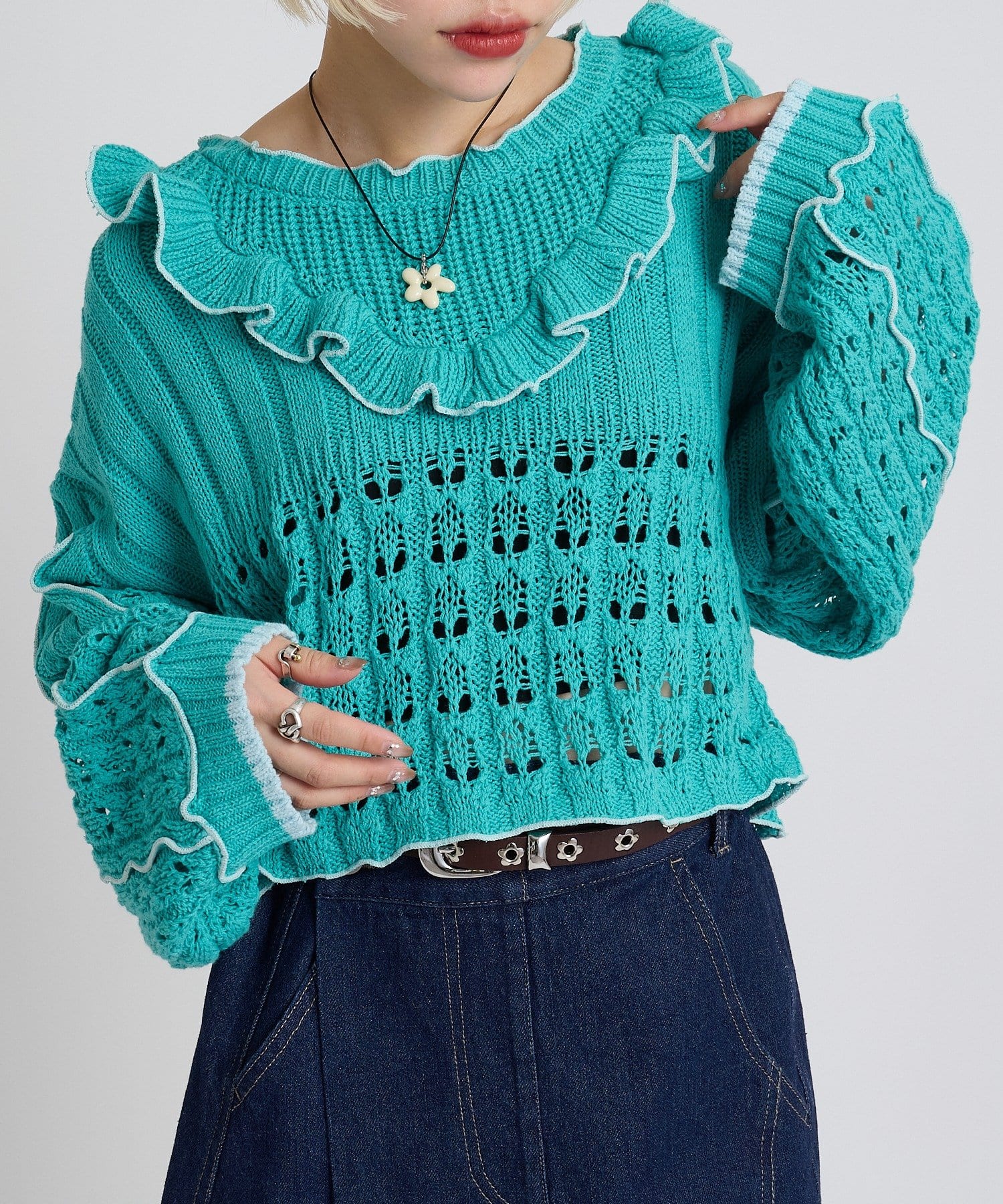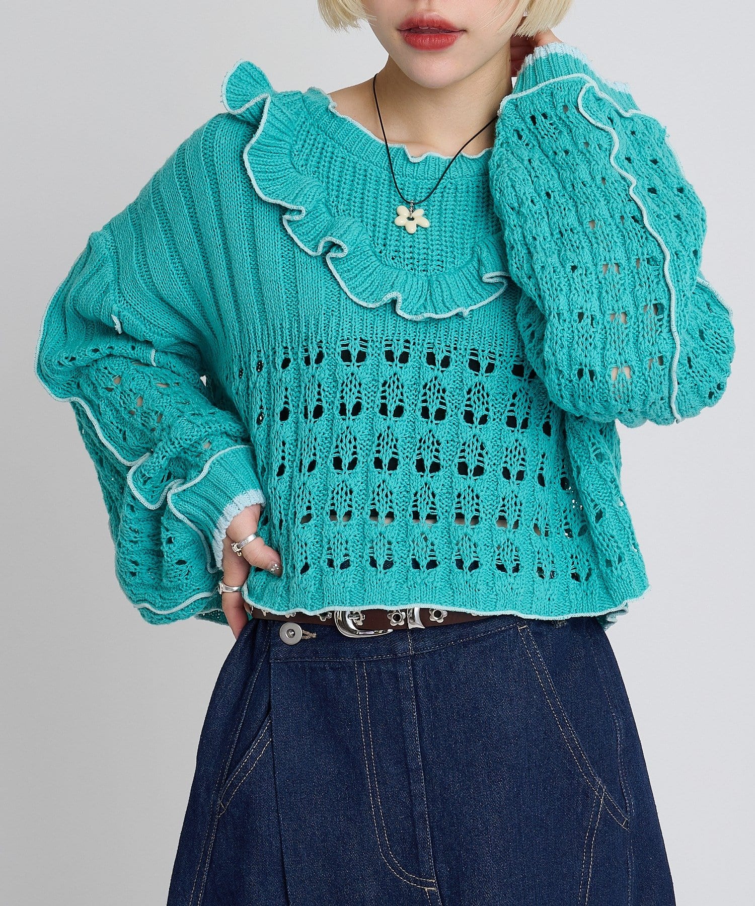 配色フリルが映える 透かし編みニットプルオーバー