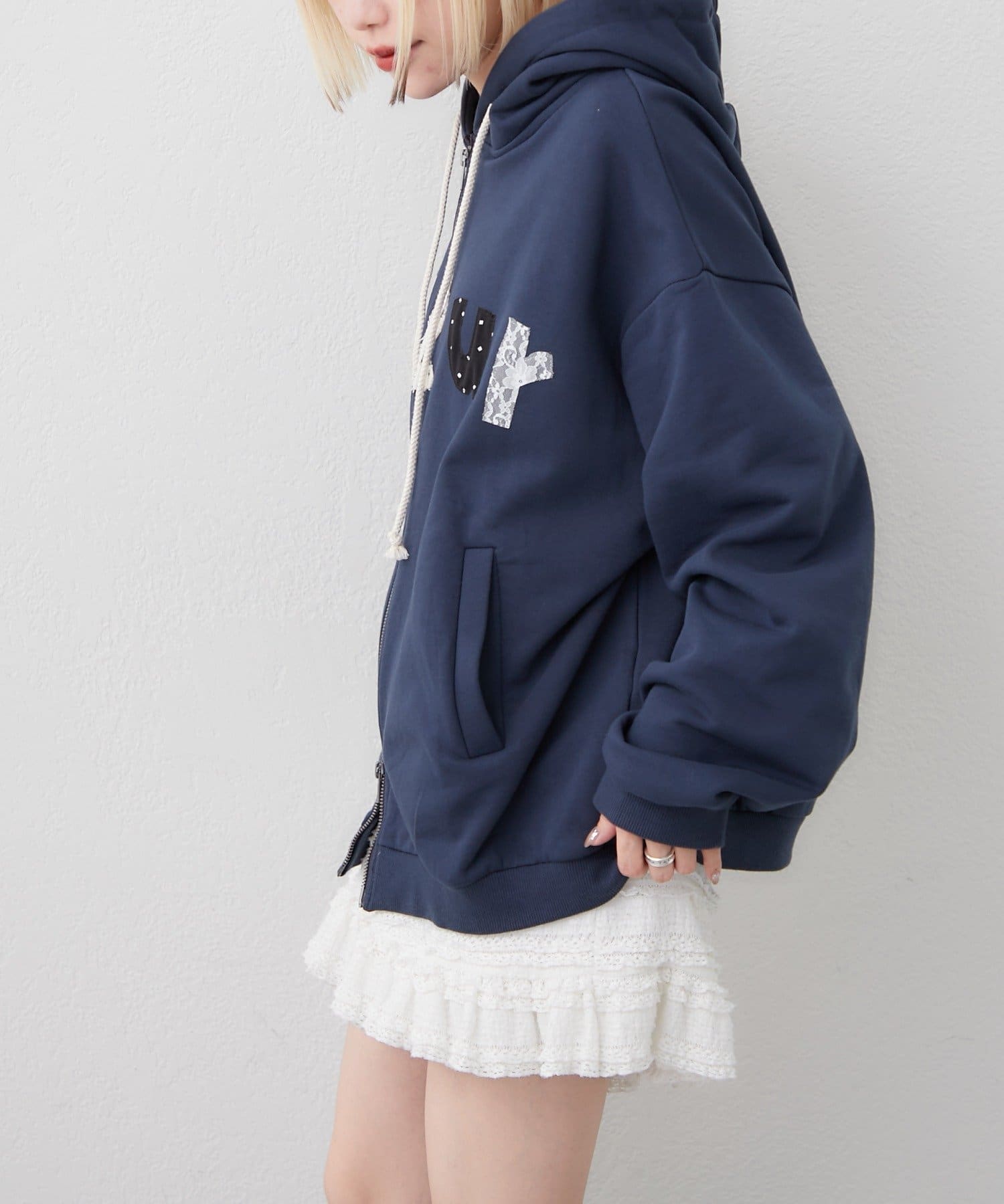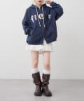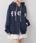 ・パッチワーク風のロゴが主役のジップパーカー