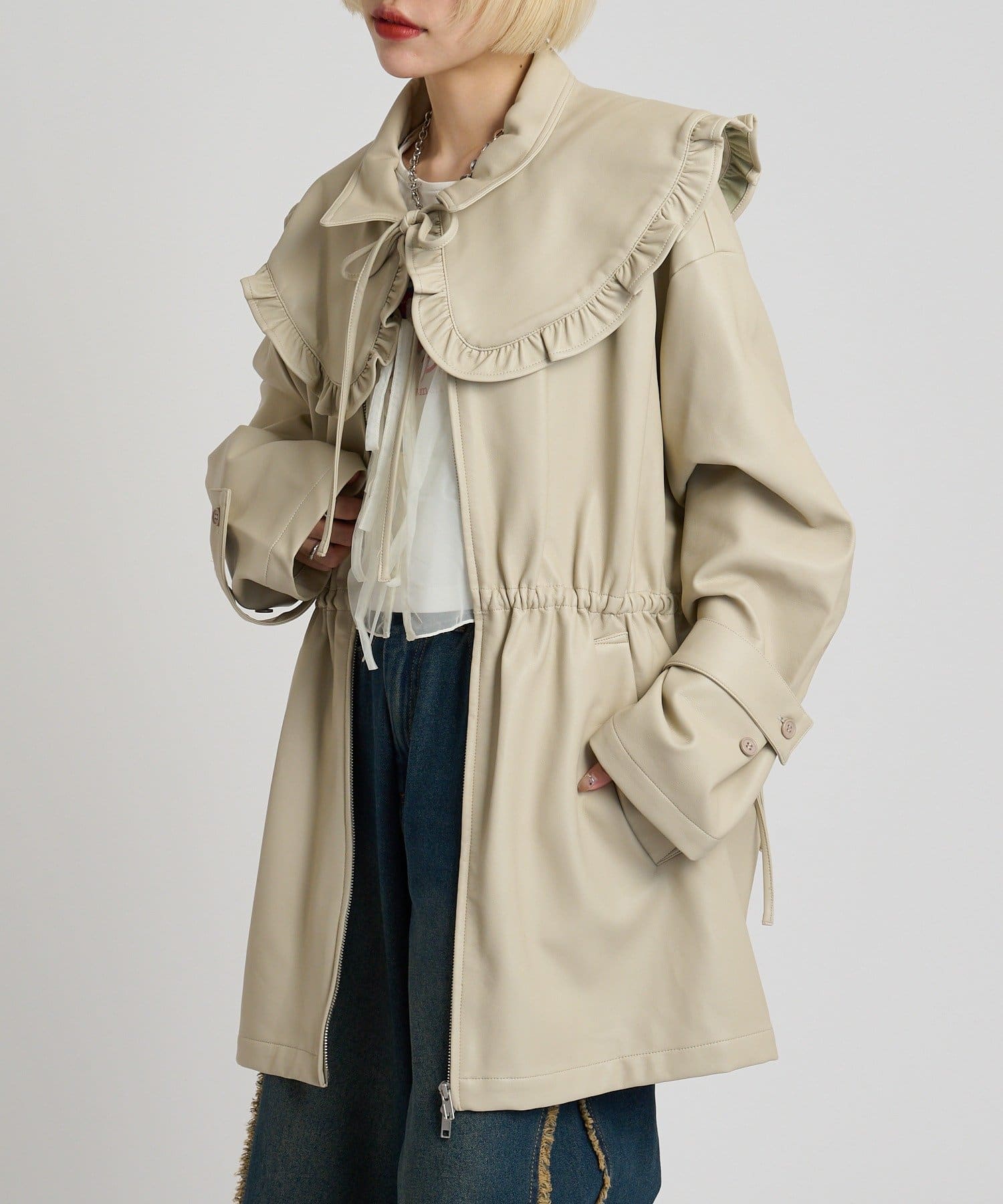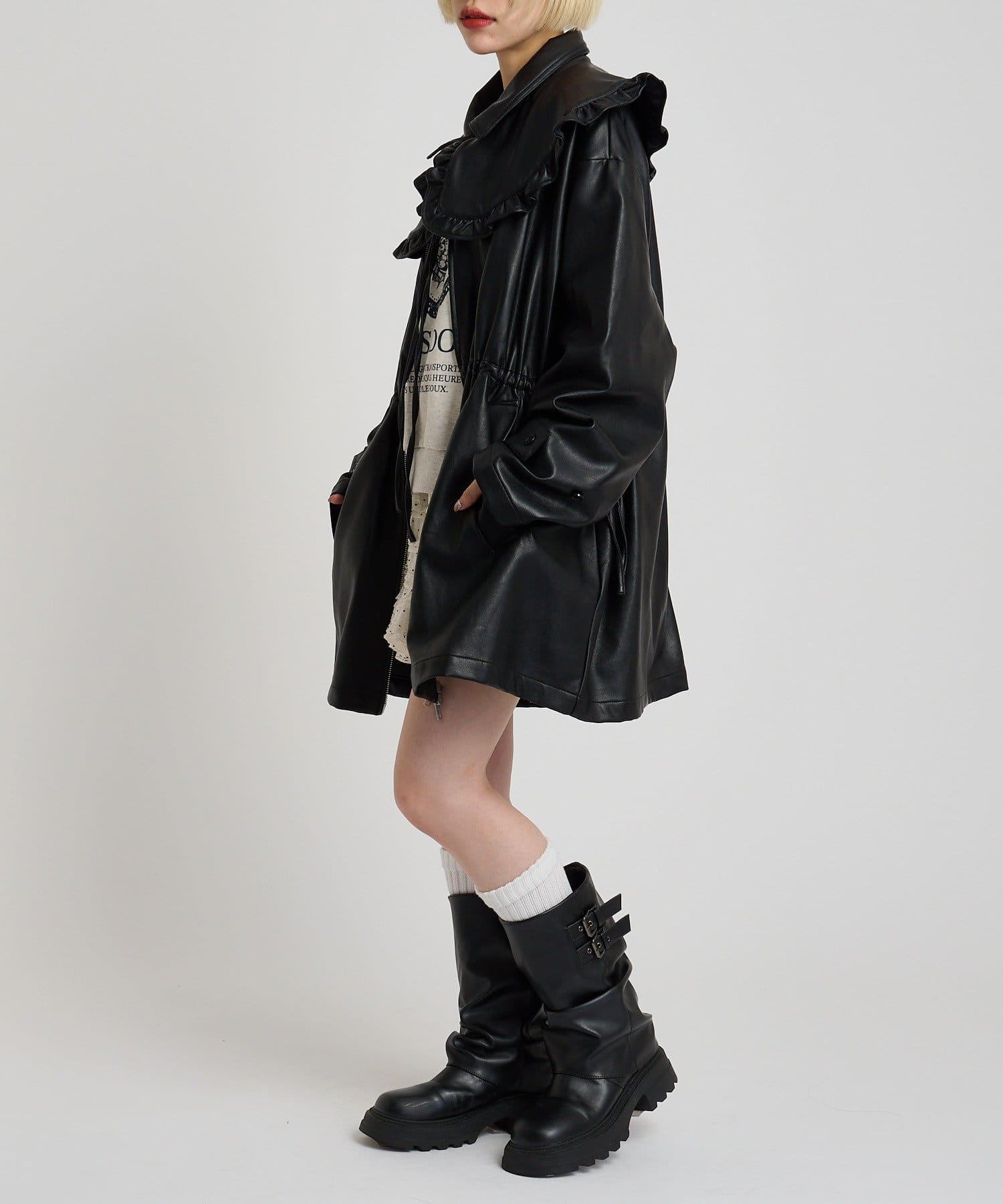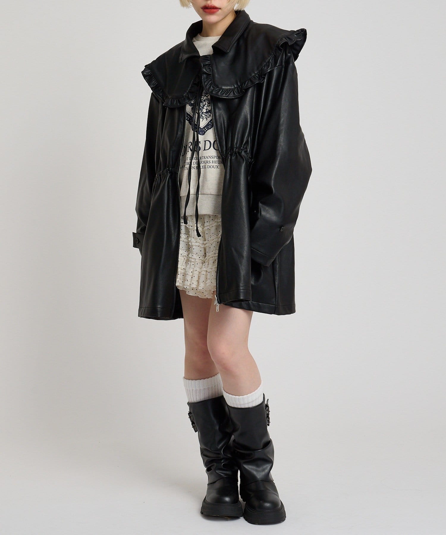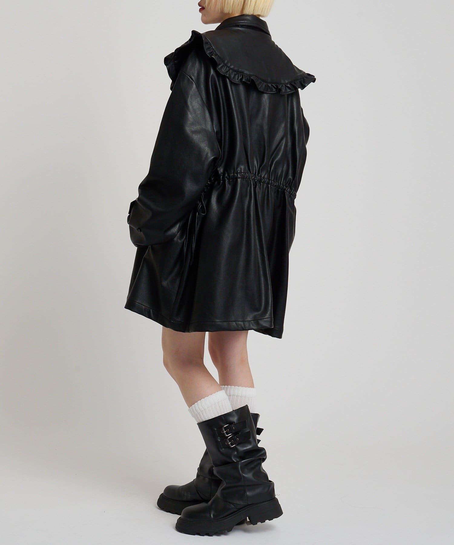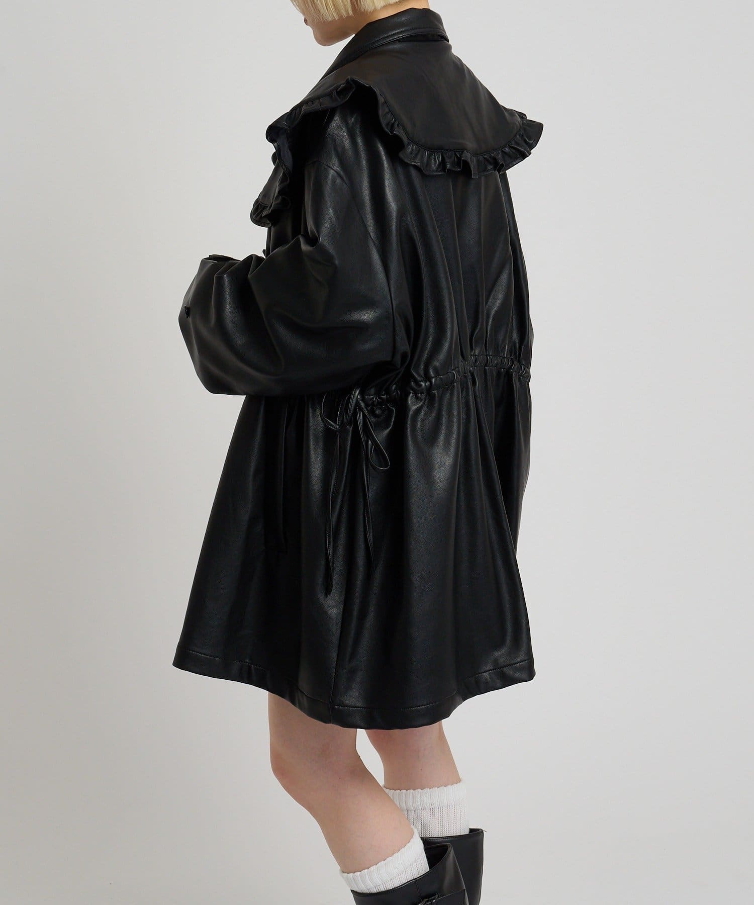 フリル衿付きPUレザージャケット