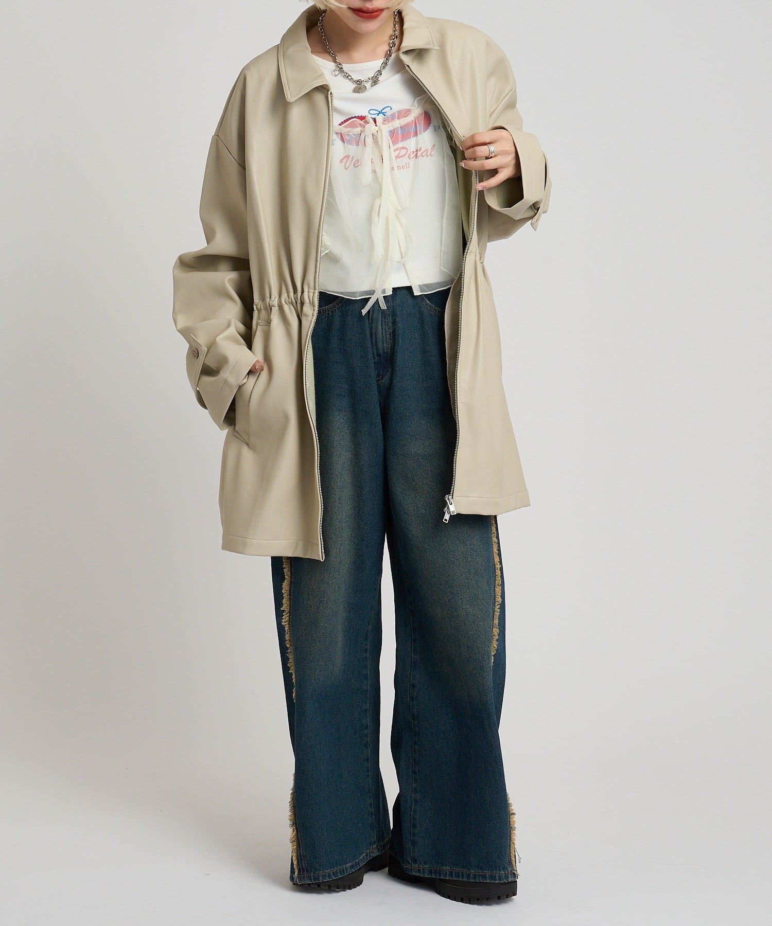 ・衿を外せばクールな印象にも。すっきりめのロングボトムとの相性も◎