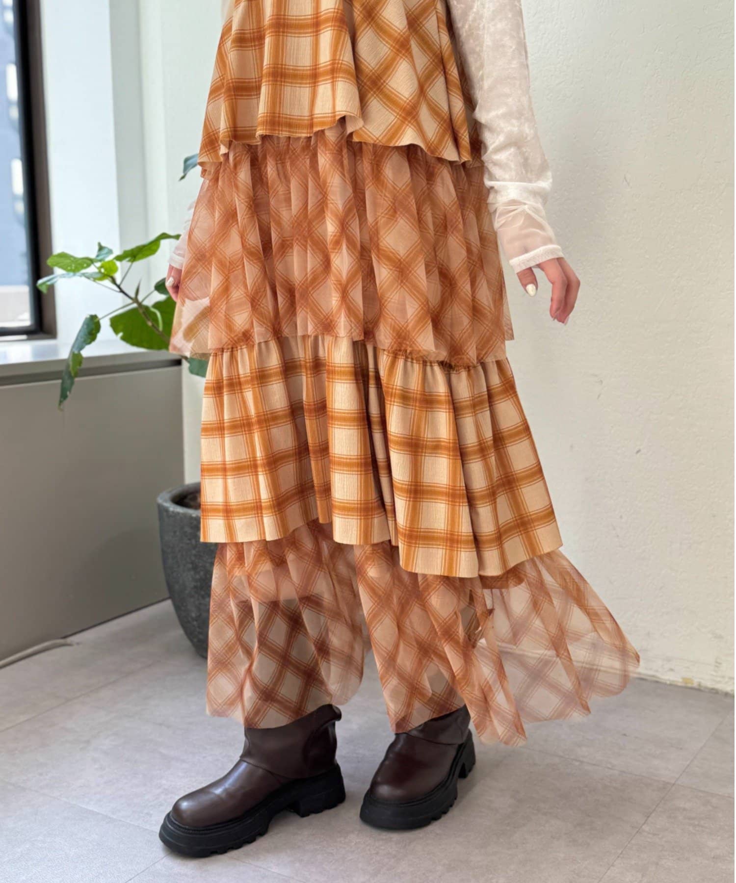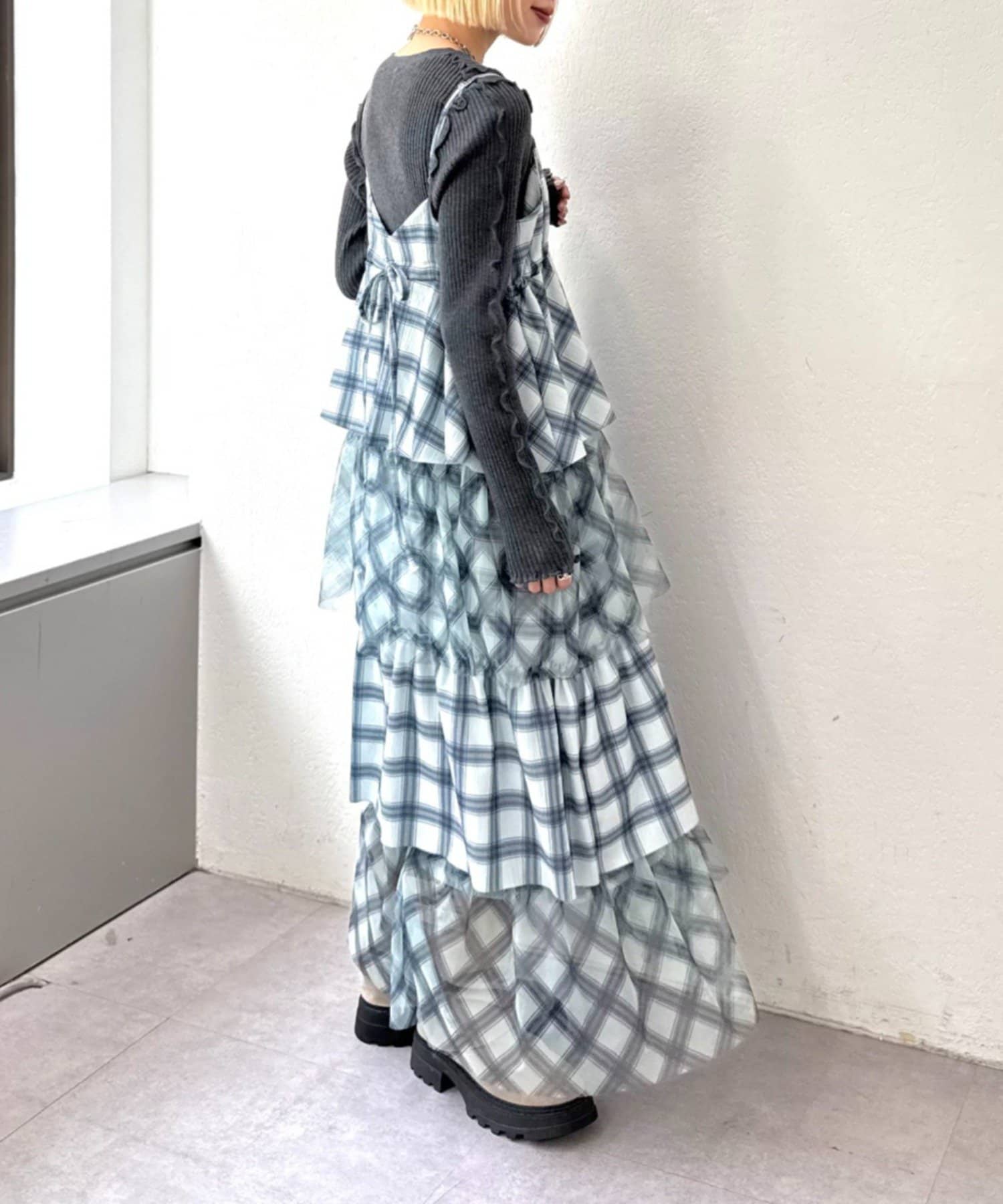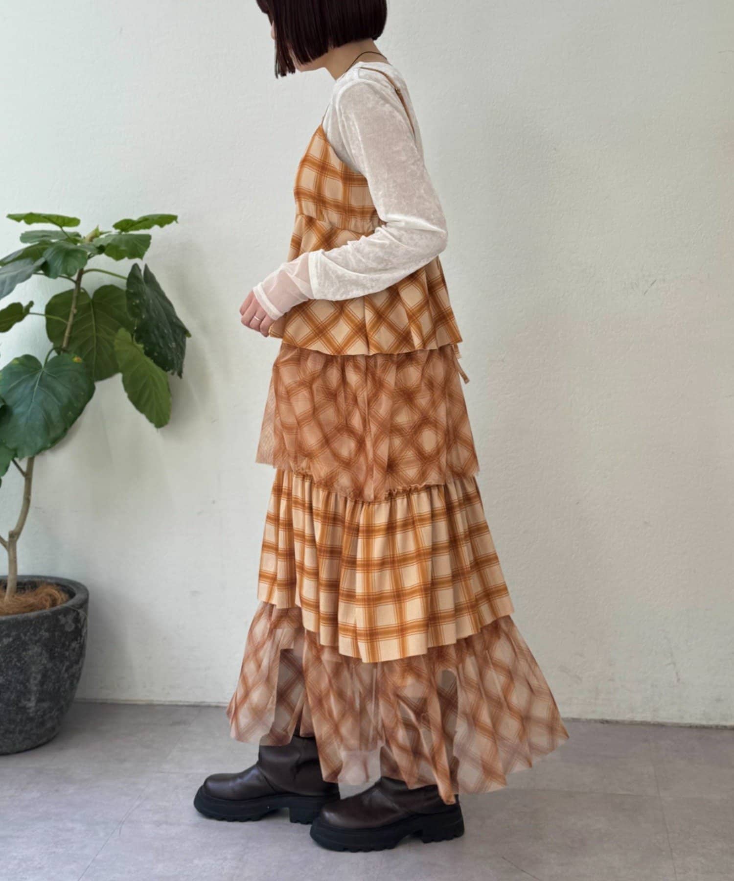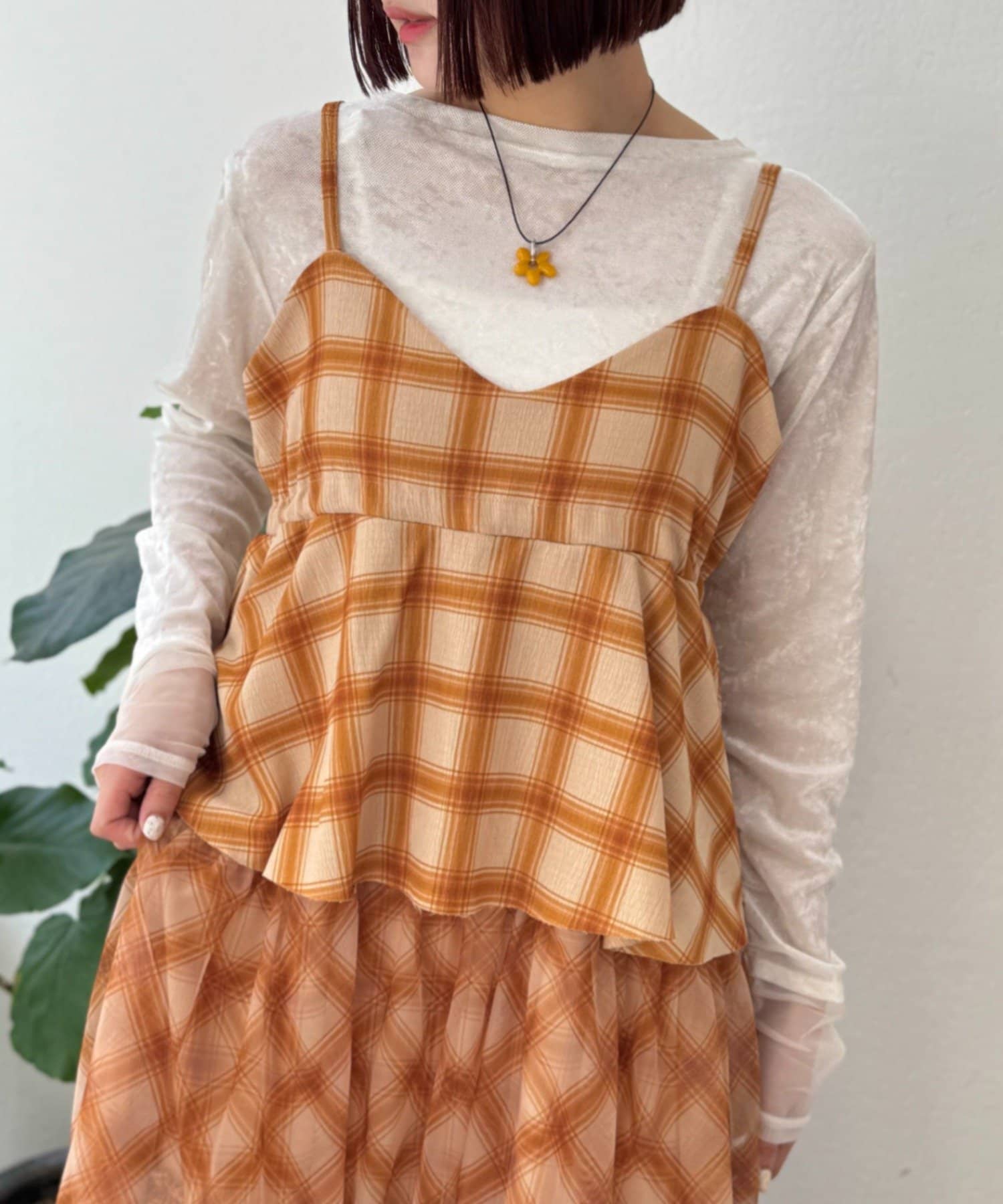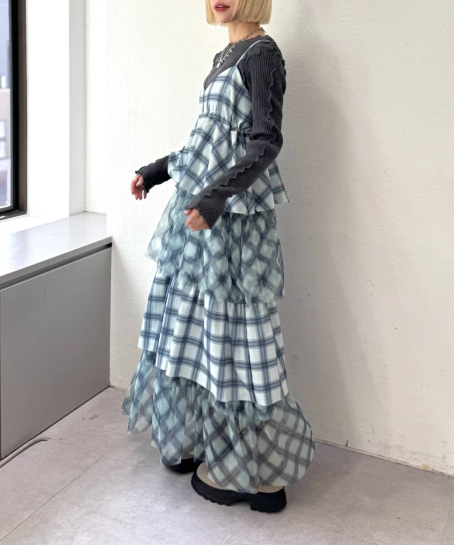 チェックを重ねて、軽やかに揺れる楊柳ティアードキャミワンピース