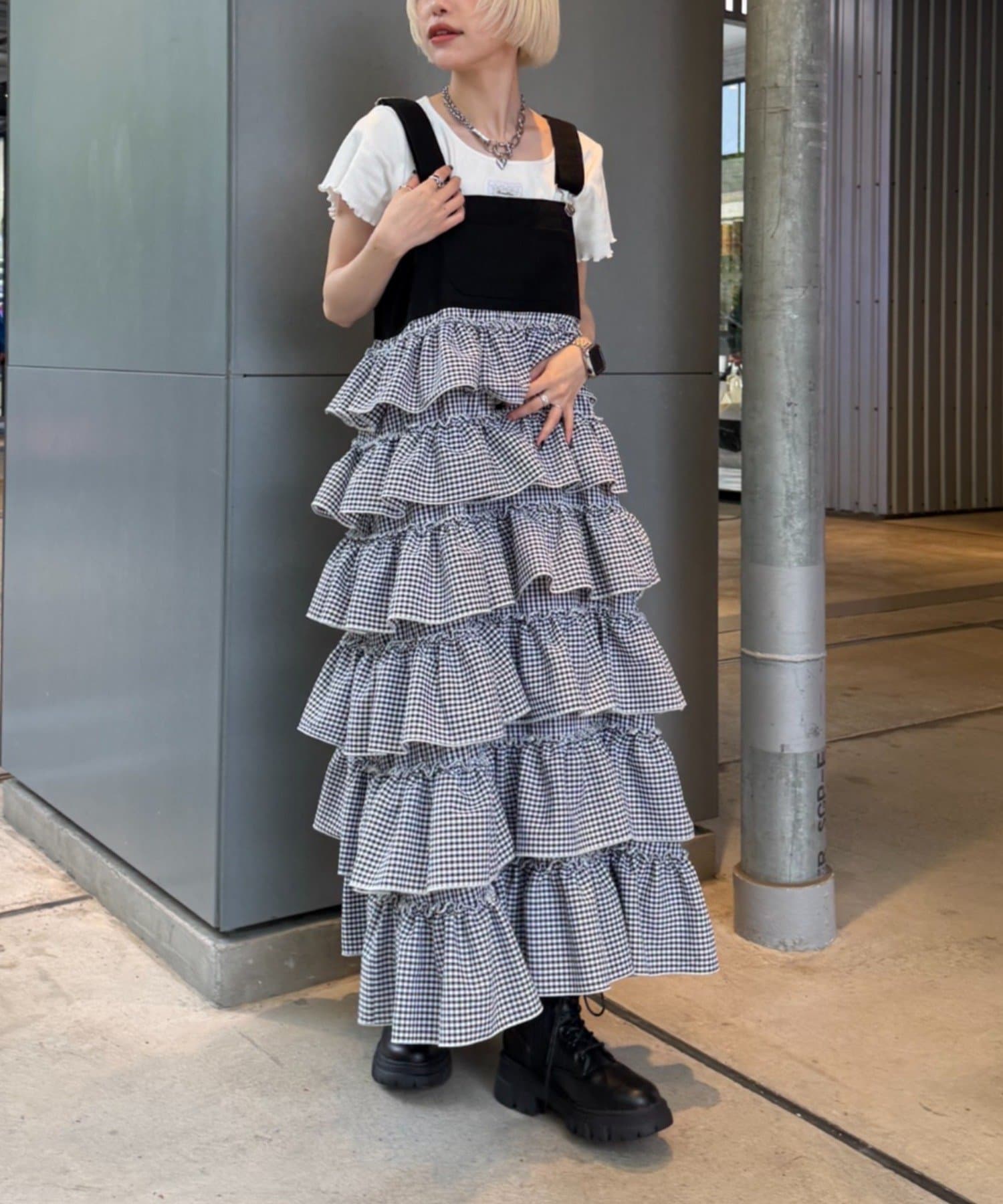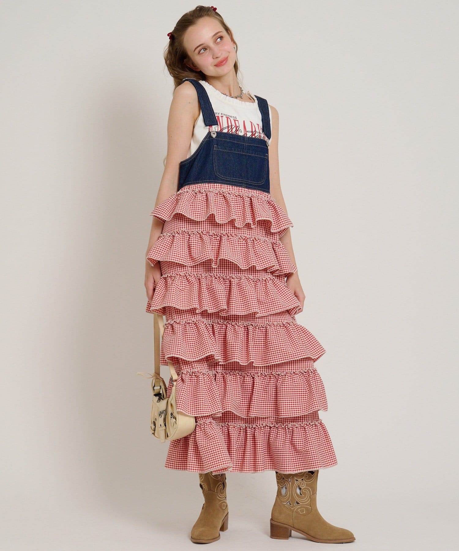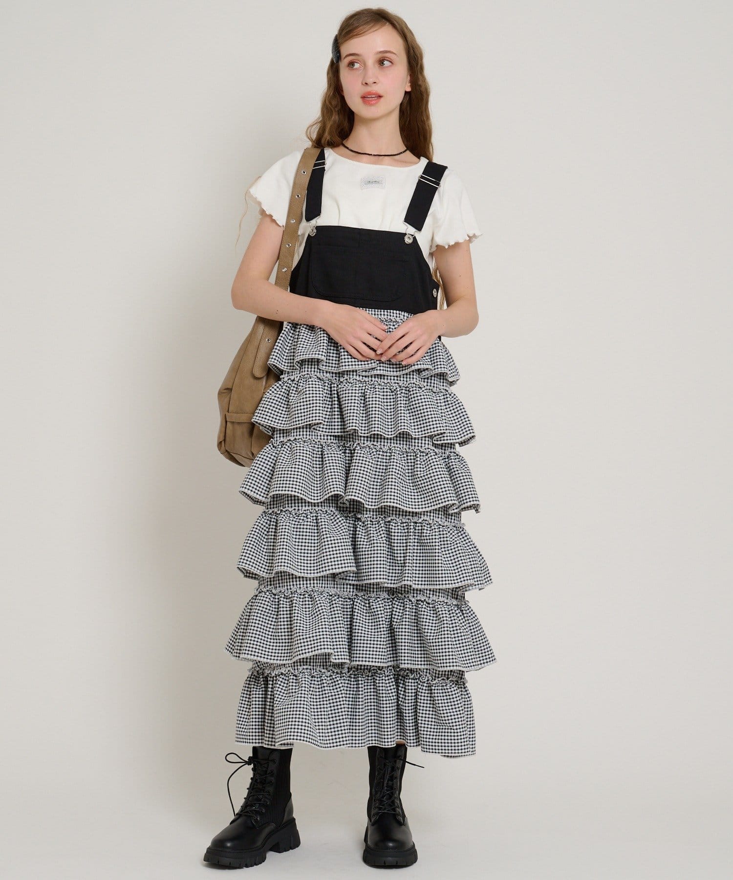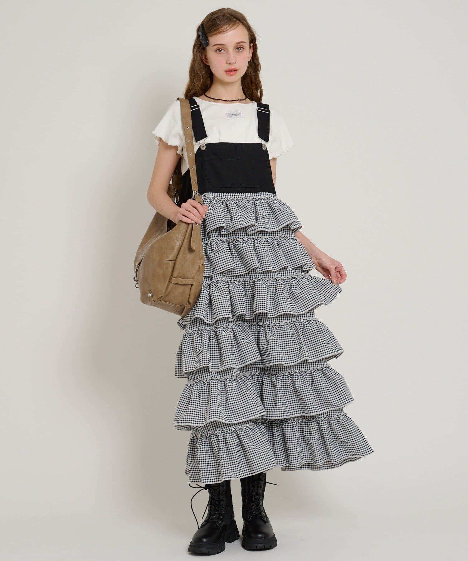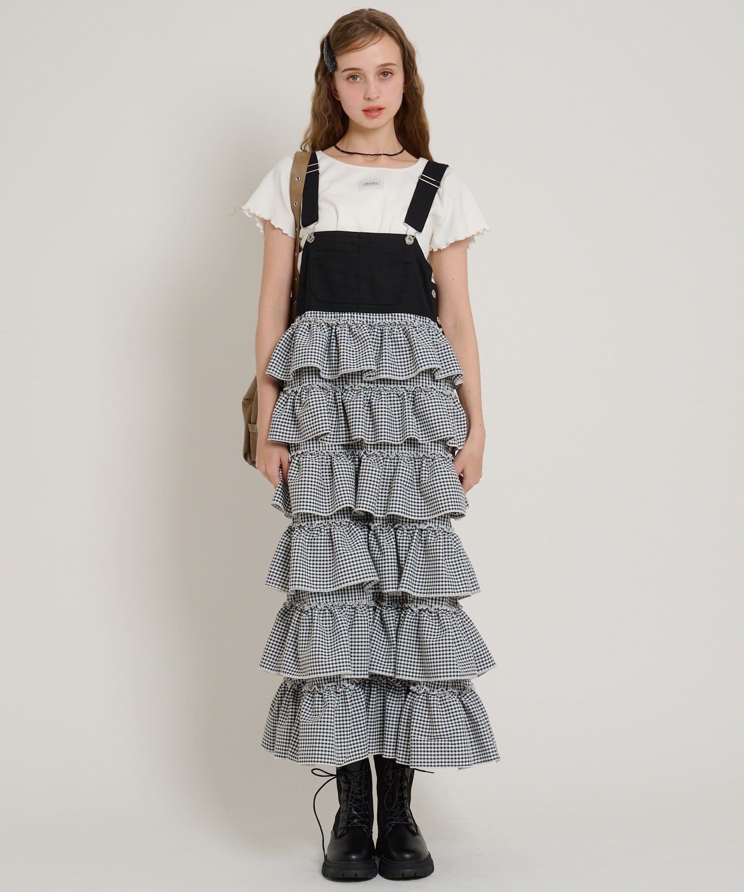 【オールシーズン使える!】【新色ギンガムチェック登場】フリルティアードジャンパースカート / レイヤードワンピース