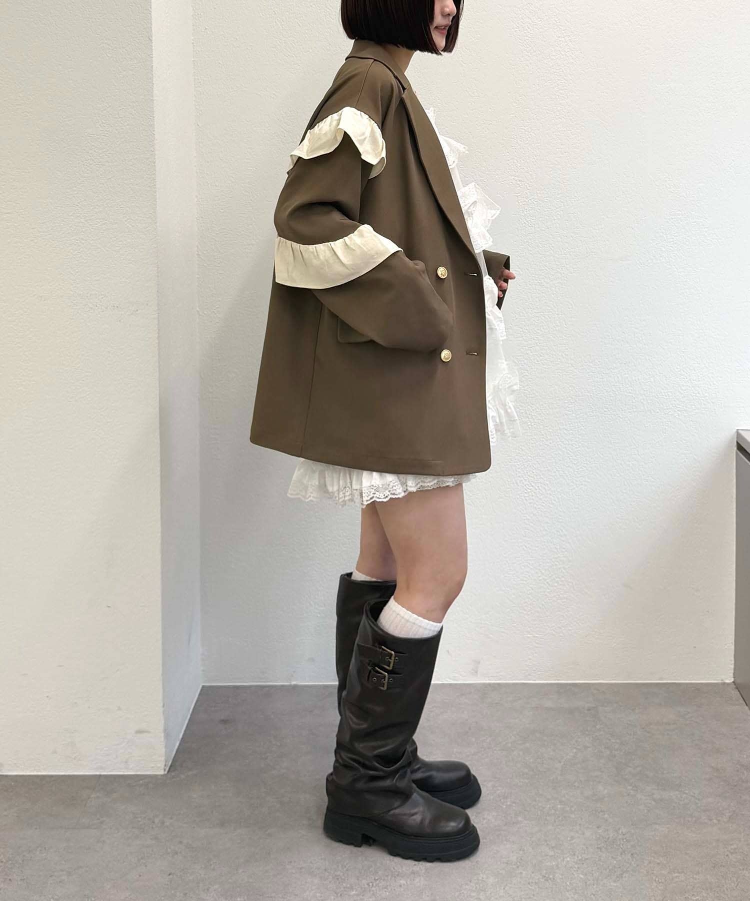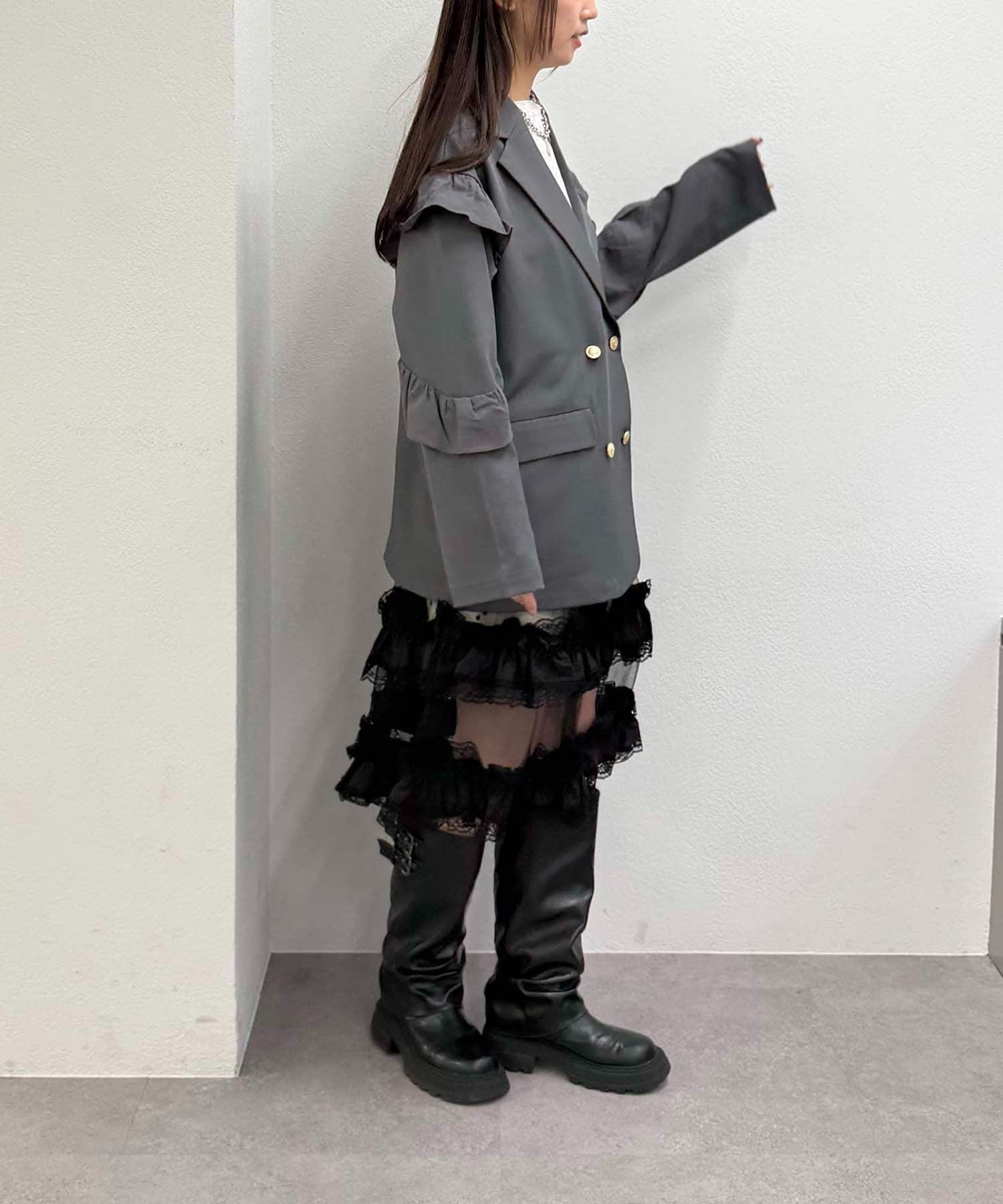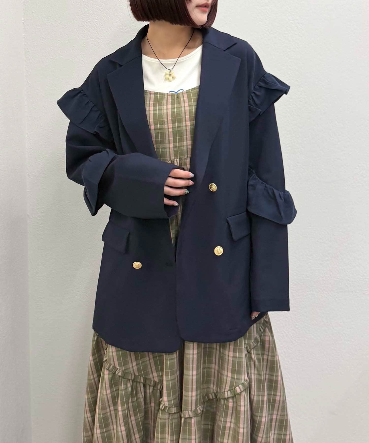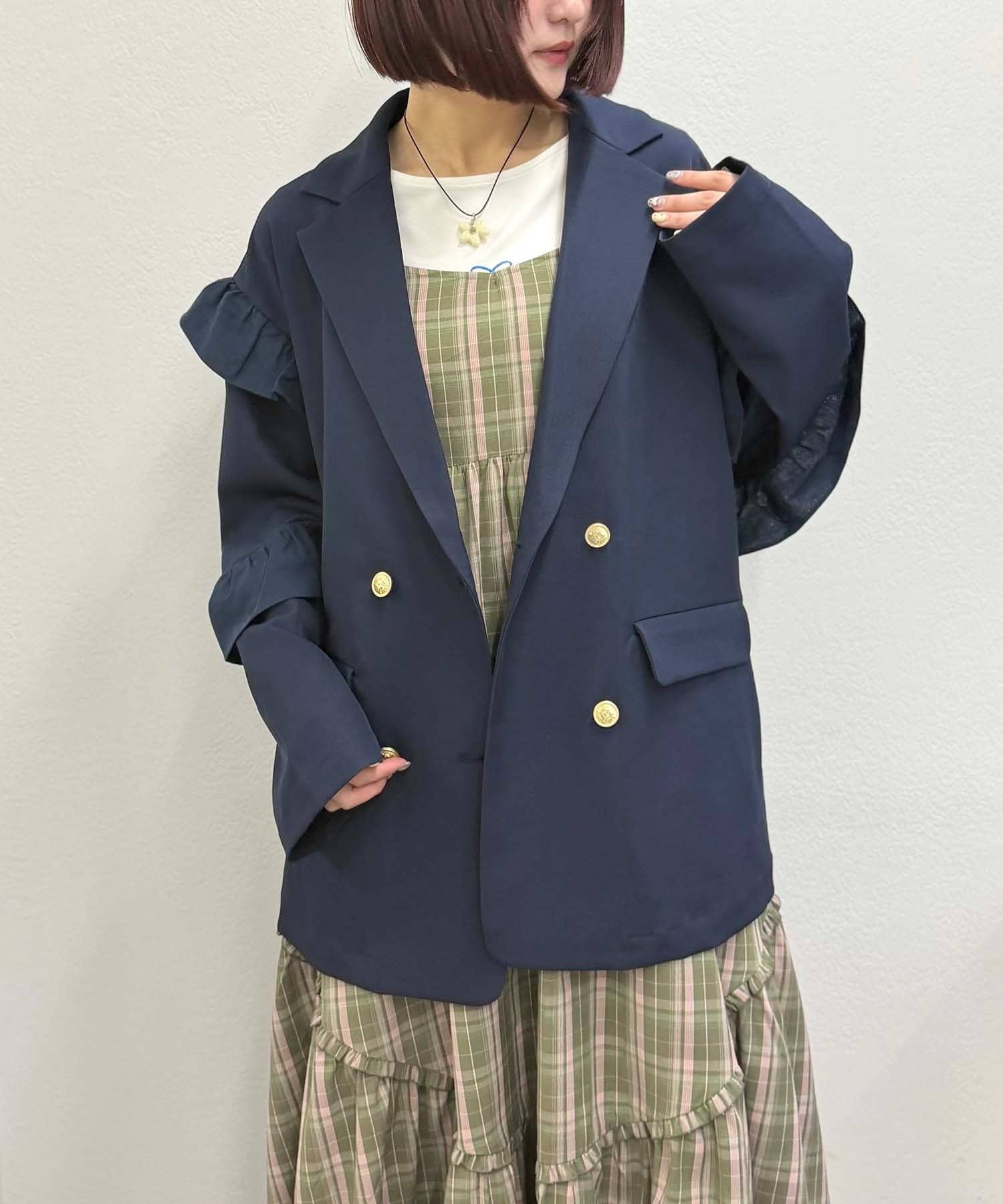 ・肩と袖に施されたフリルデザインが、ジャケットに立体感と華やかさをプラス!