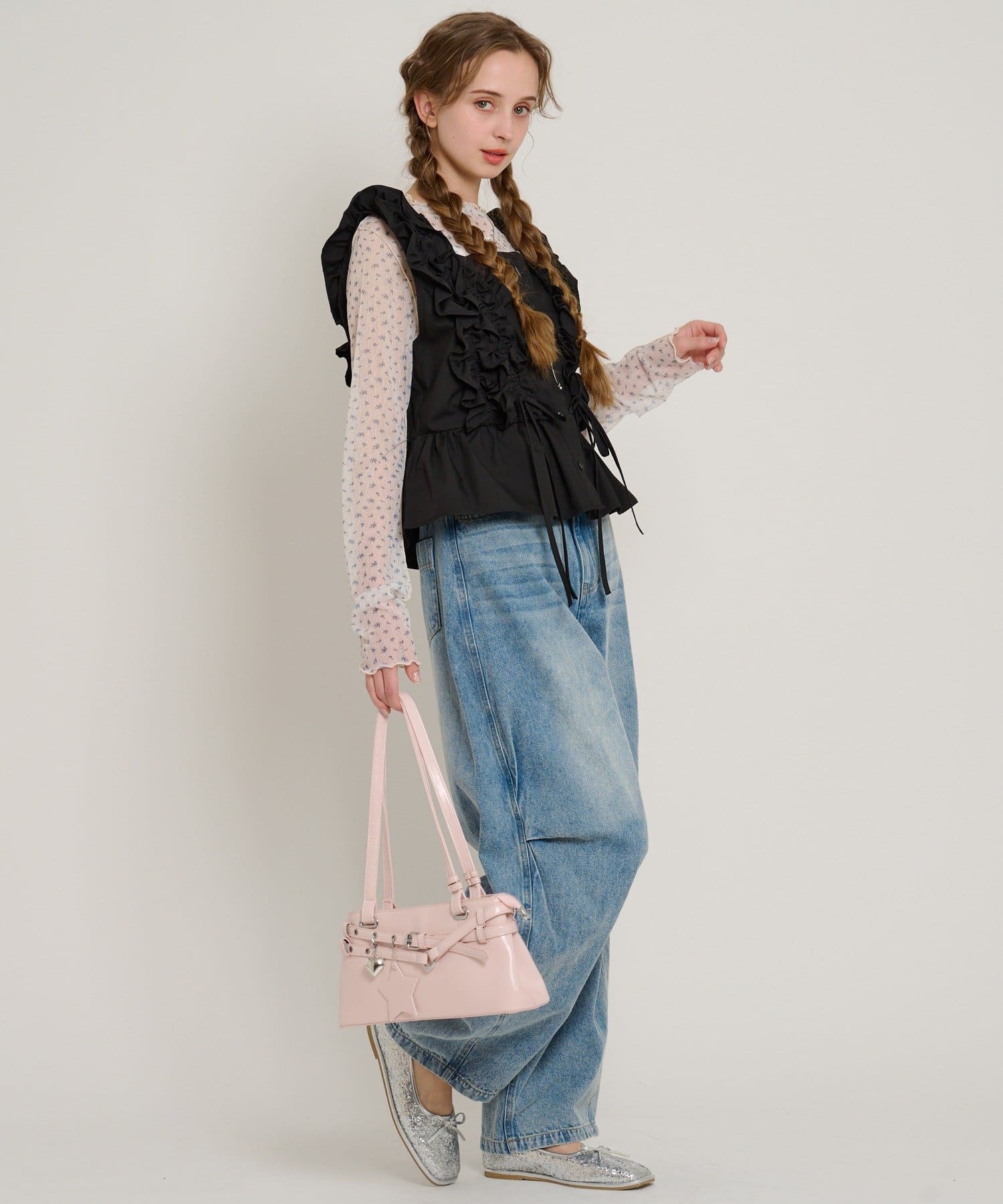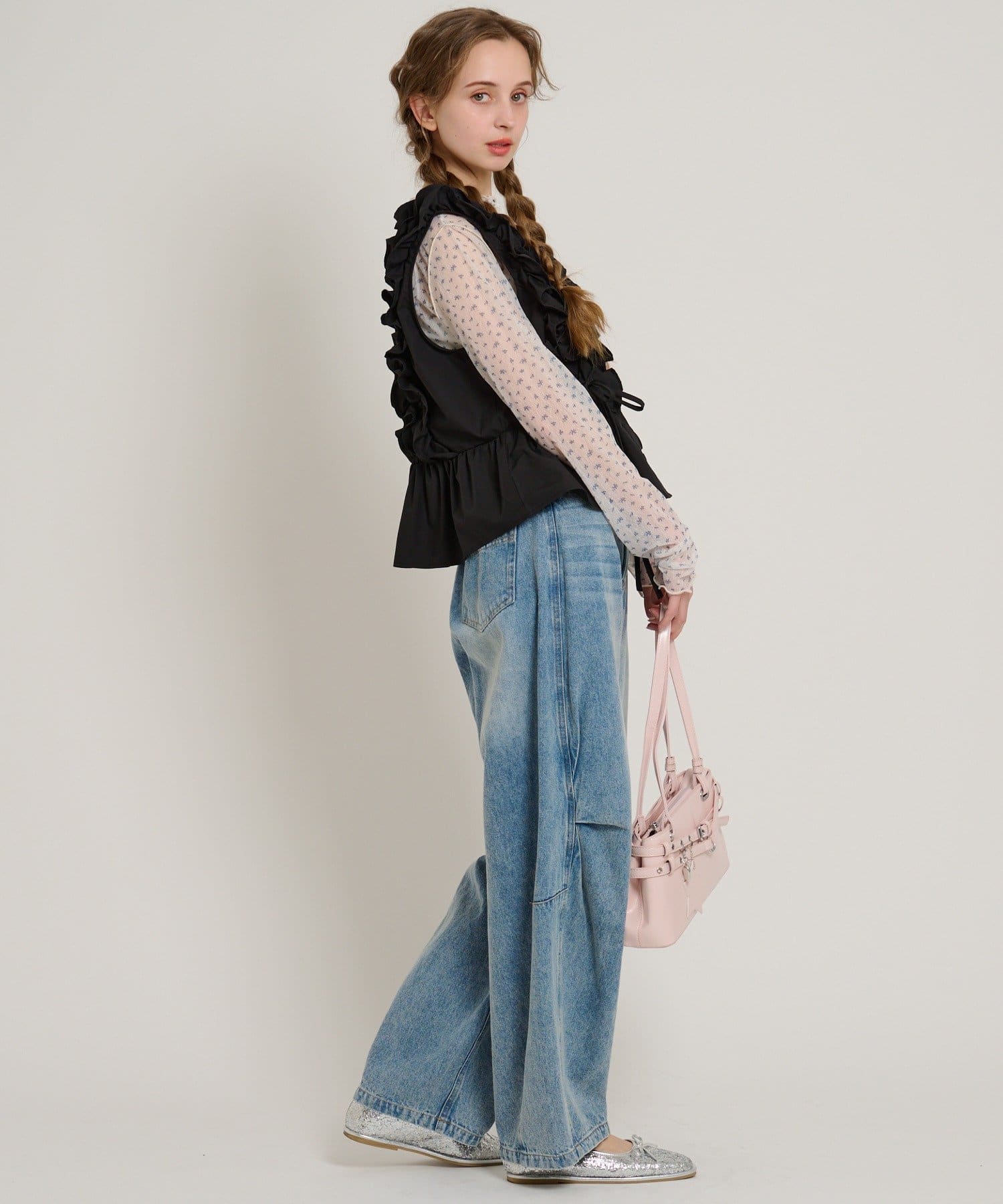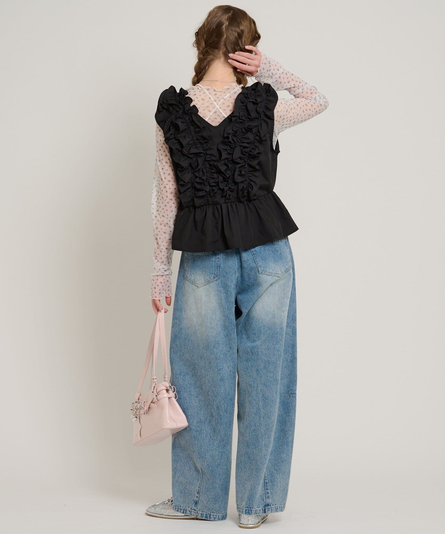 ・立体感のあるフロントのフリルデザインが目を惹くノースリーブブラウス