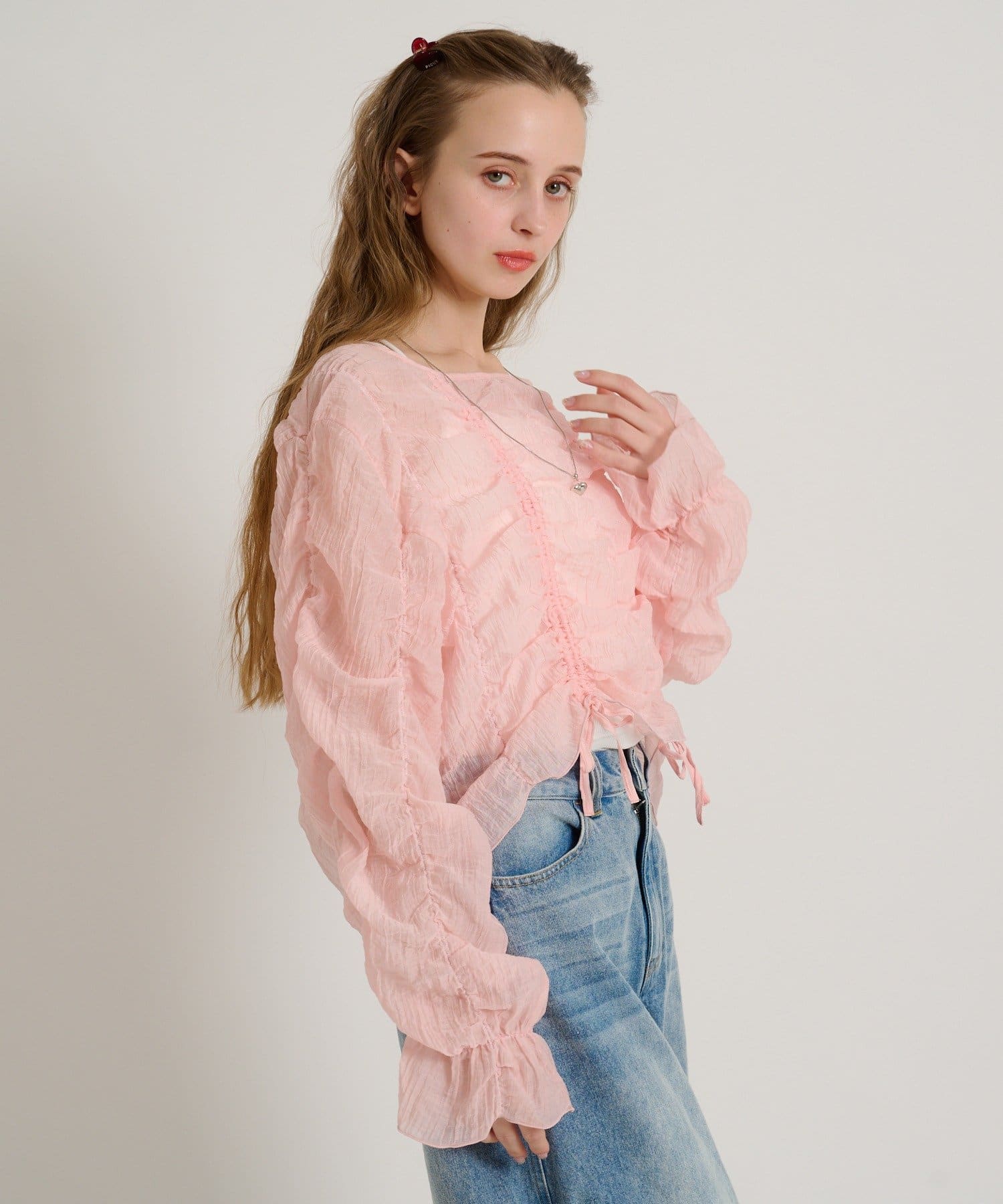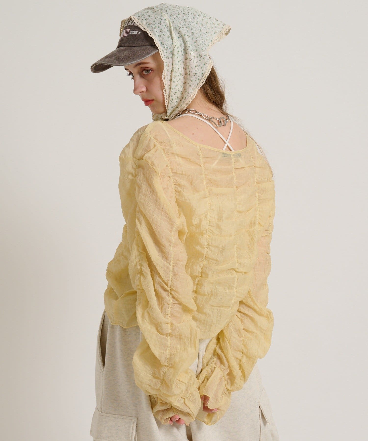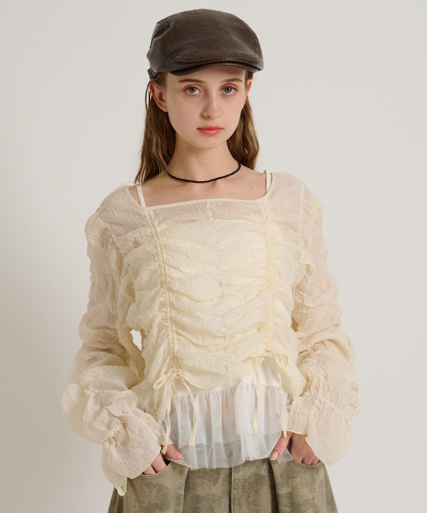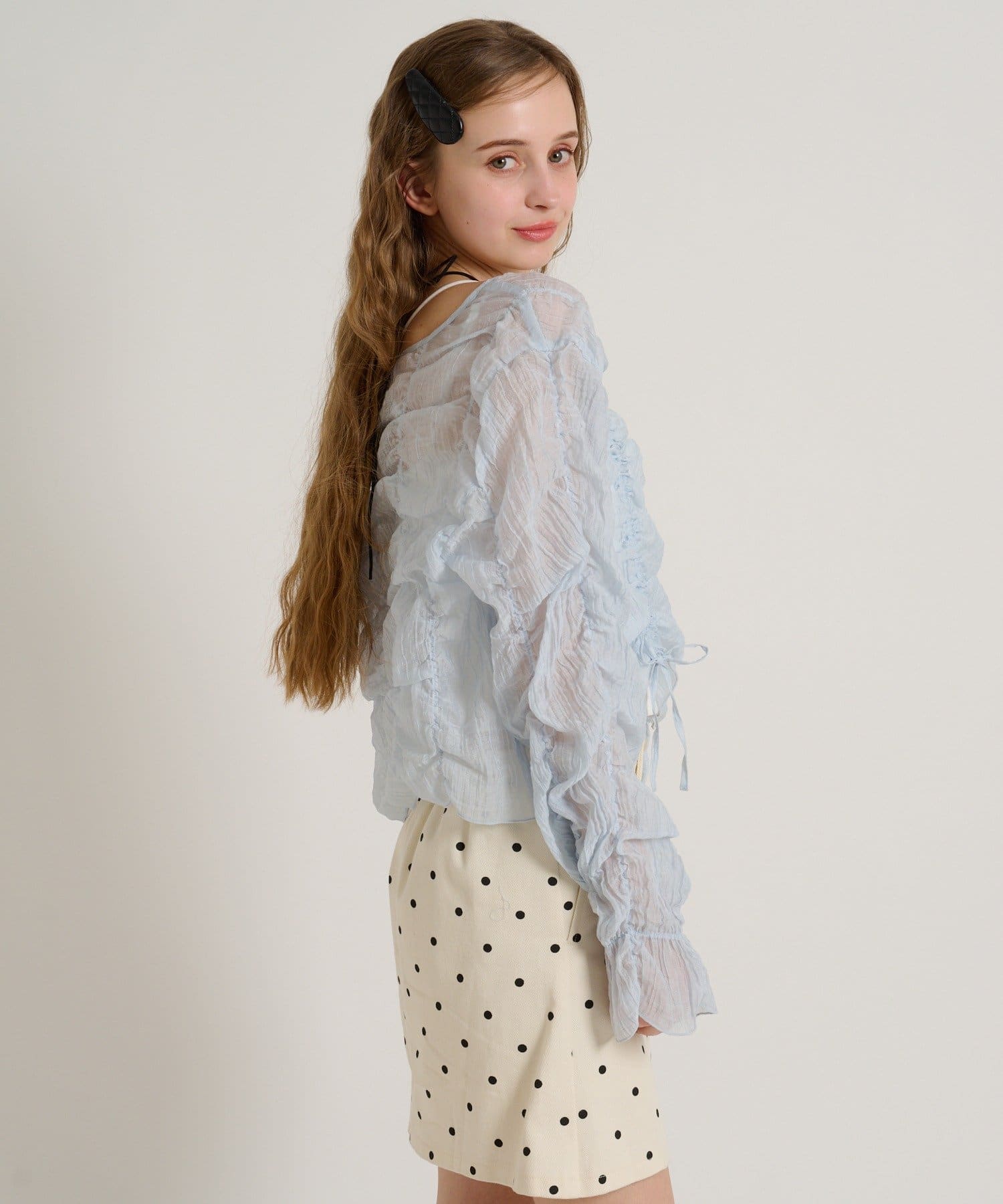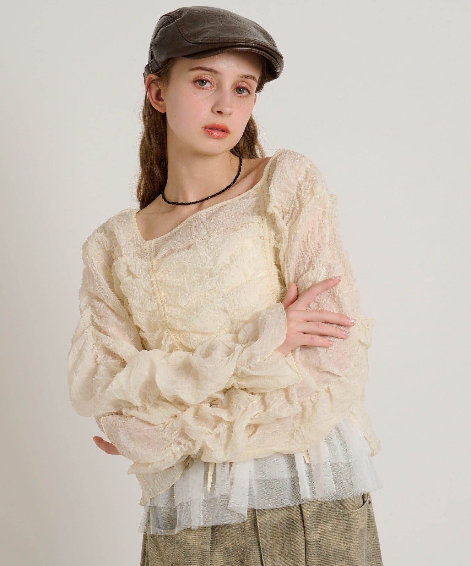 ・透け感のある生地とホイップのようにたっぷり入ったギャザーで着やせ効果も◎