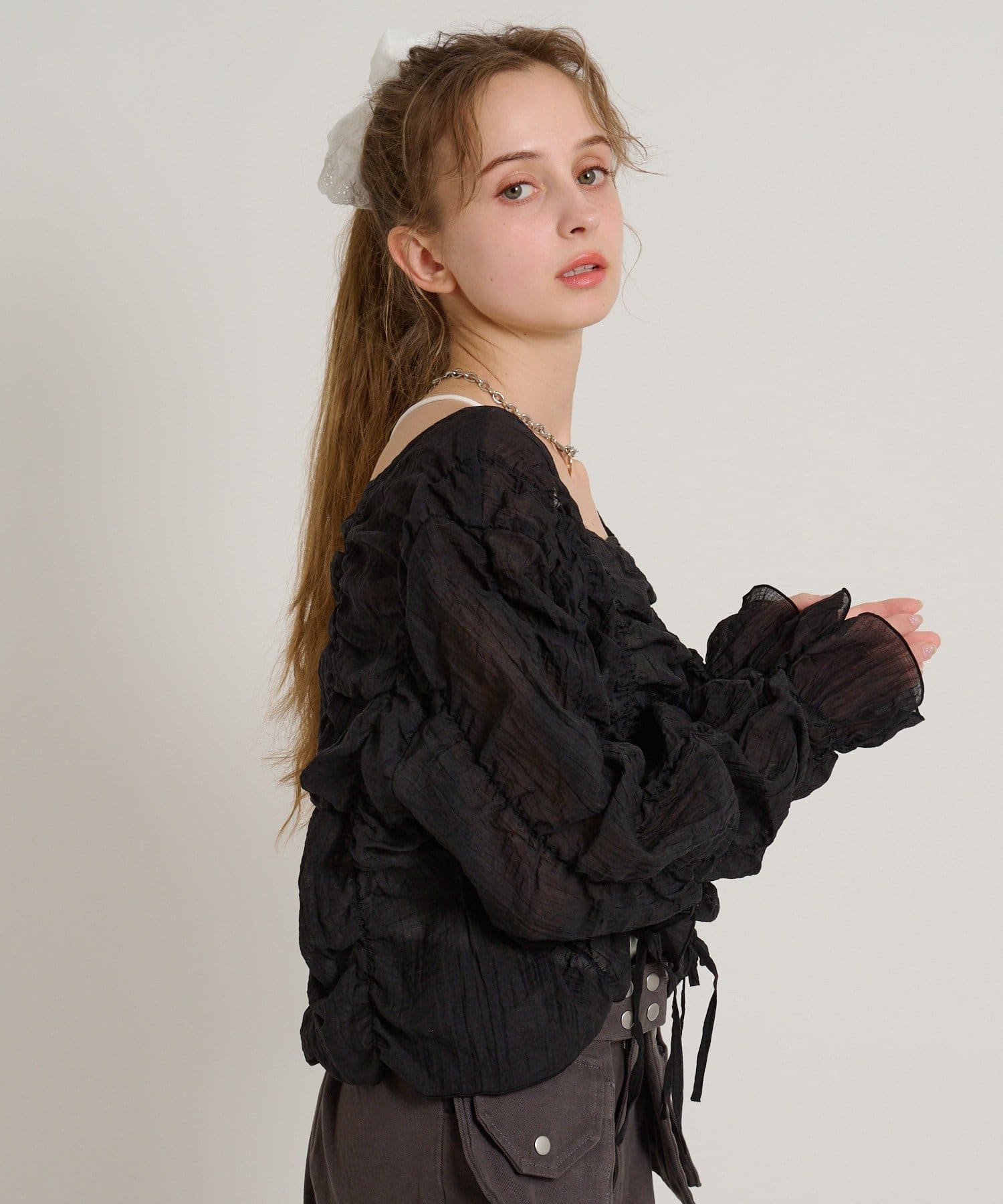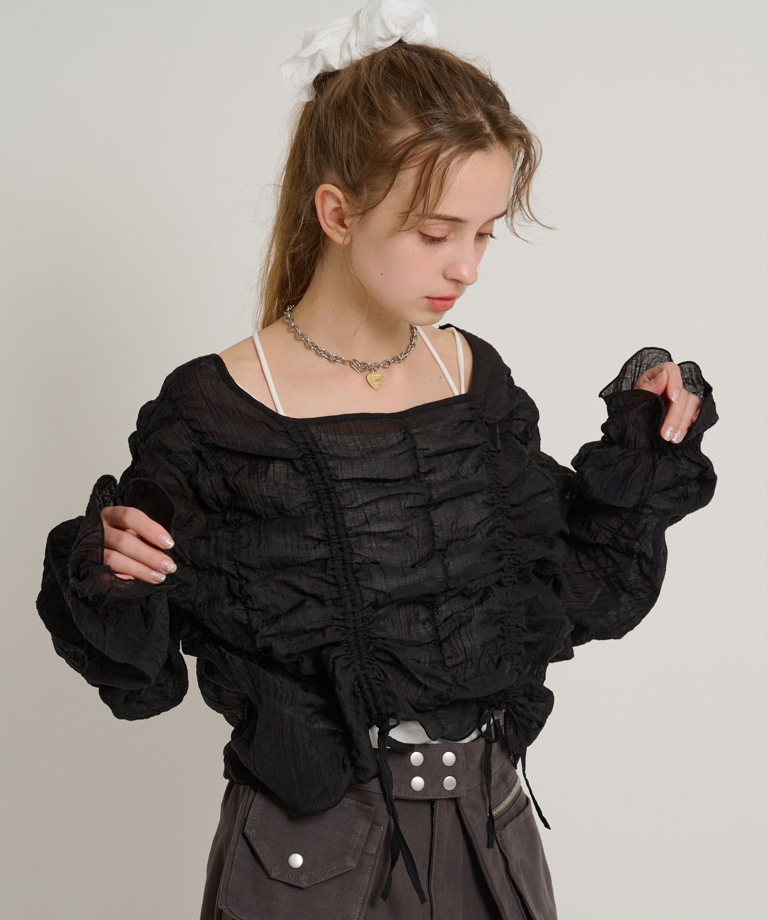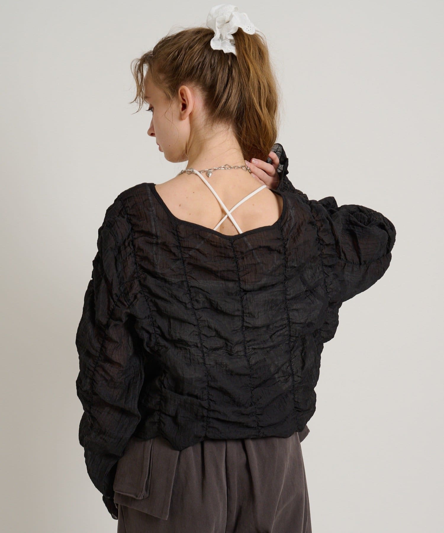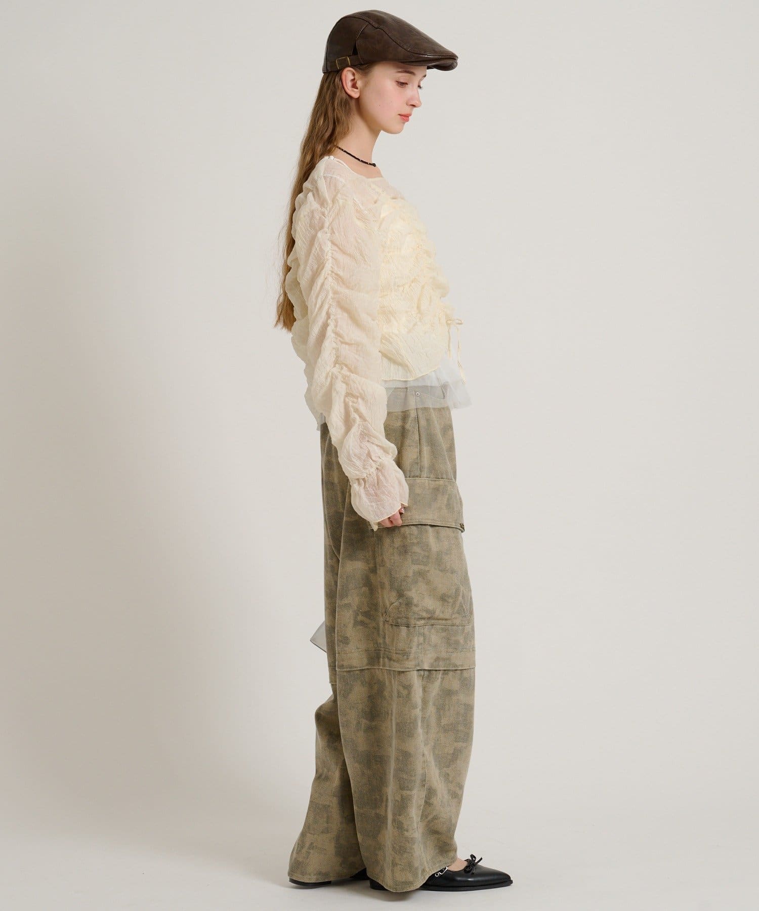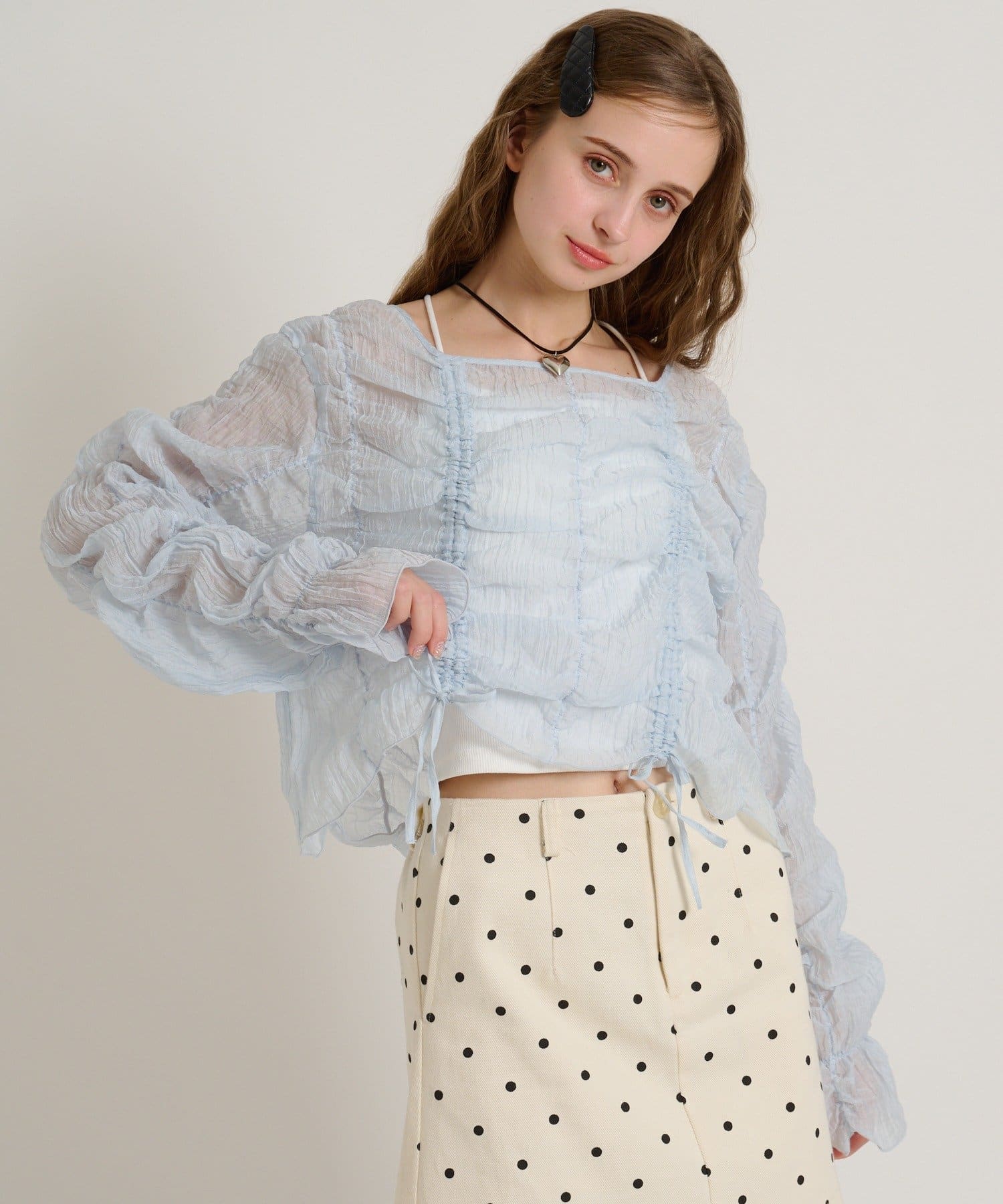 ・透け感のある生地とホイップのようにたっぷり入ったギャザーで着やせ効果も◎