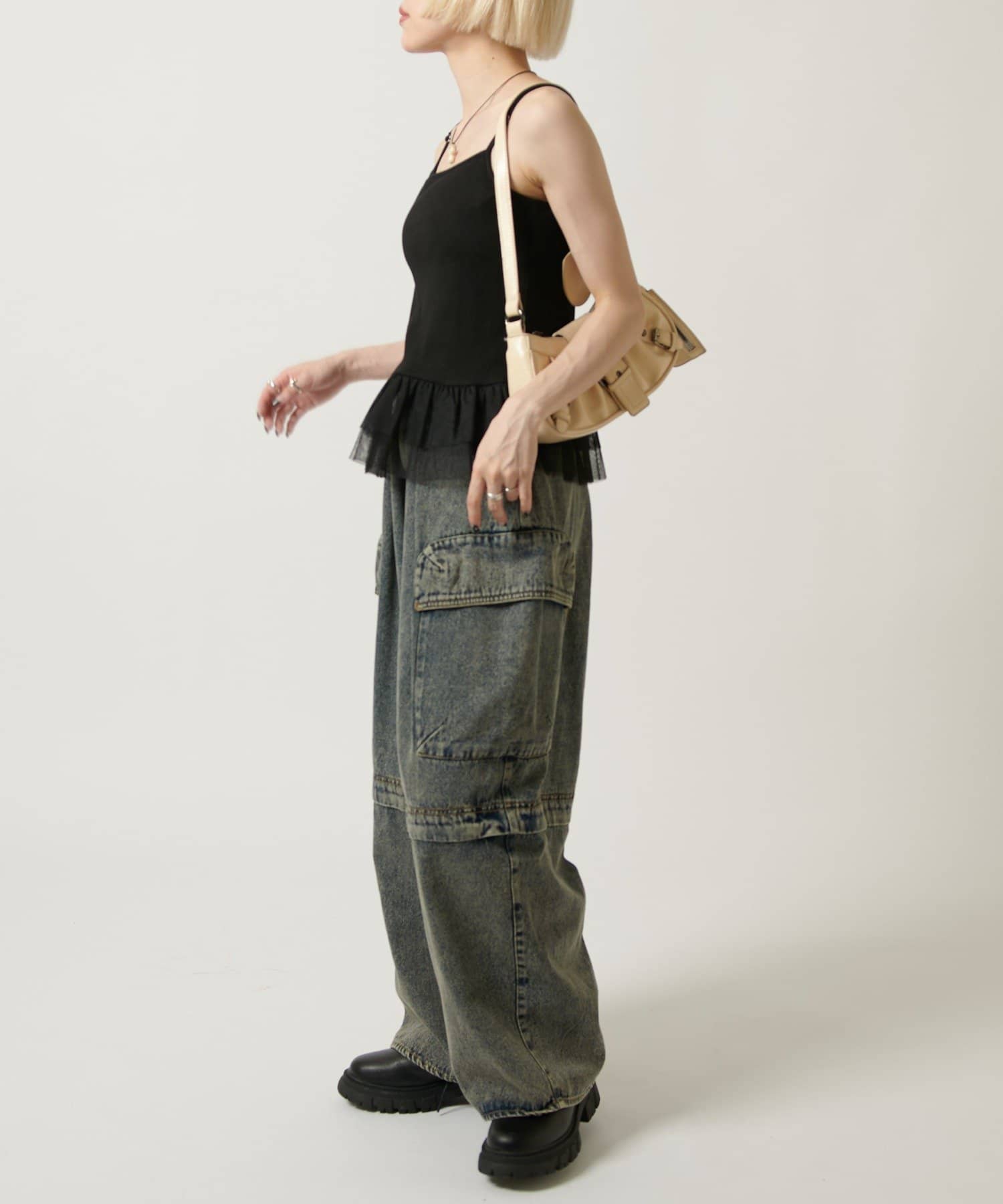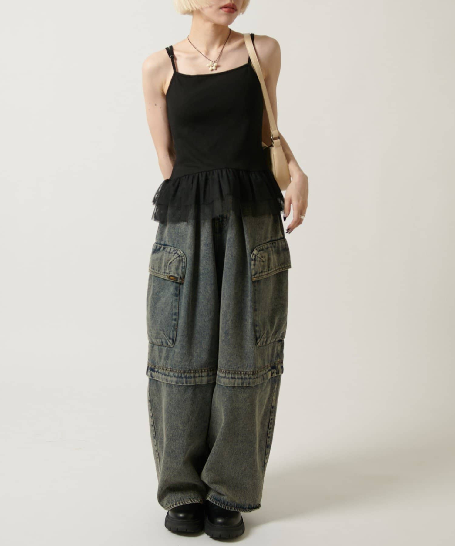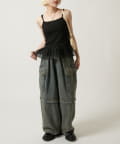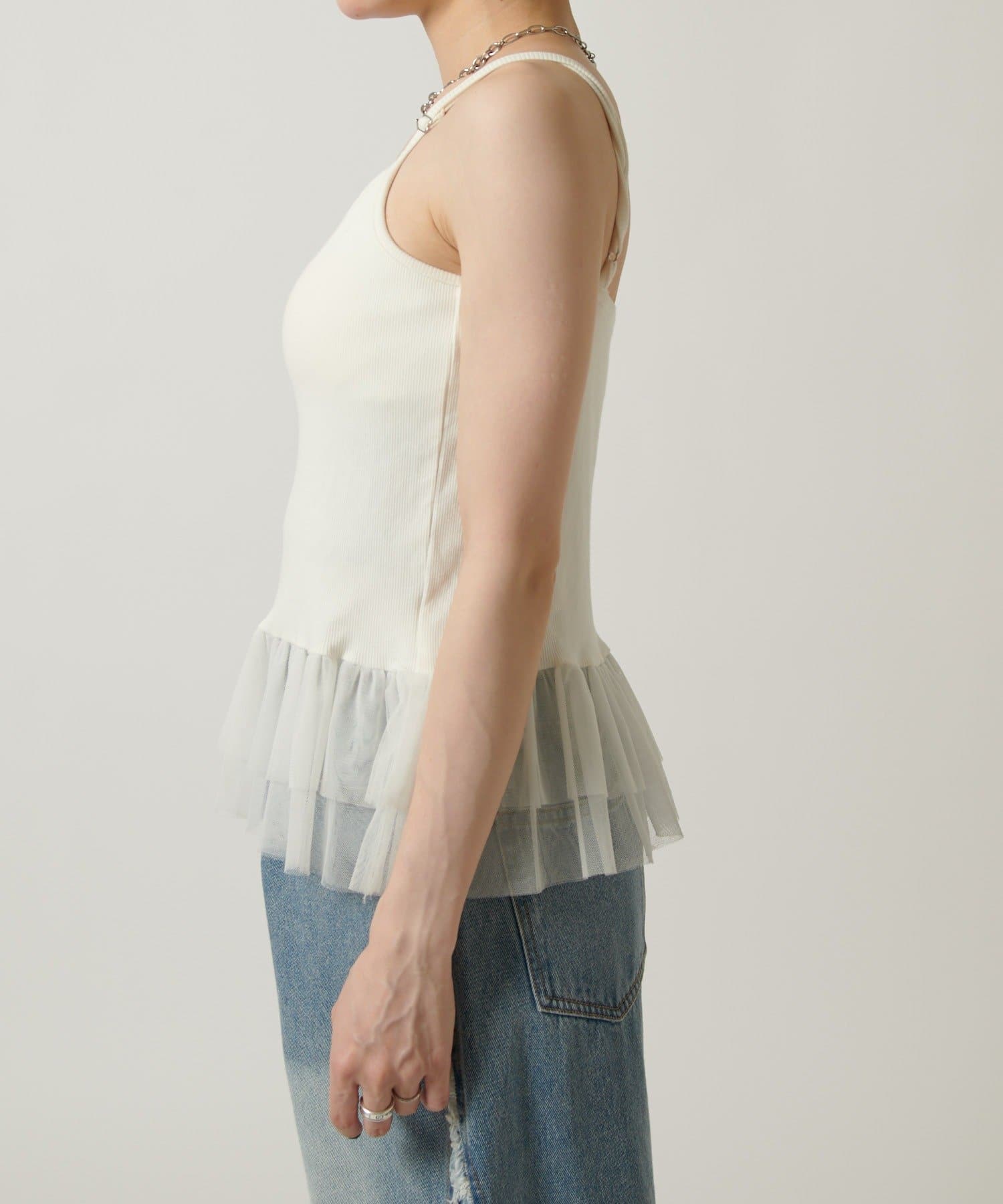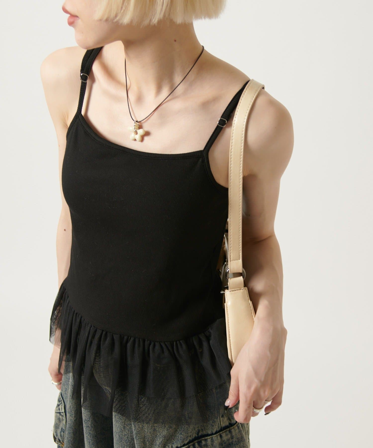 裾のチュールフリルがポイントのカップ付きキャミソール