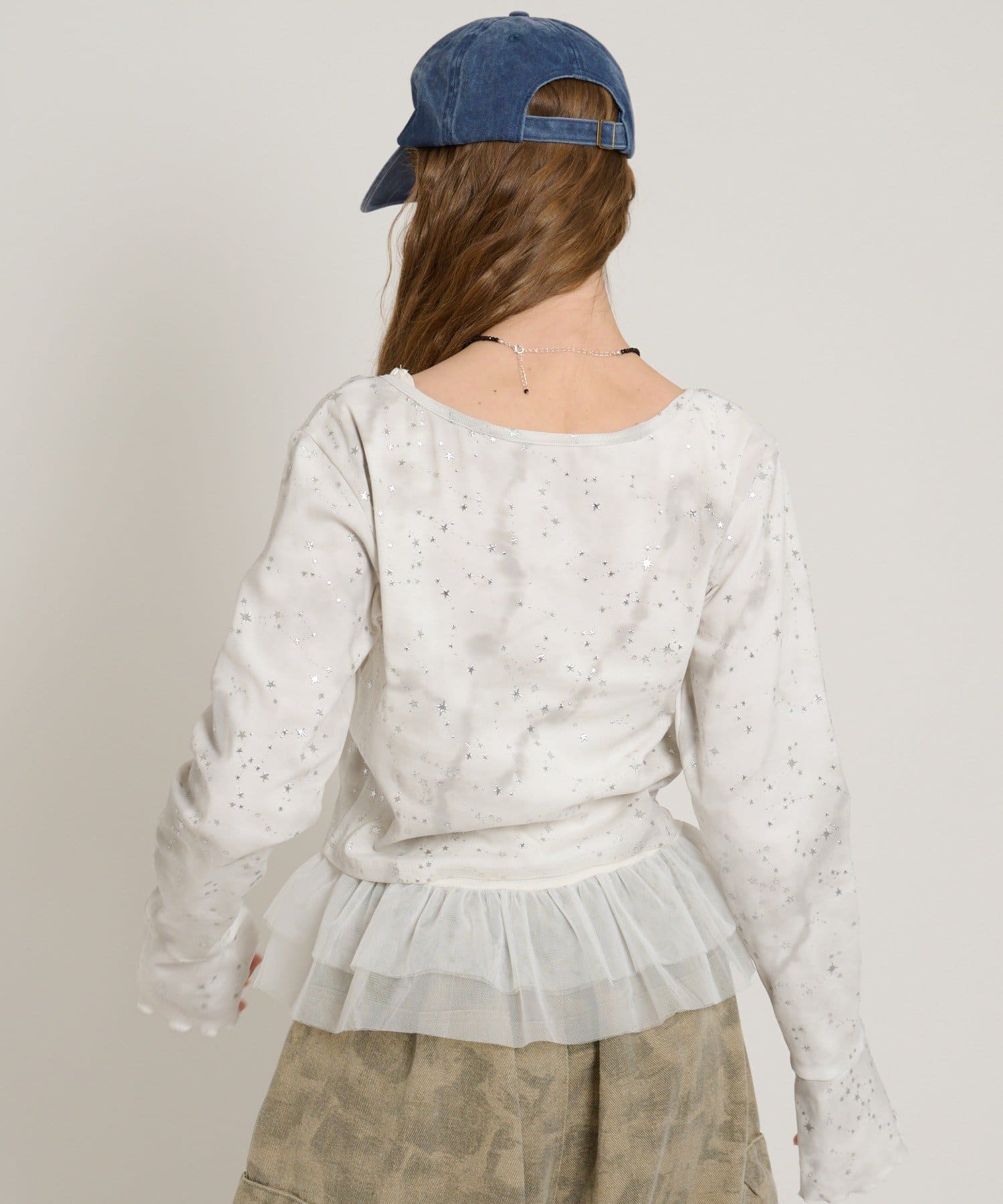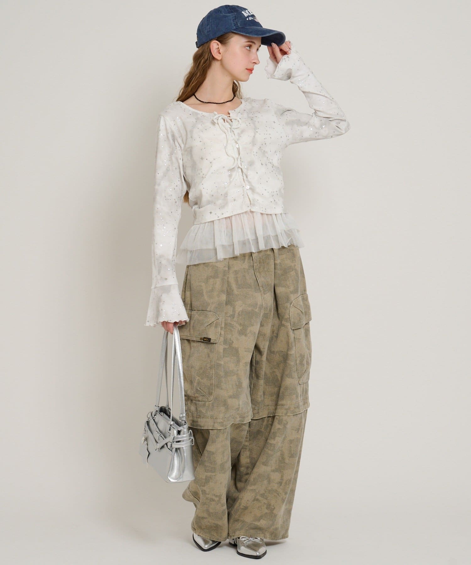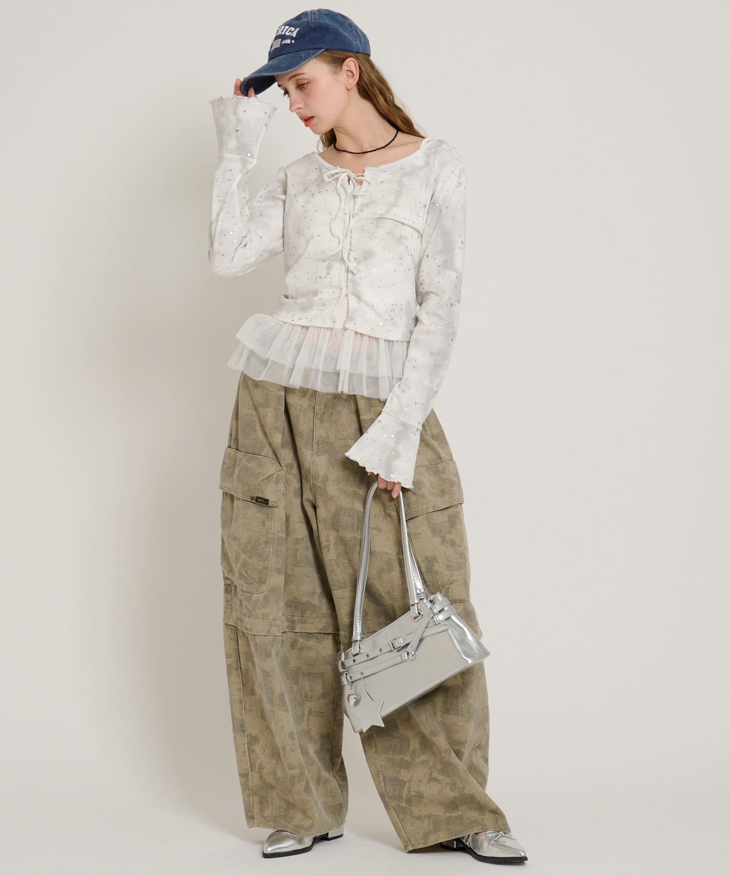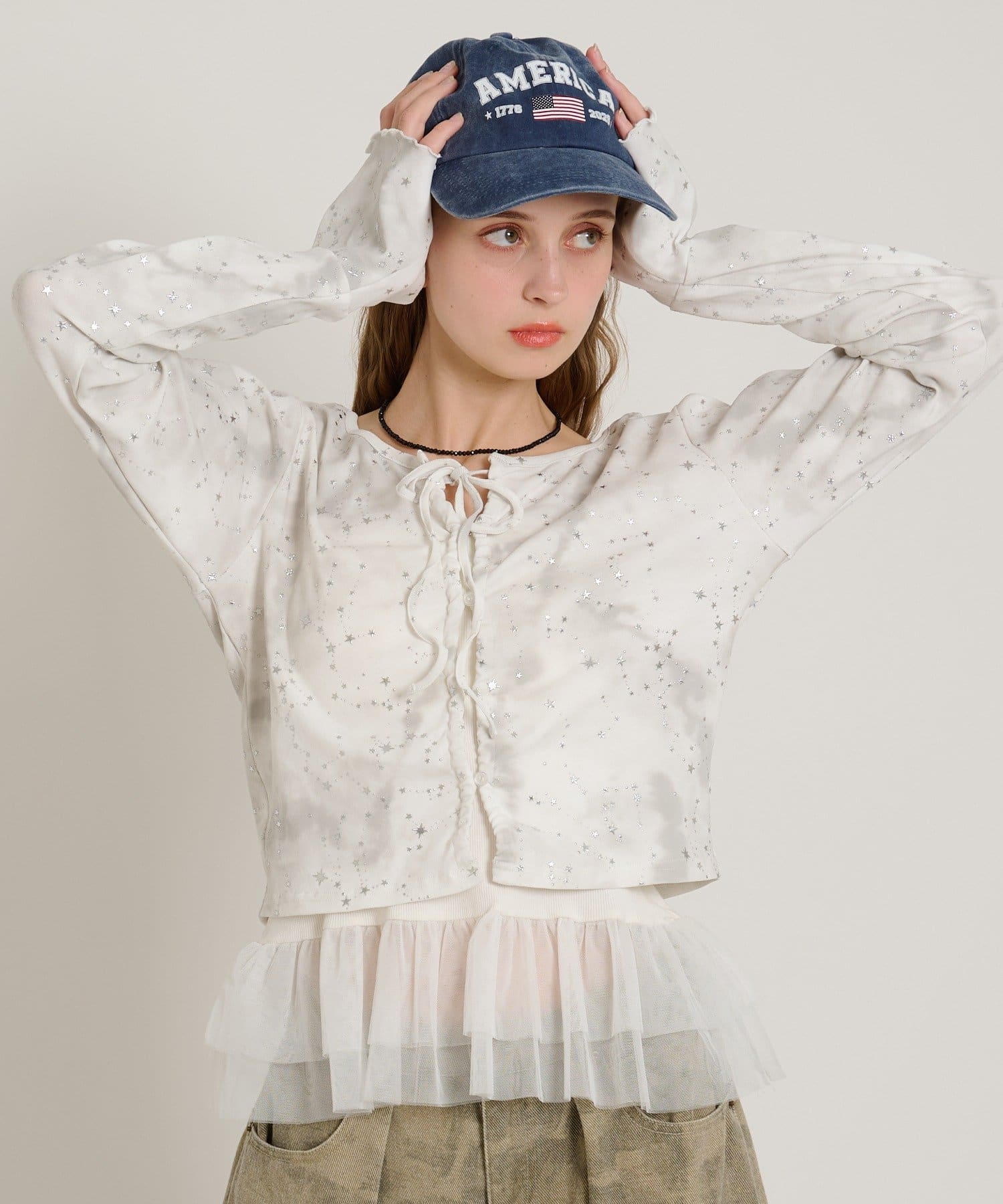 ・インナーにフリルやチュールドッキングのキャミソールを合わせるのもトレンドです