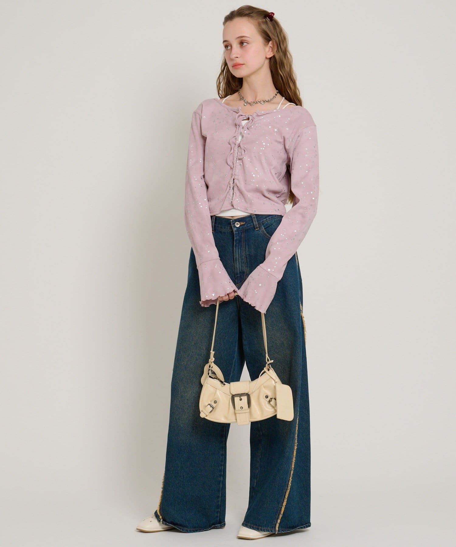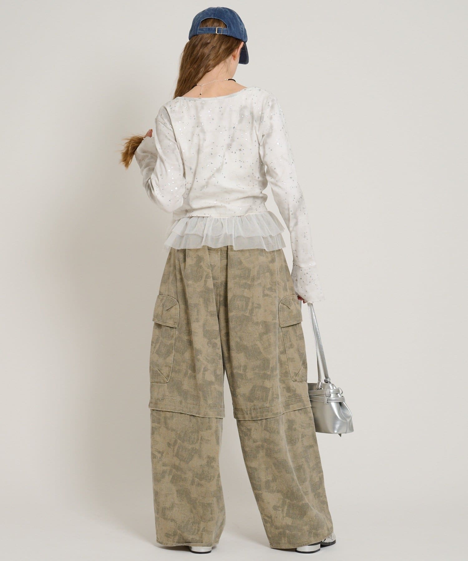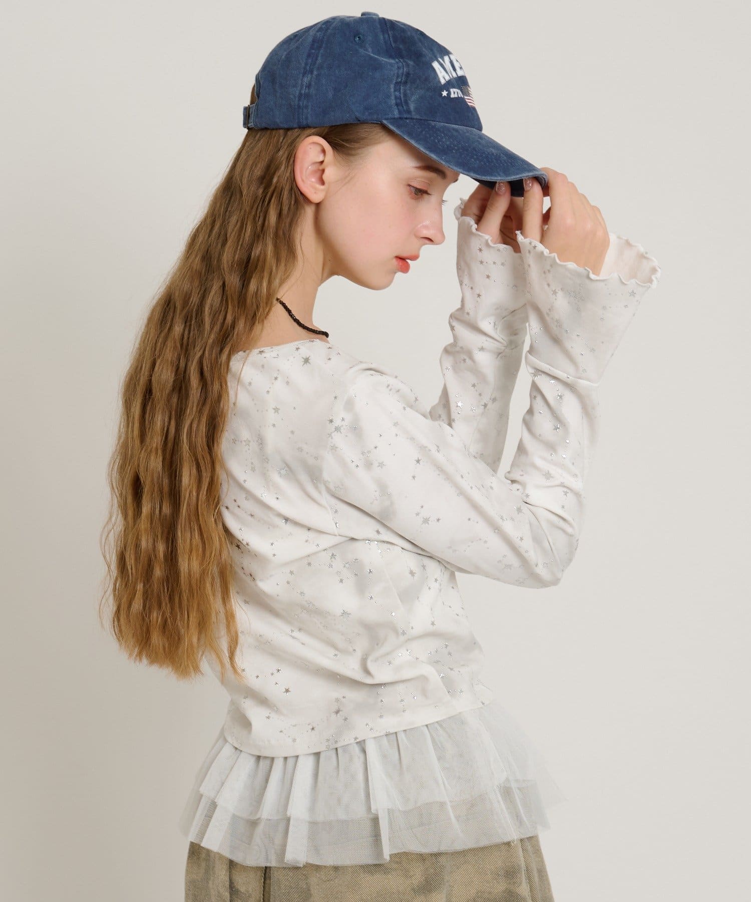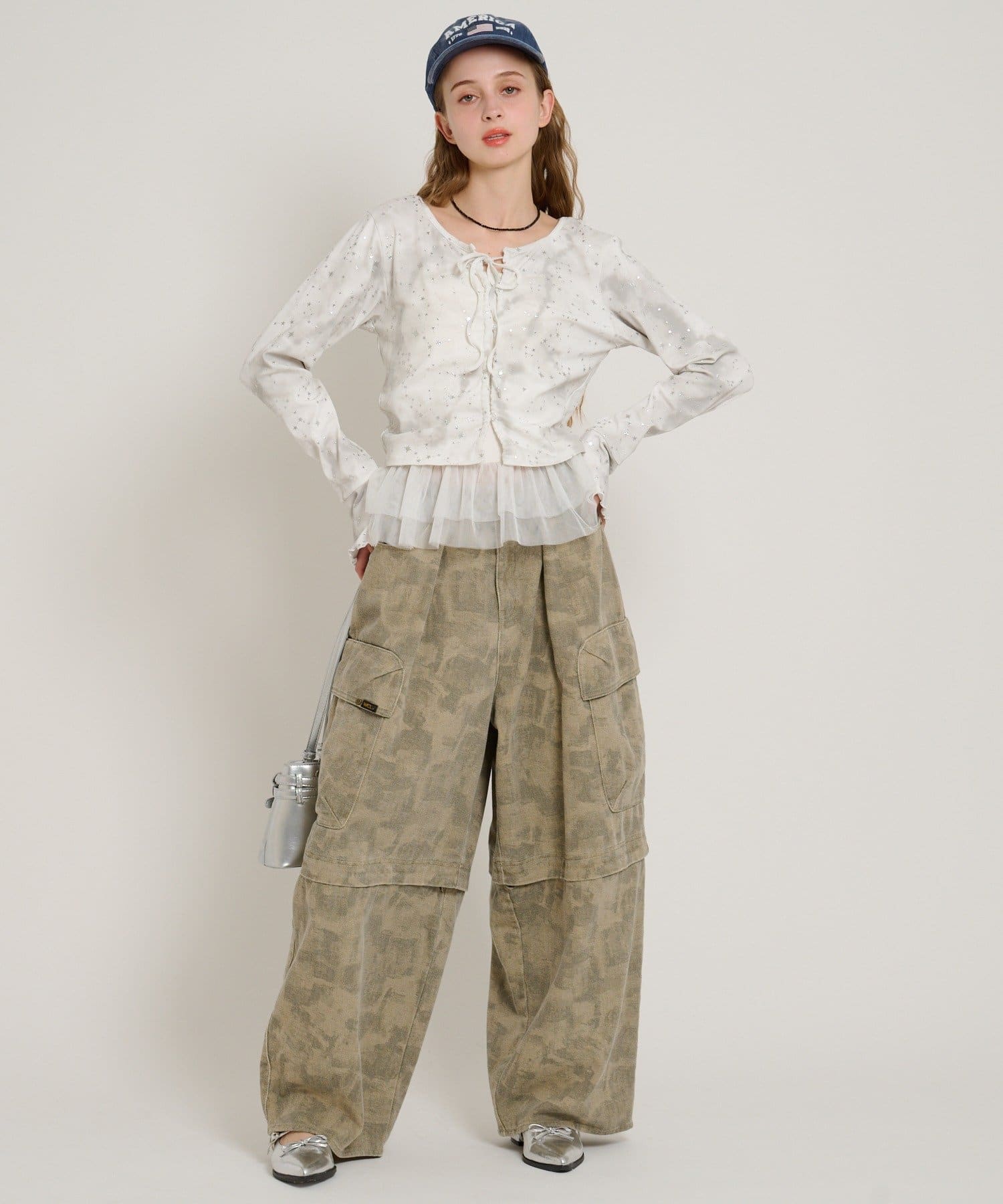 ・インナーにフリルやチュールドッキングのキャミソールを合わせるのもトレンドです