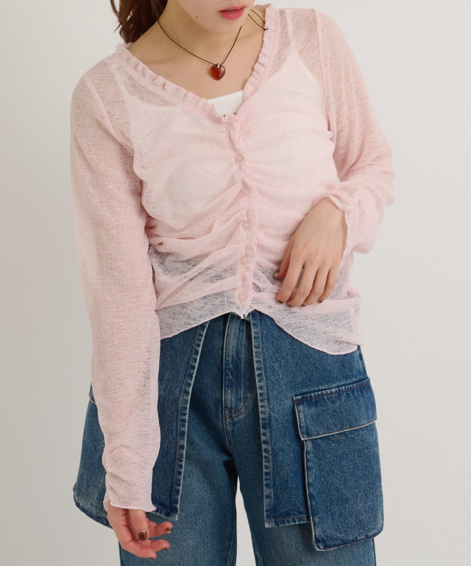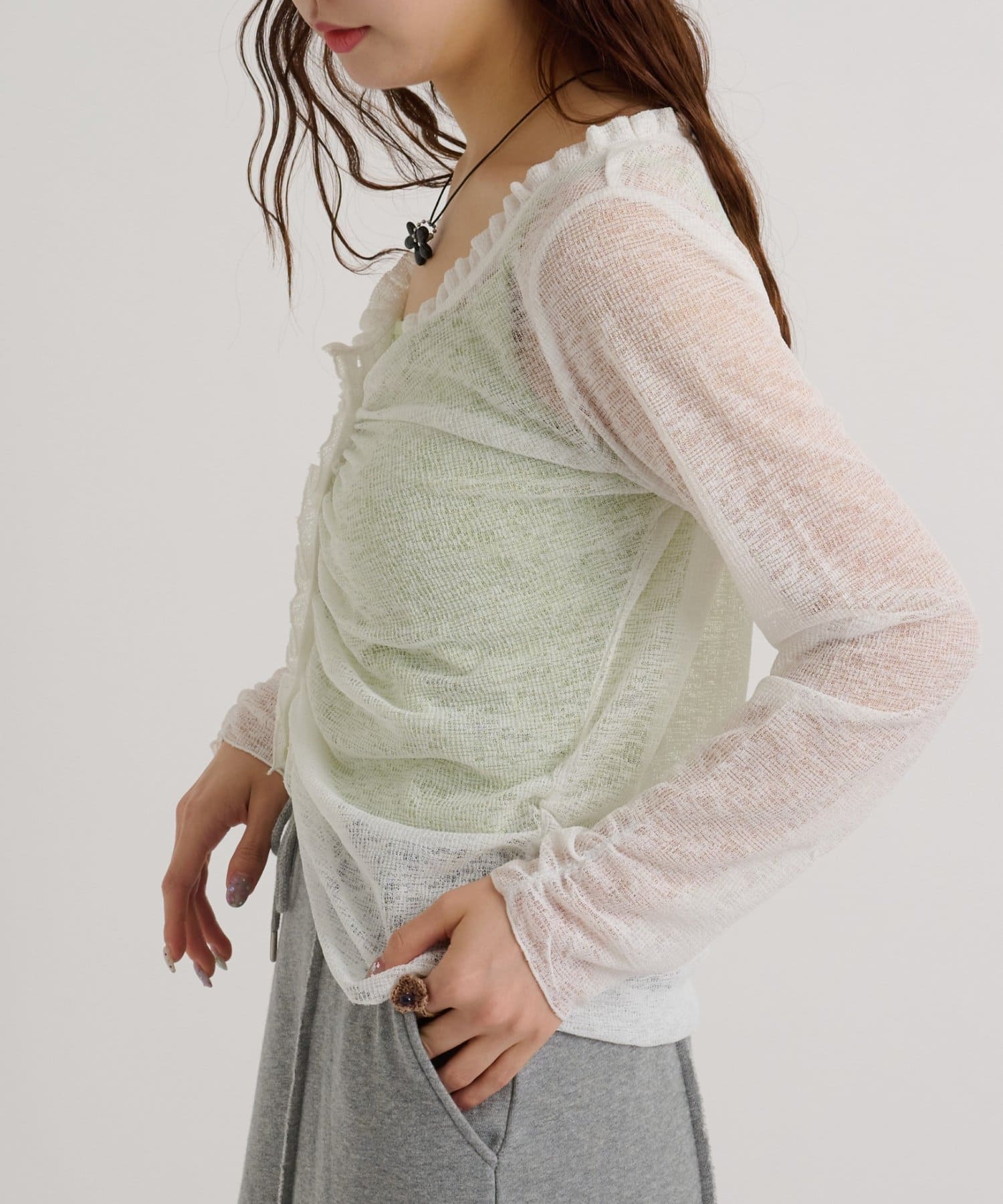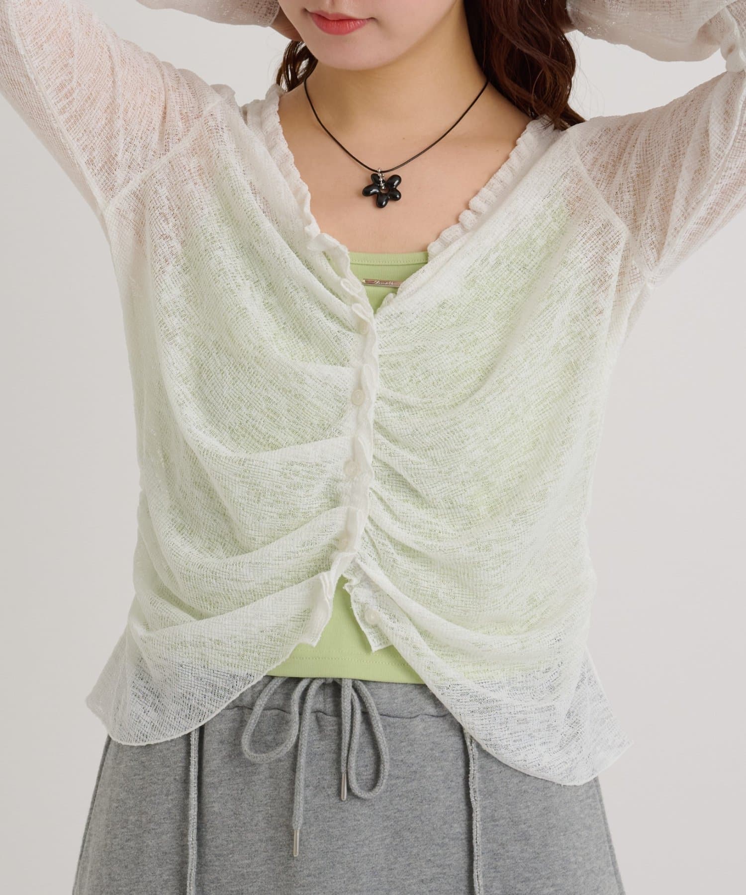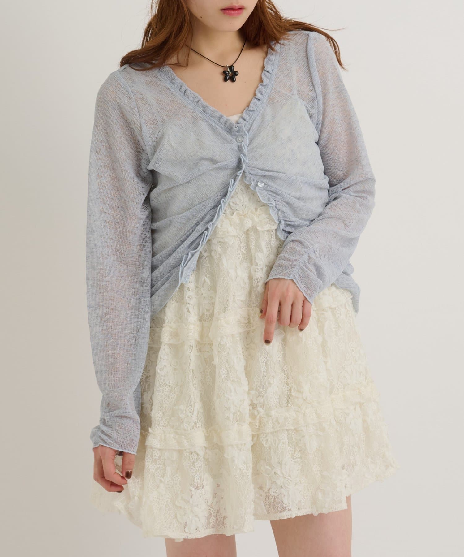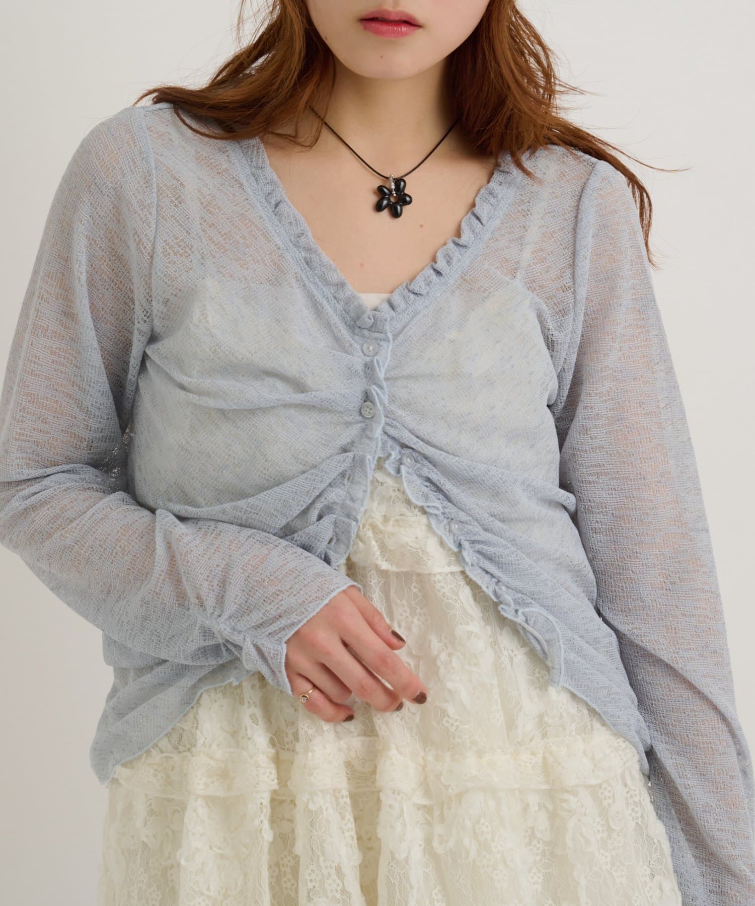 ・胸元のフリルが女性らしい印象のシアーカーディガン