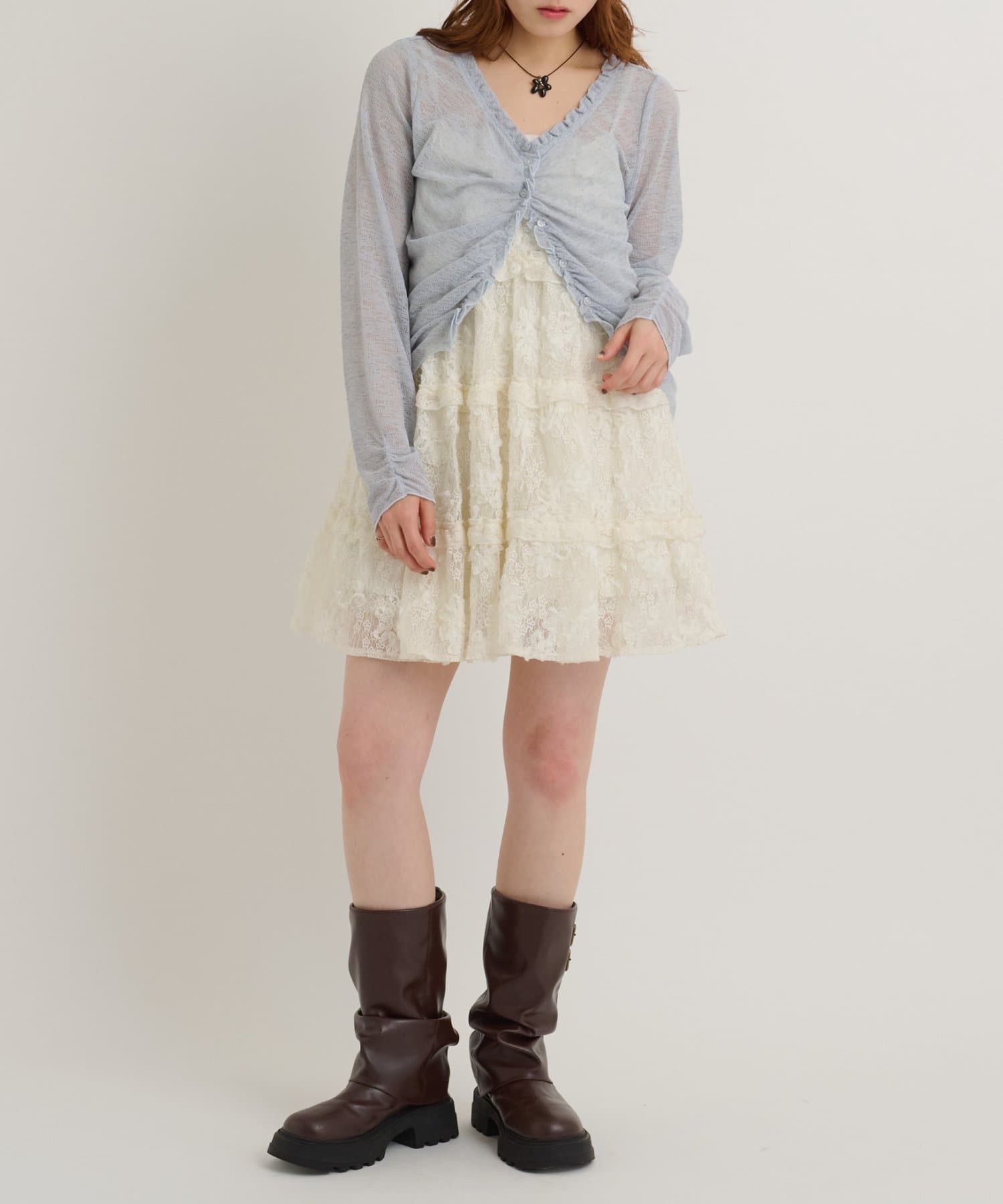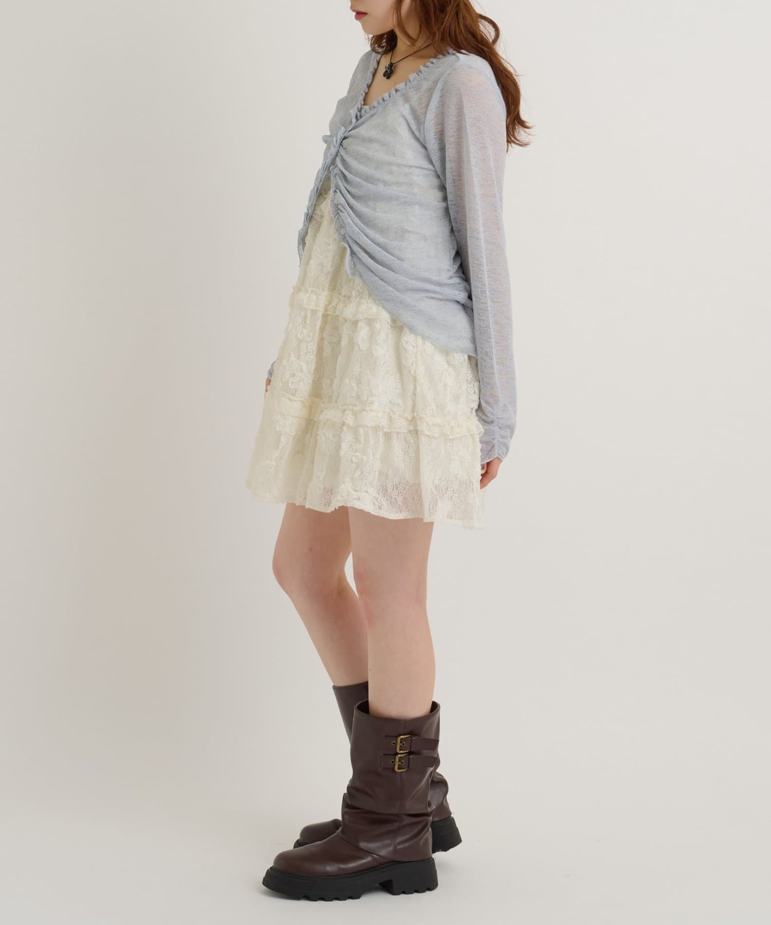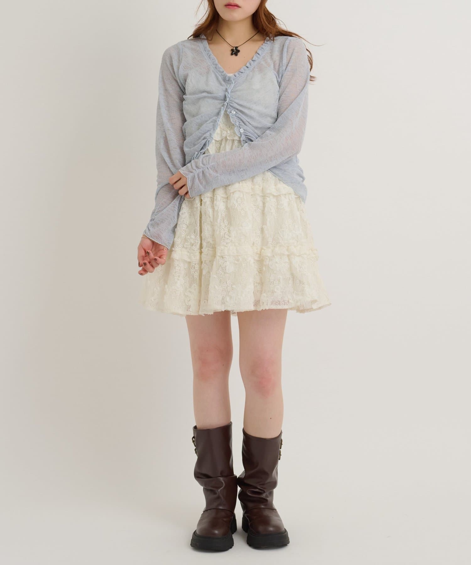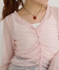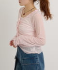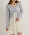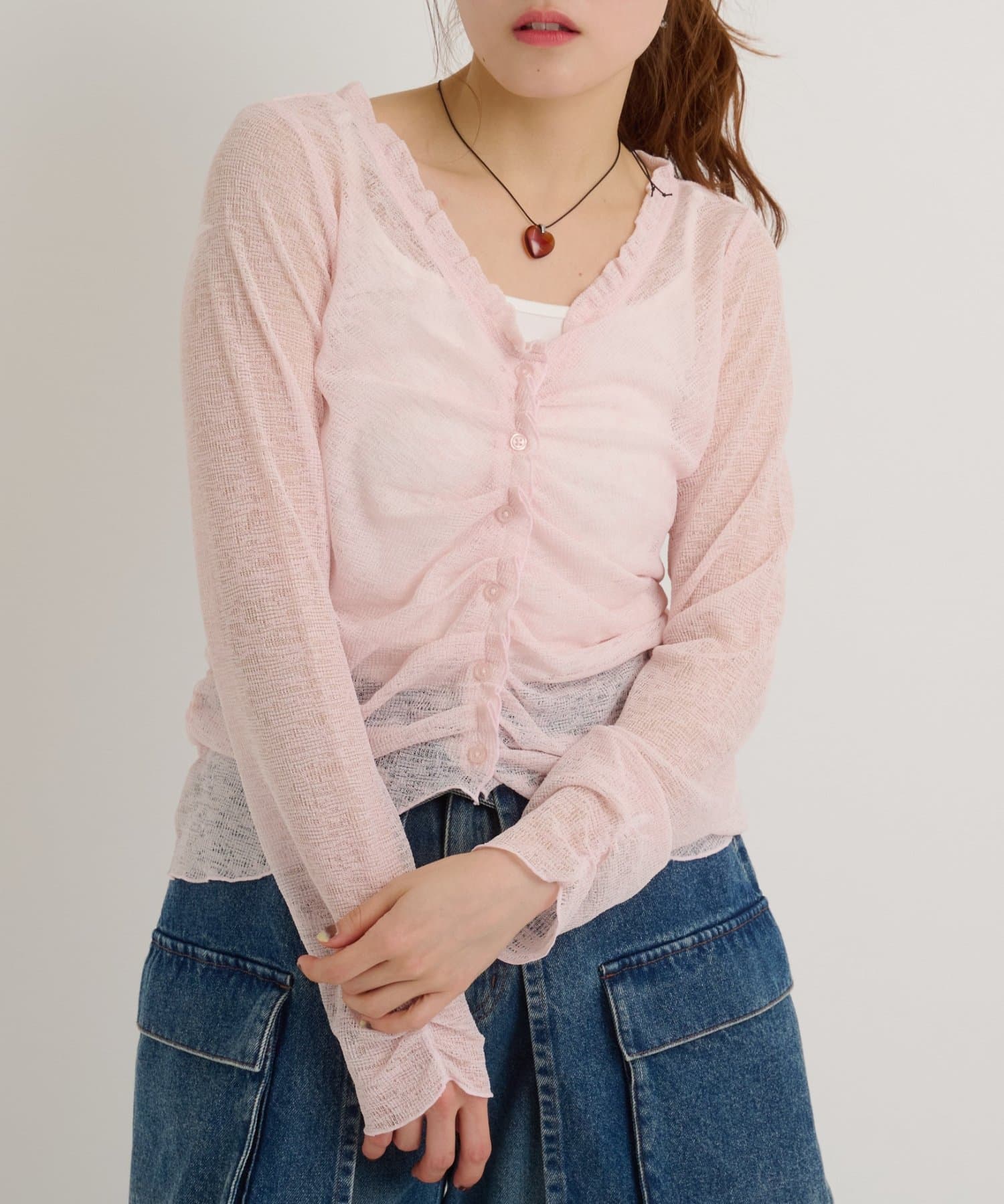 ・胸元のフリルが女性らしい印象のシアーカーディガン
