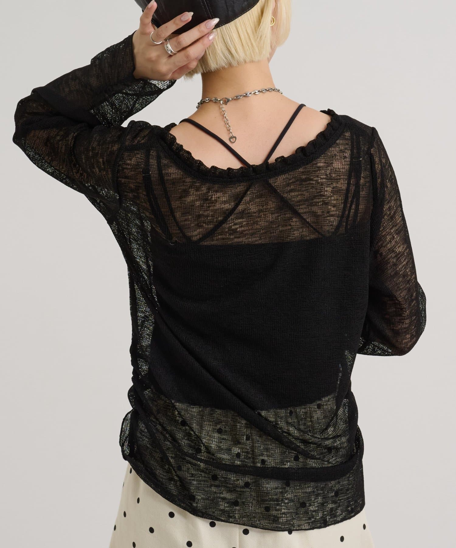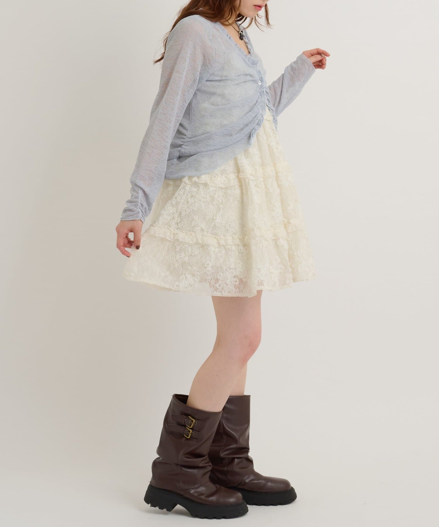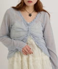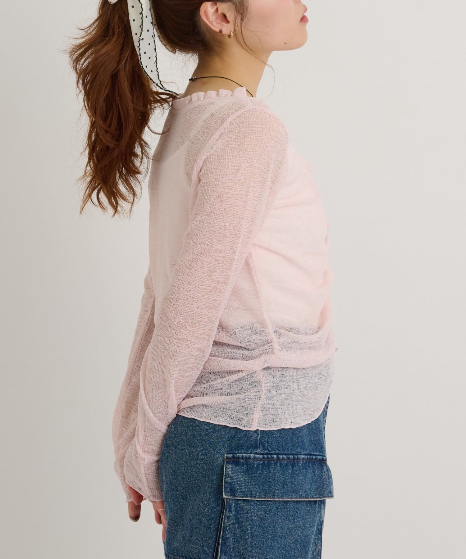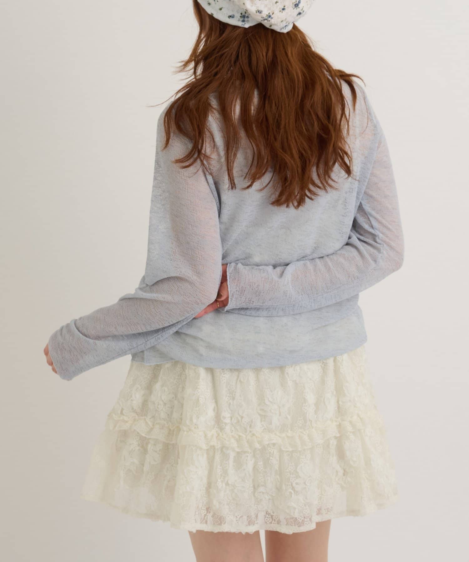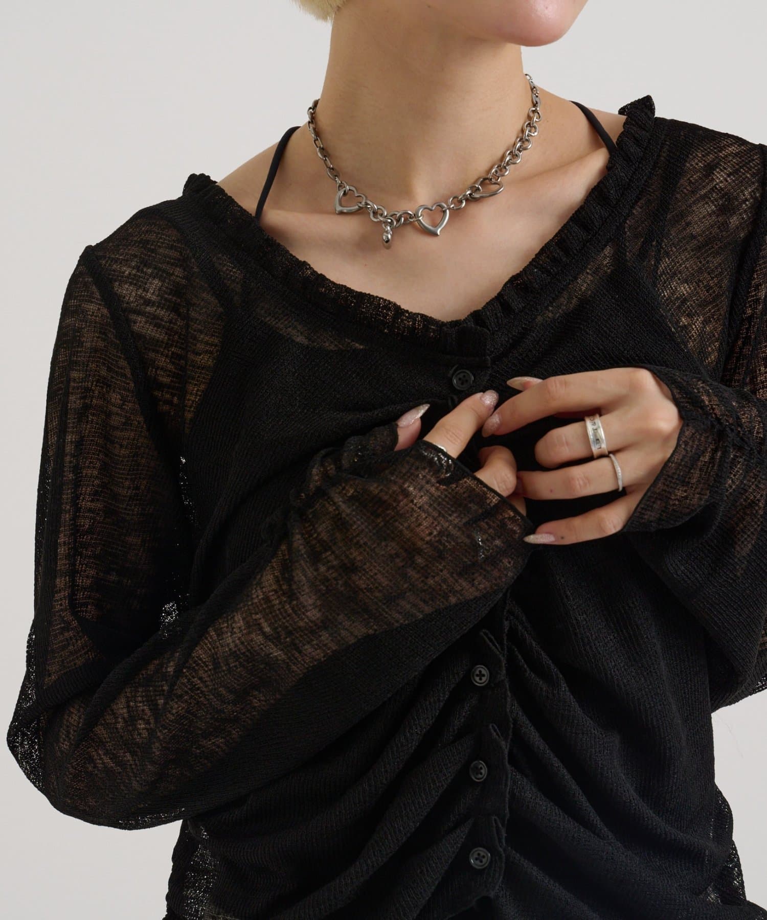 ・胸元のフリルが女性らしい印象のシアーカーディガン
