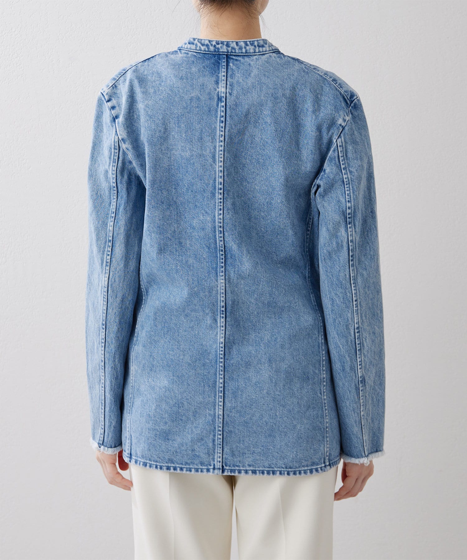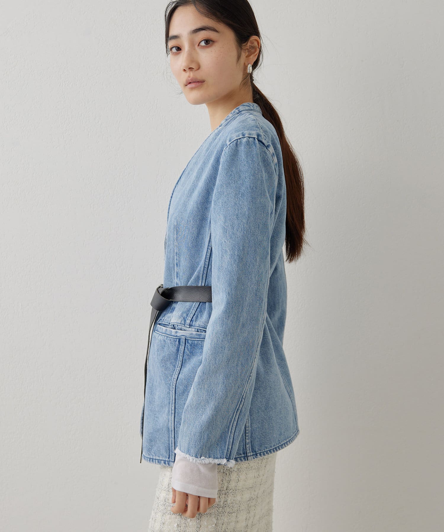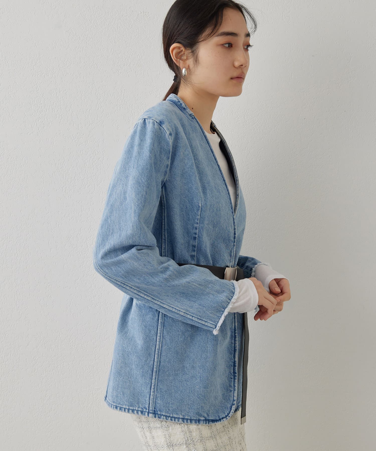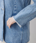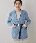 ■上品な印象のノーカラージャケットをあえてデニム素材で作った一着。