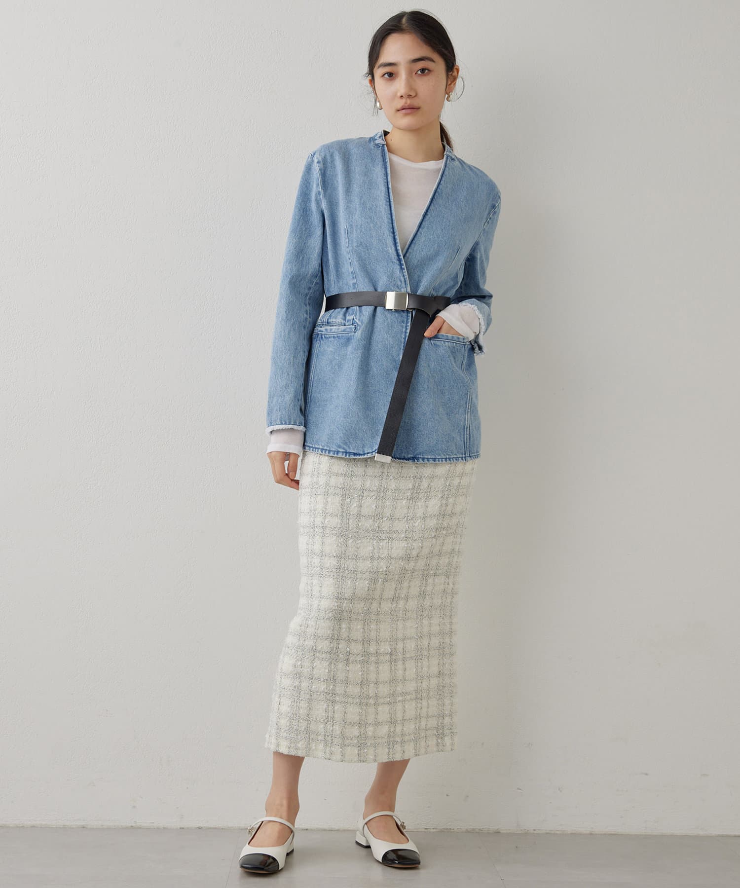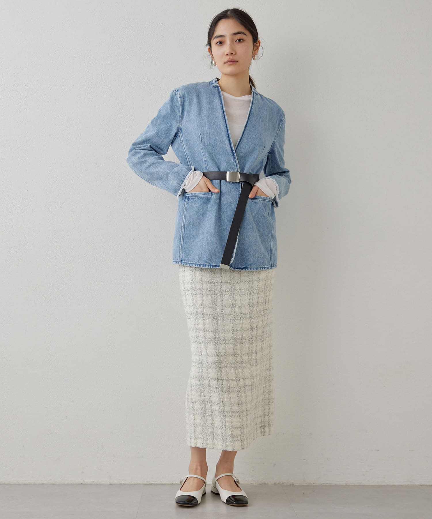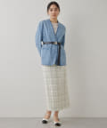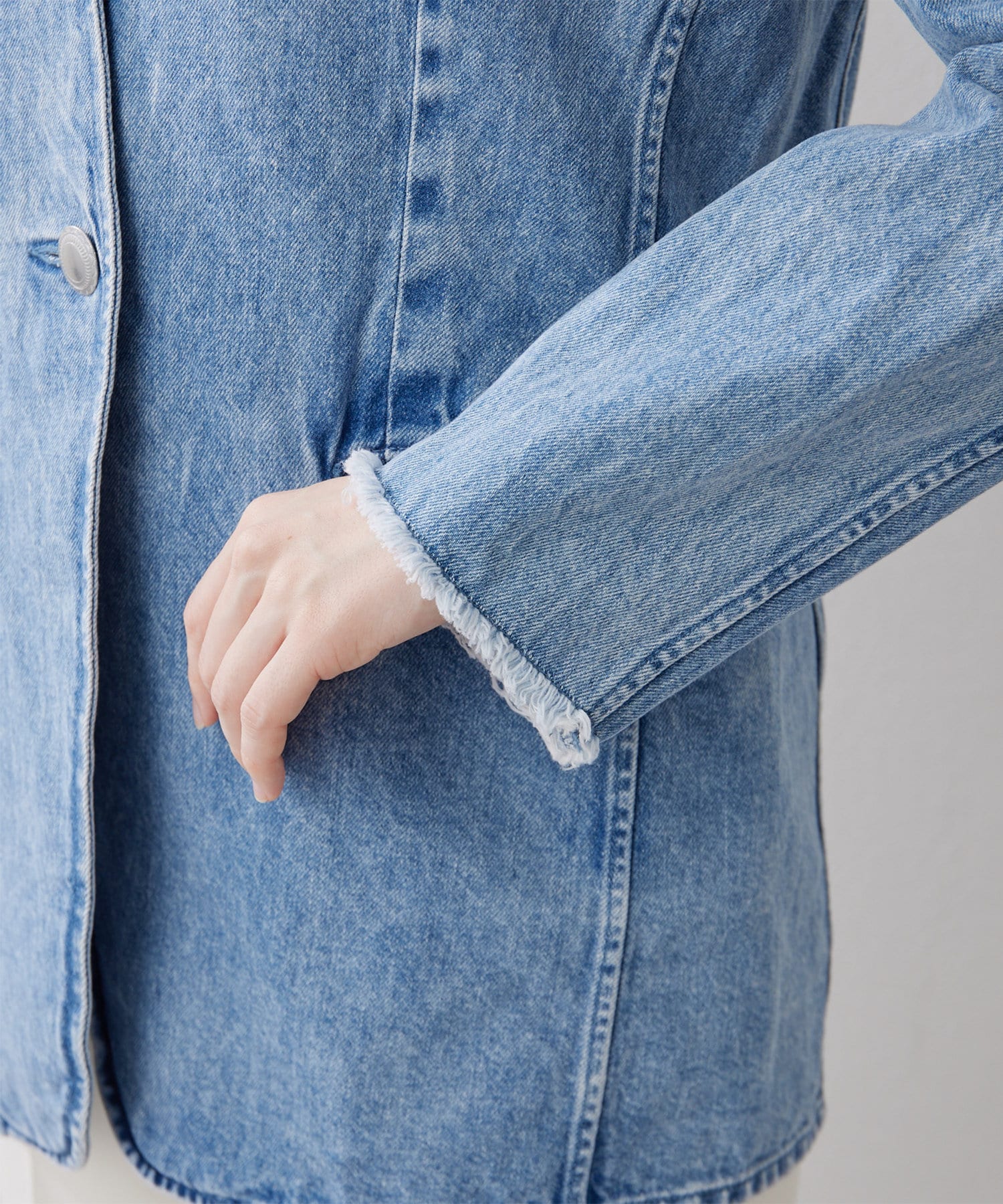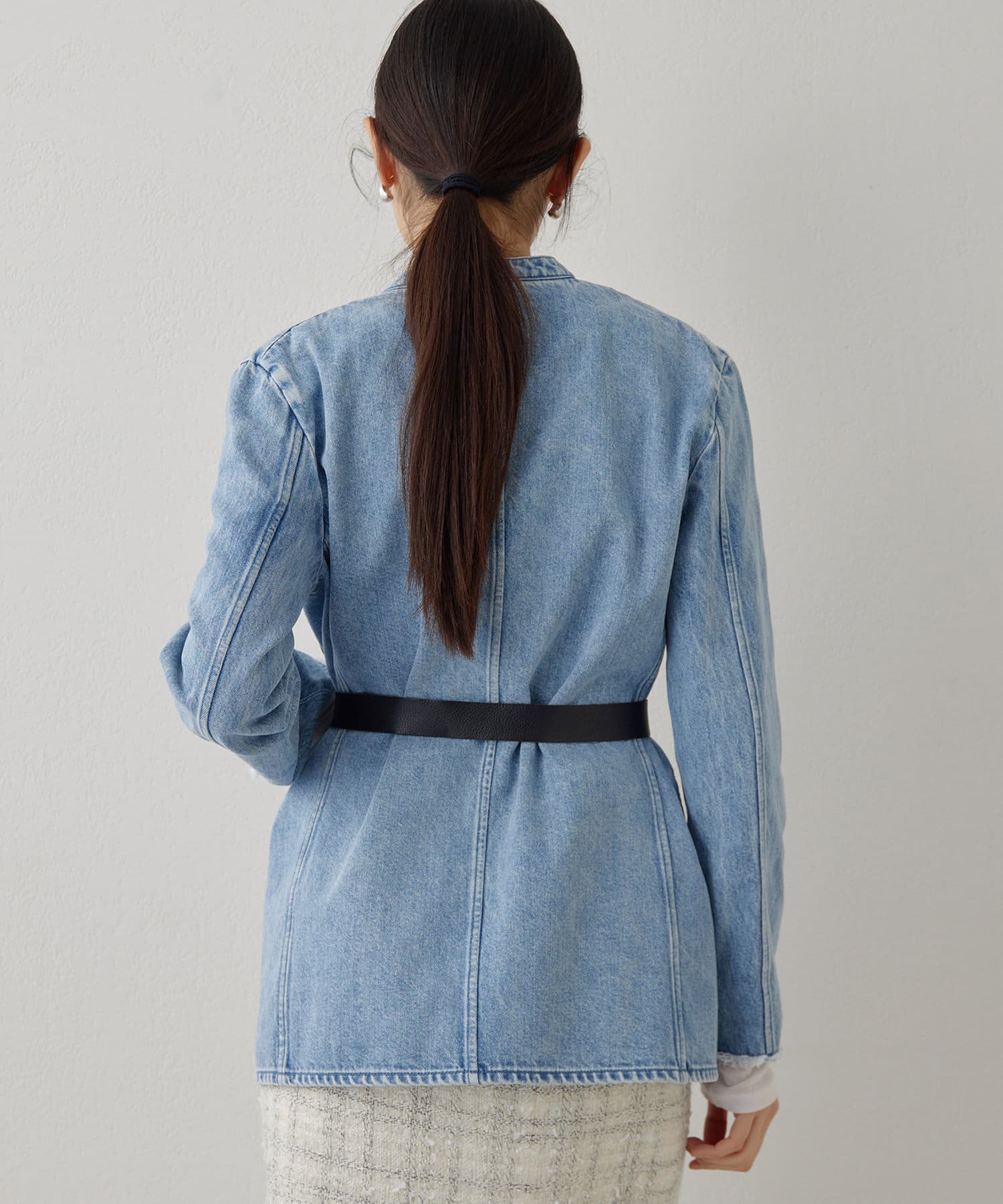 ■上品な印象のノーカラージャケットをあえてデニム素材で作った一着。