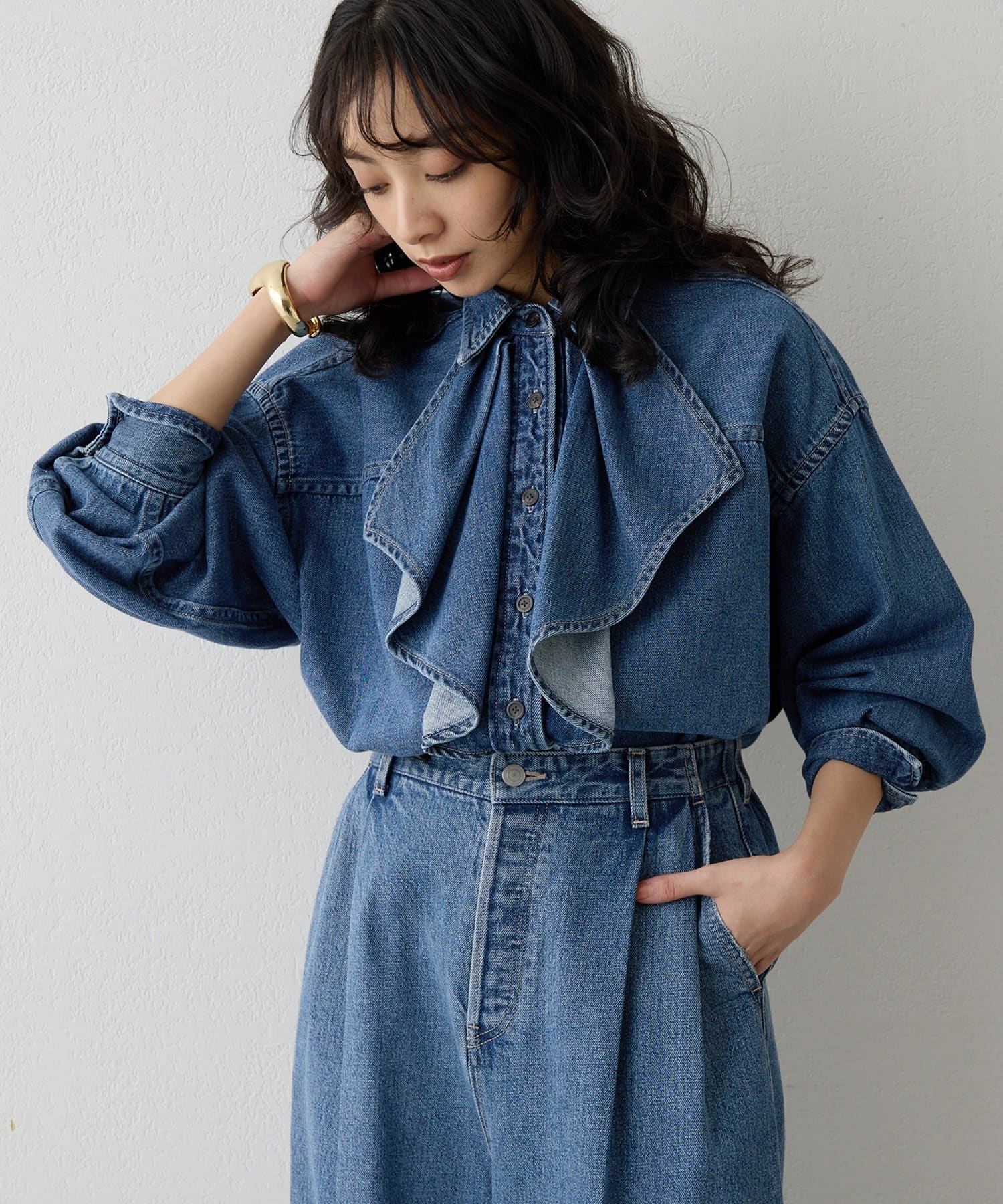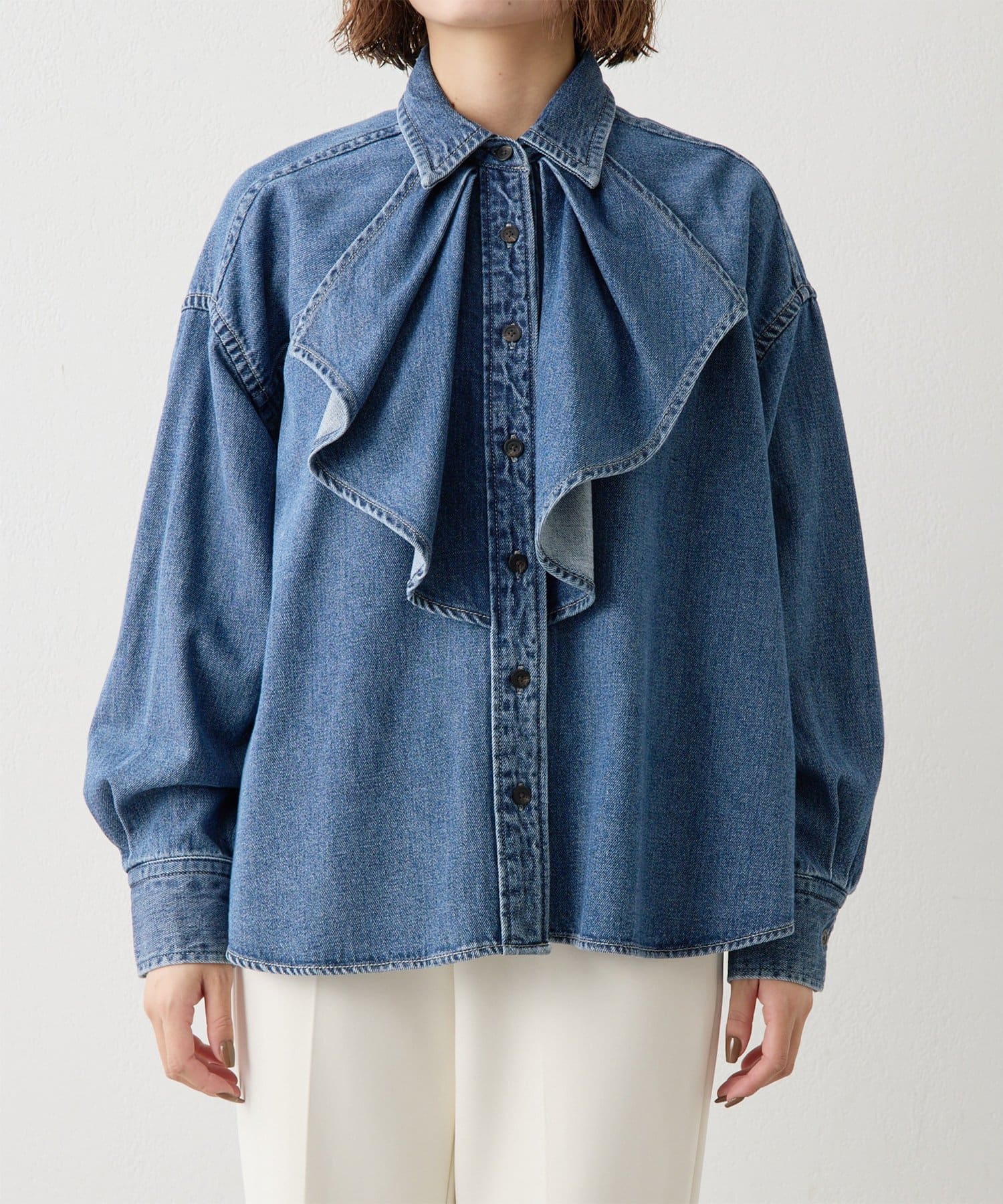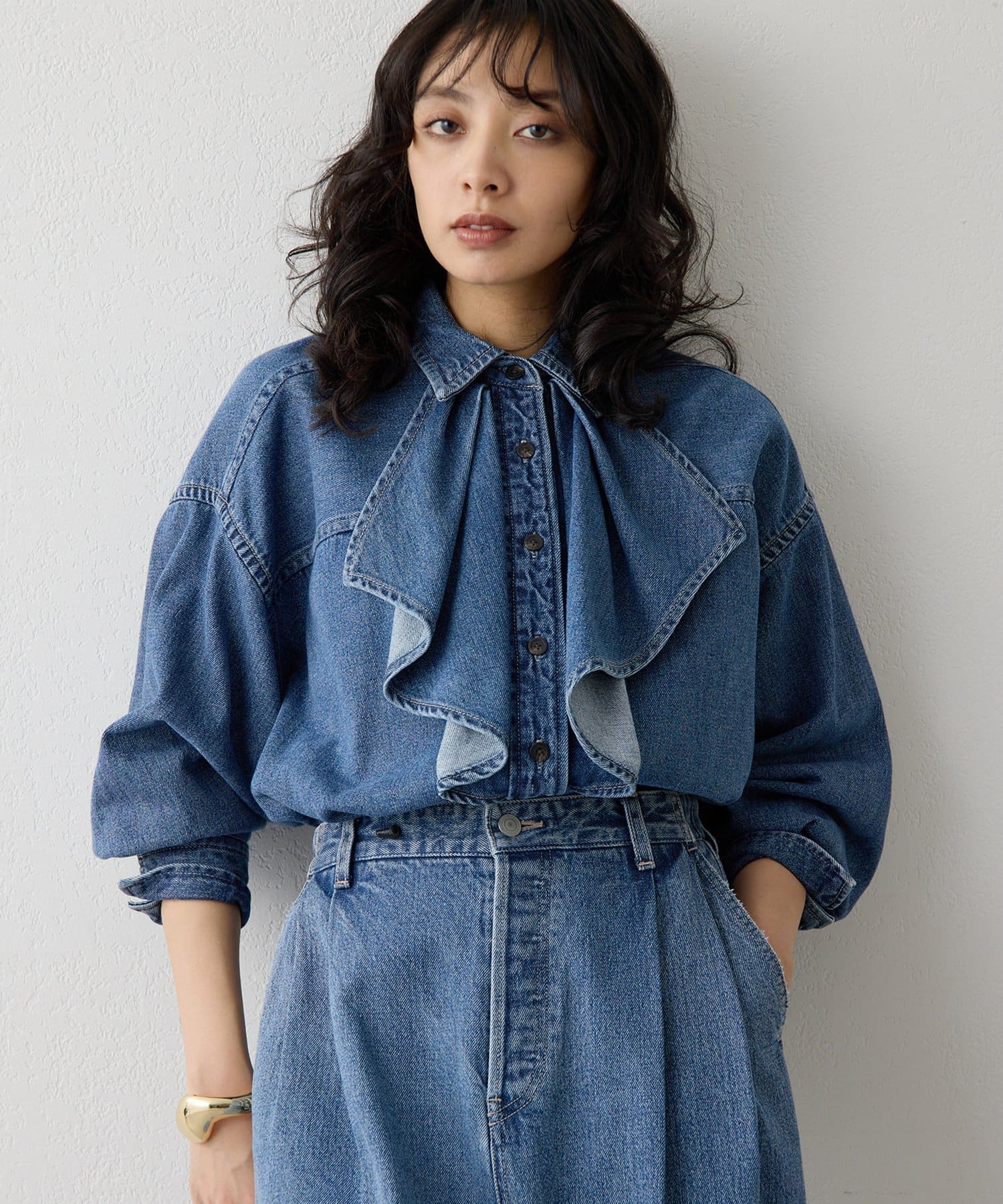 デニムの生地感が甘すぎない、大人なフリルブラウス