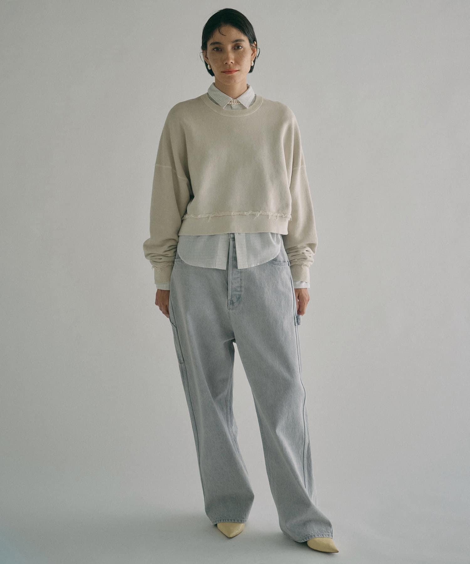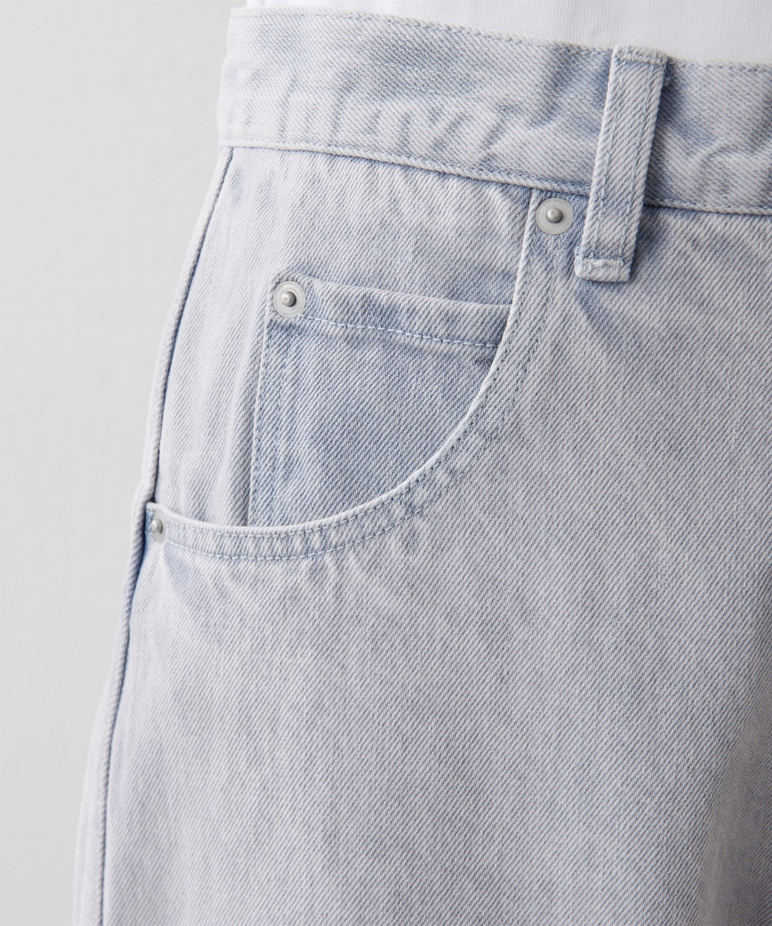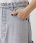 個性的なカラーと深めの股上が印象的なストレートデニム