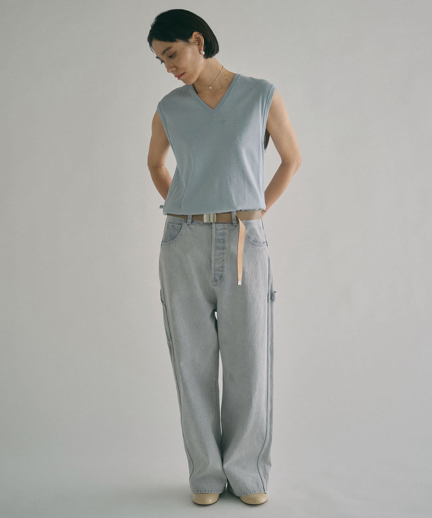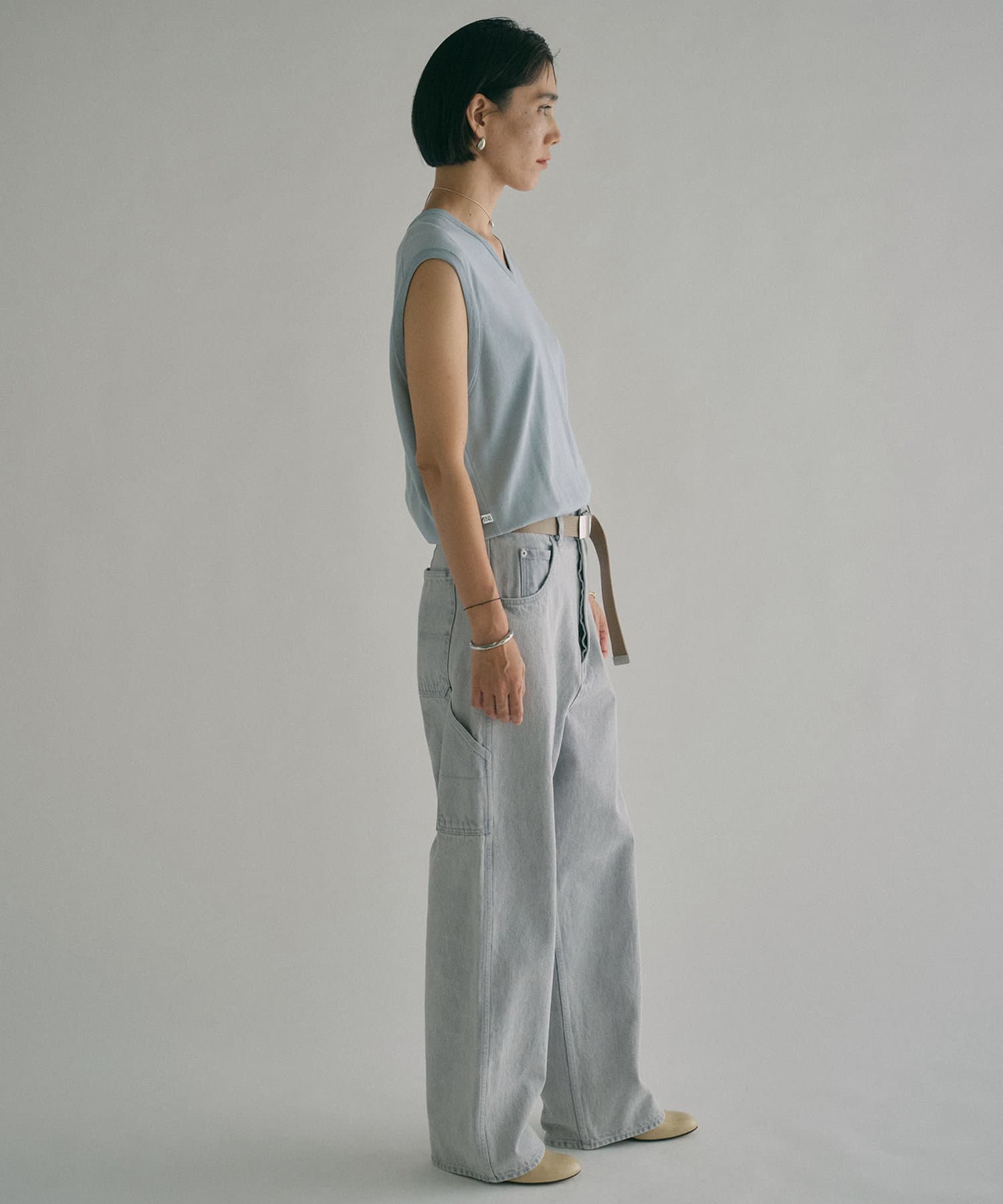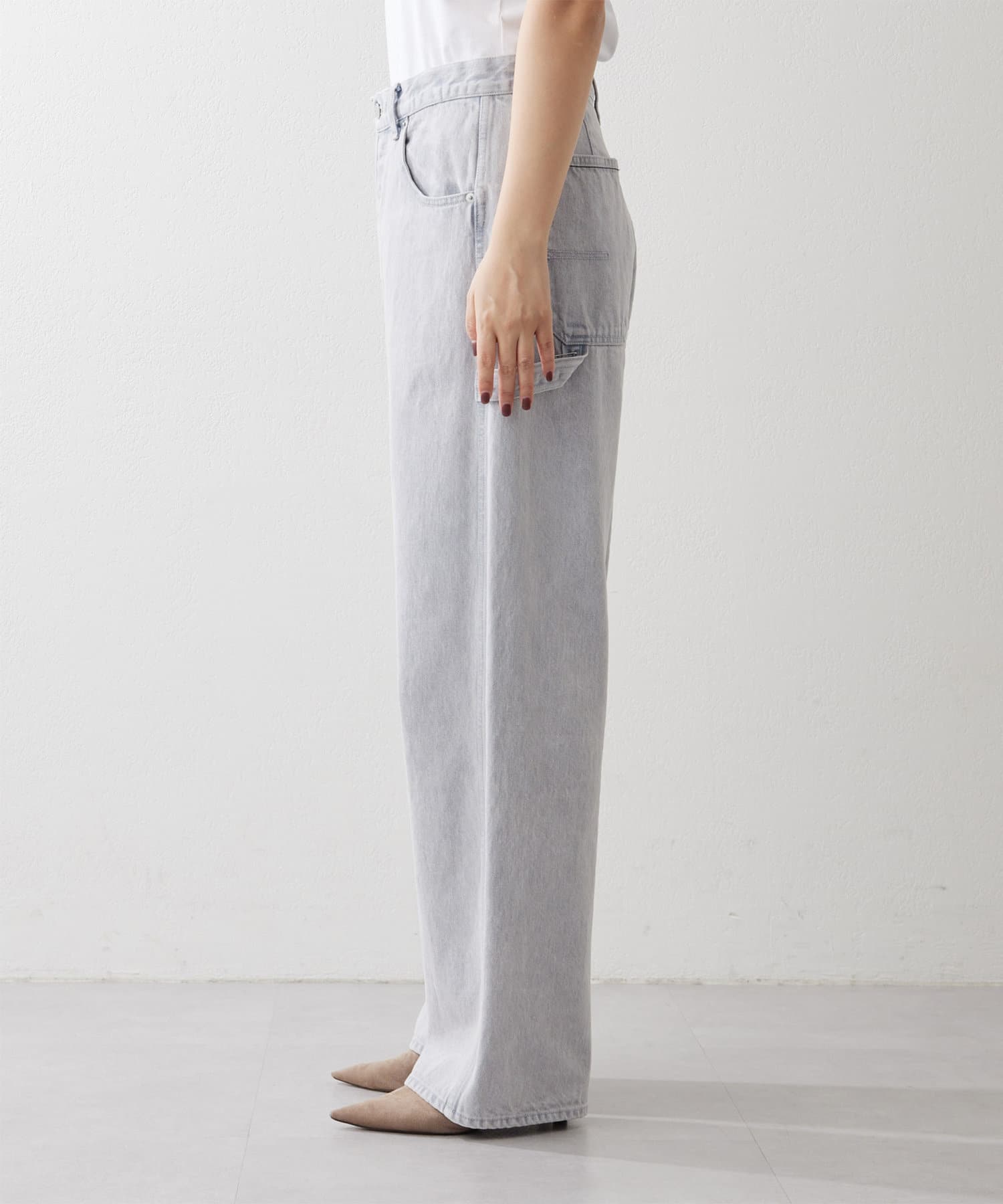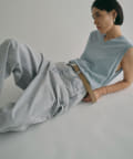 ■深い股上が印象的で、ベルトをしての着用や腰位置に落としての着用など、ウエスト位置を変えてスタイルの幅を楽しめるアイテム。