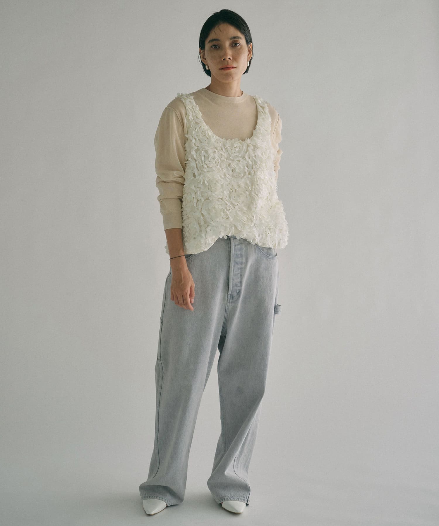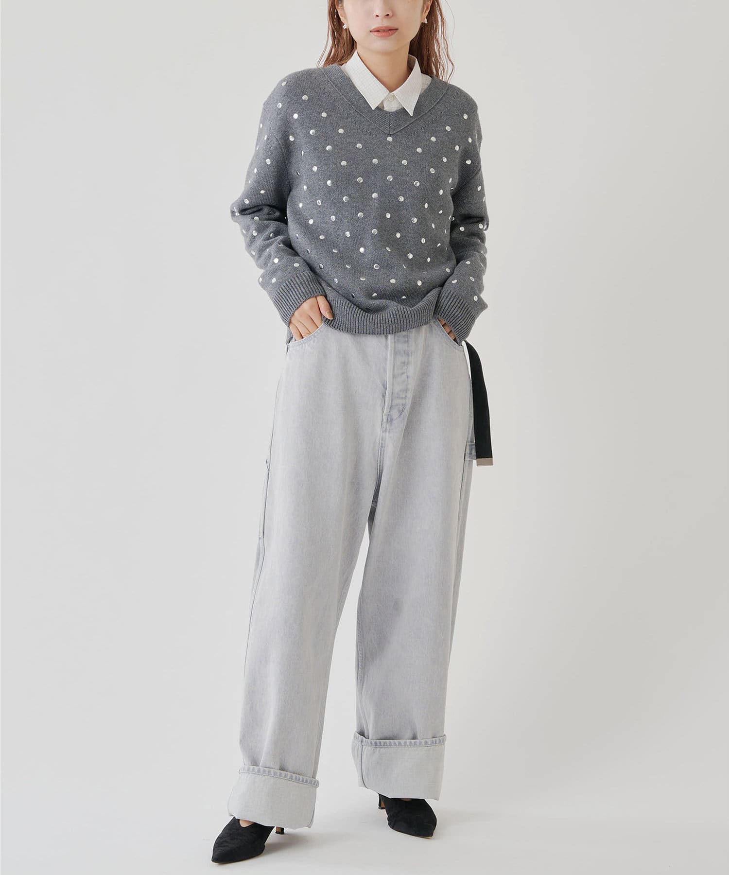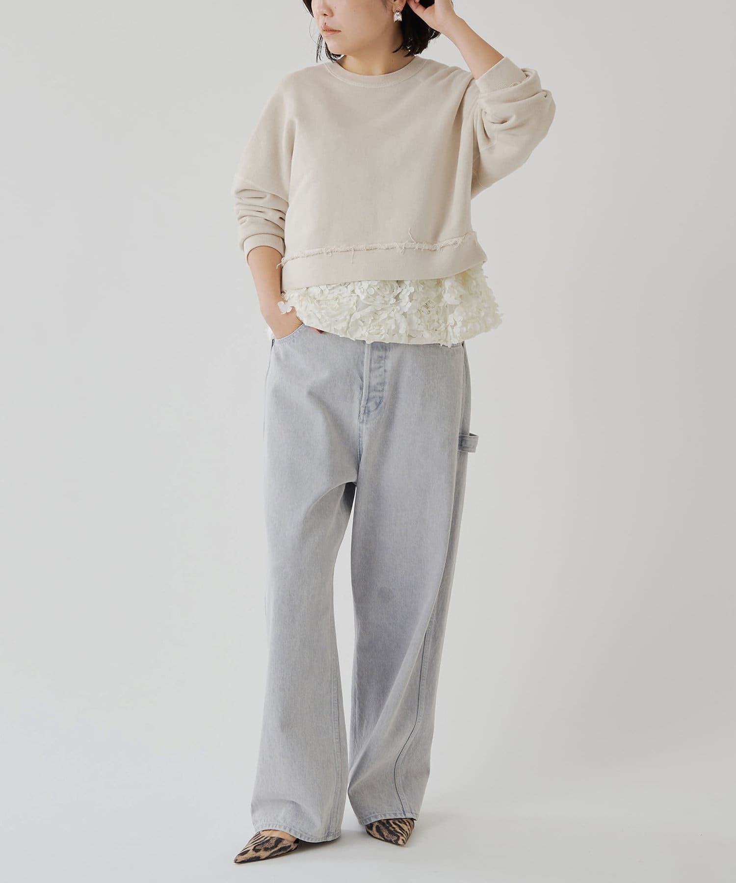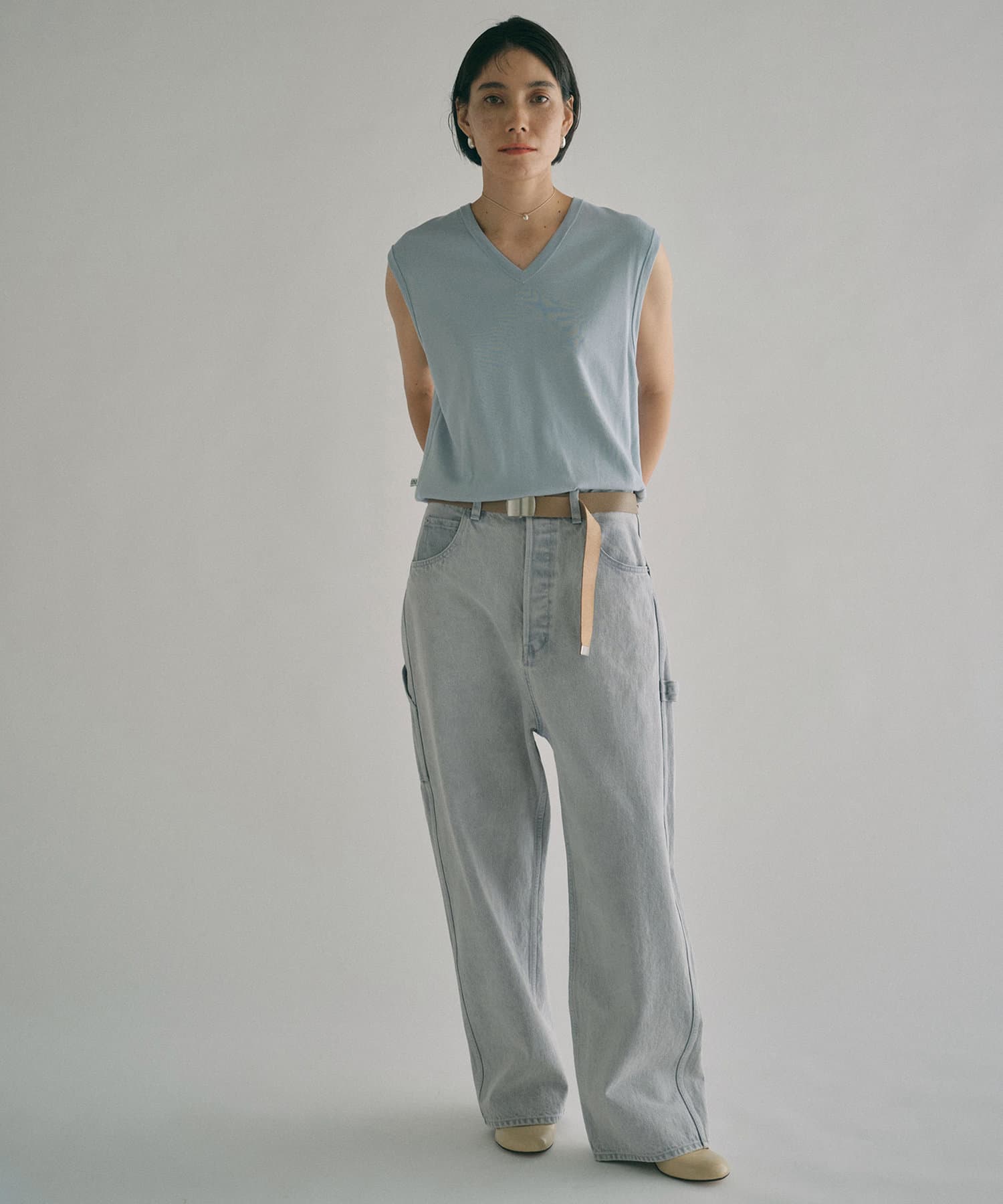 ■深い股上が印象的で、ベルトをしての着用や腰位置に落としての着用など、ウエスト位置を変えてスタイルの幅を楽しめるアイテム。