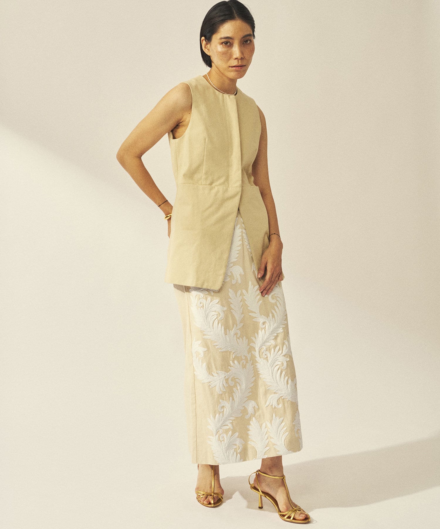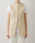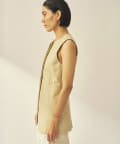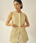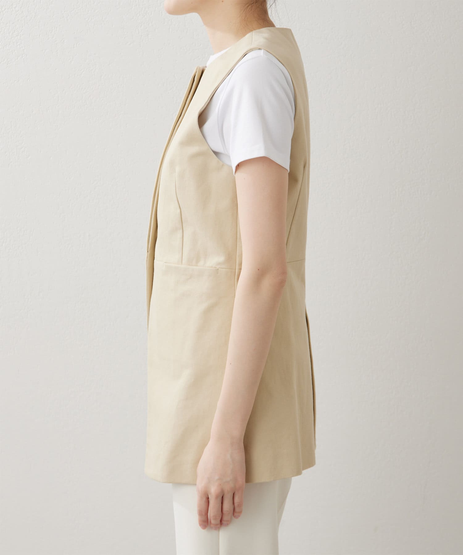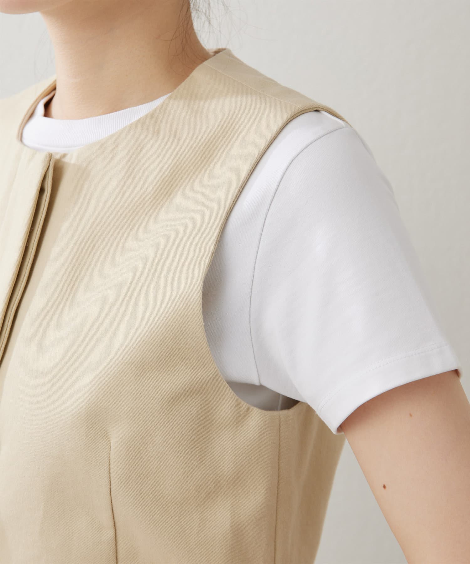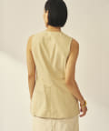 ■フロントボタンを閉じてノースリーブブラウスのように着こなすのもおすすめ。