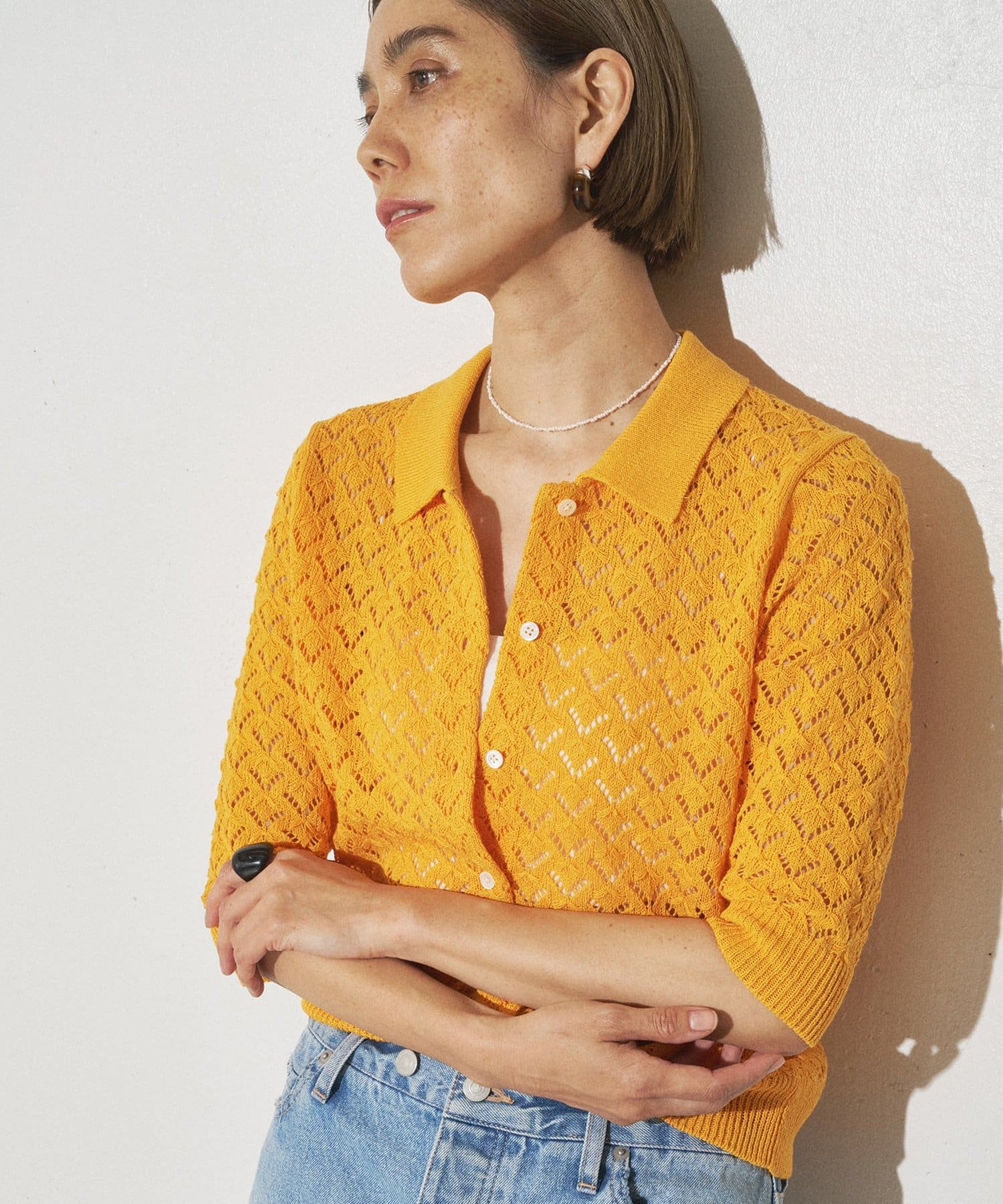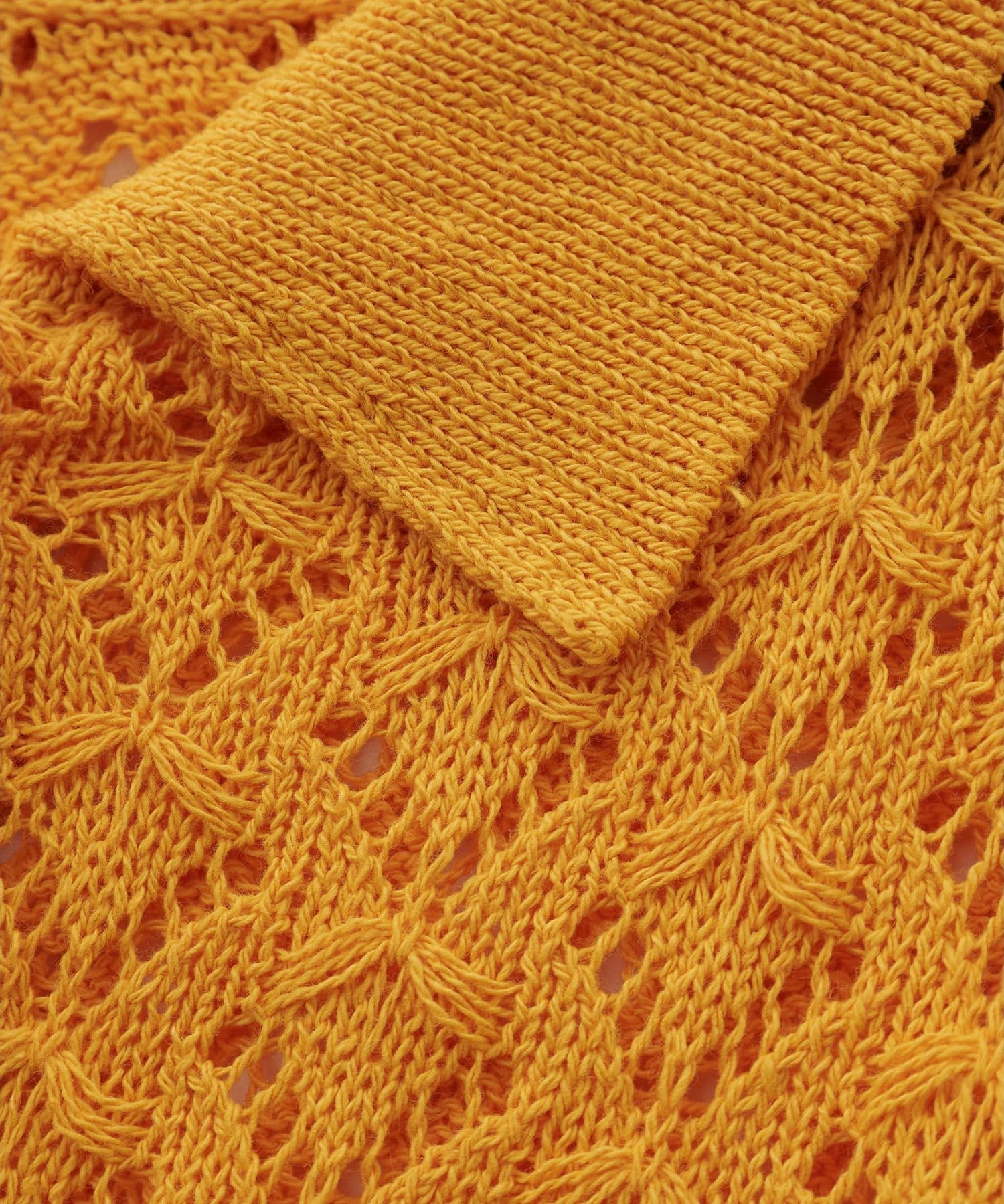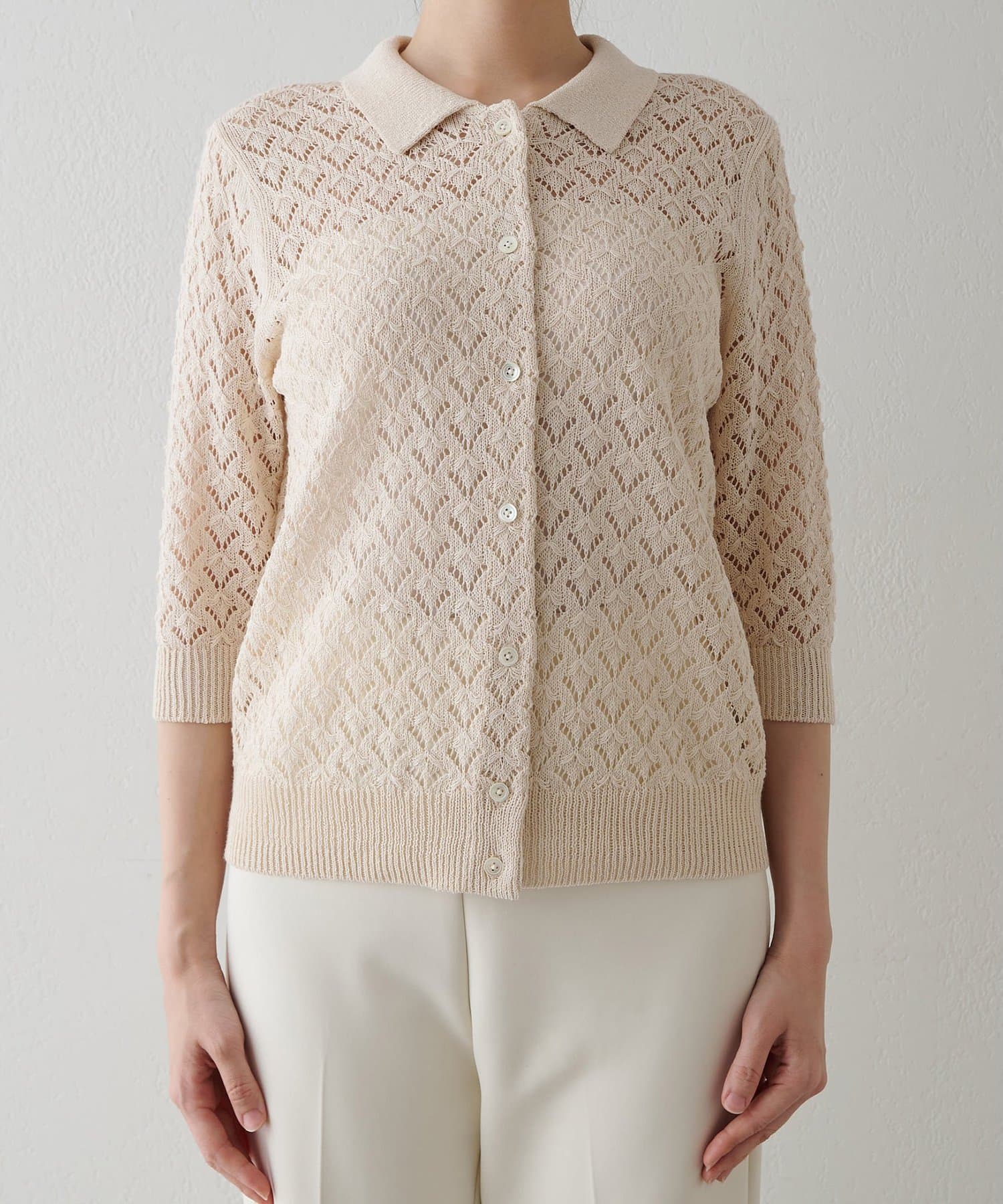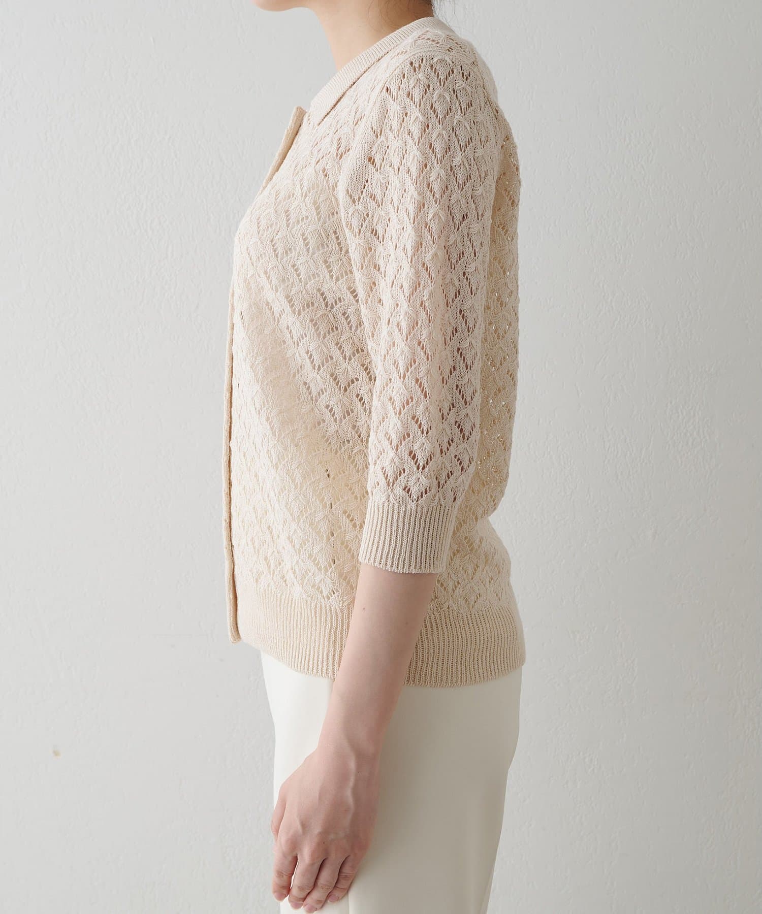 ■コットンに樹脂コーティング加工が施された糸を使用したポロカーディガン。