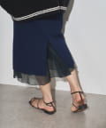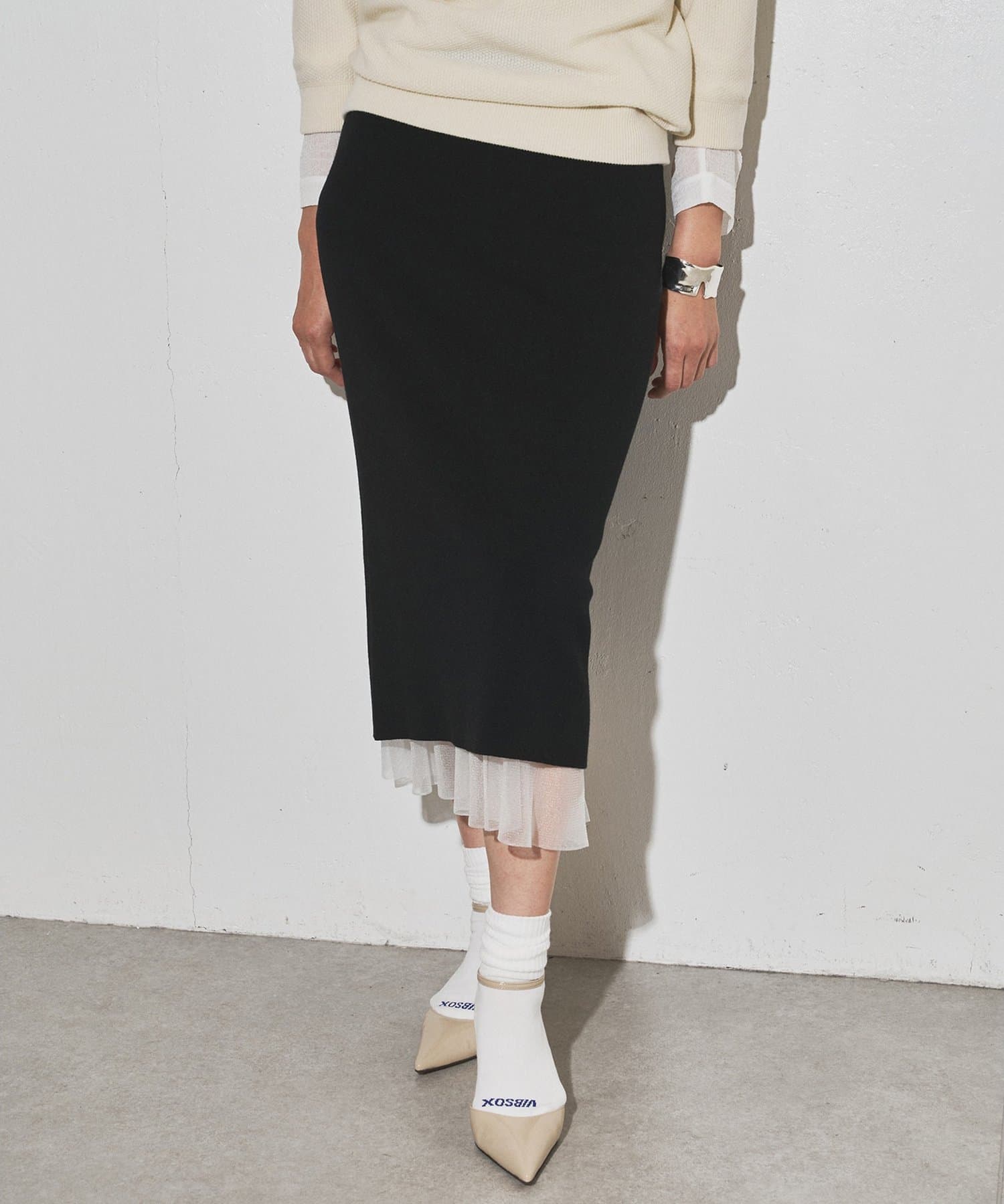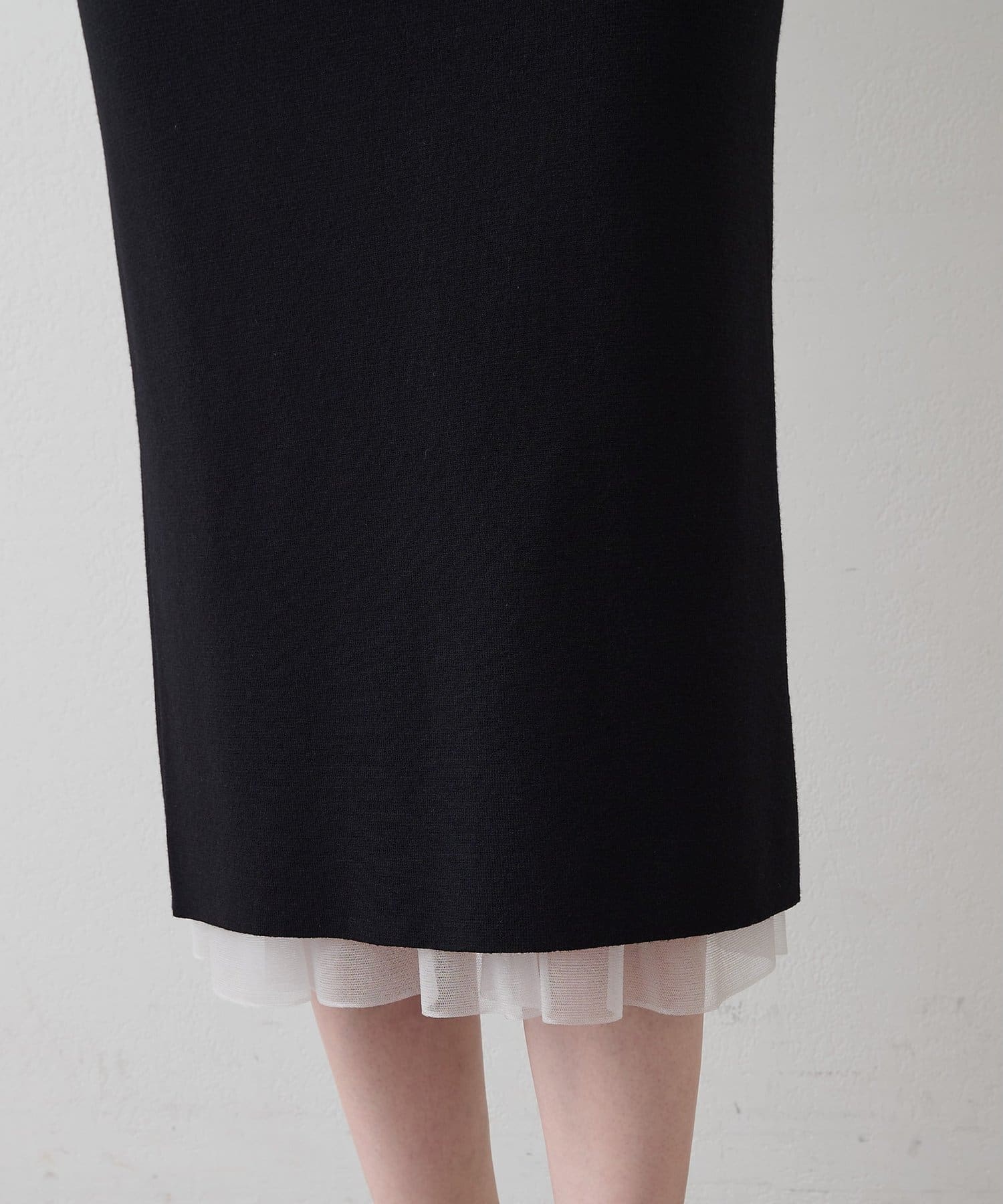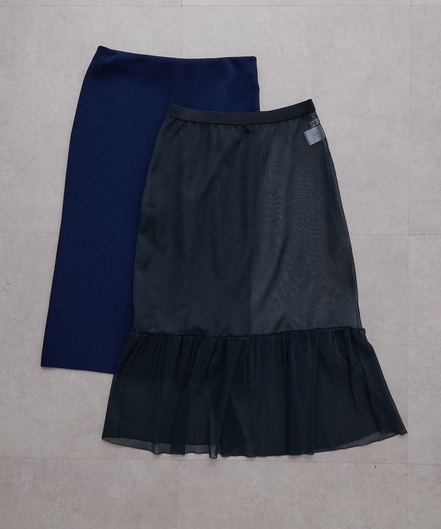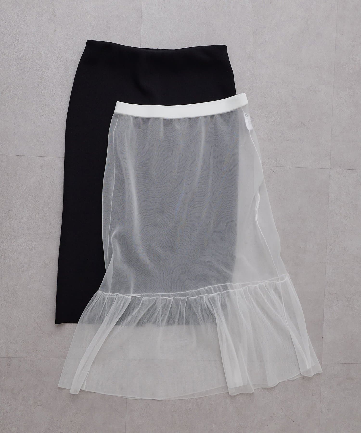 ■透け感のあるスカートをニットスカートにレイヤーして裾からフリルを覗かせるデザイン。