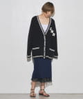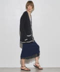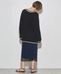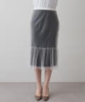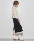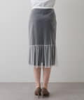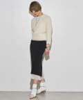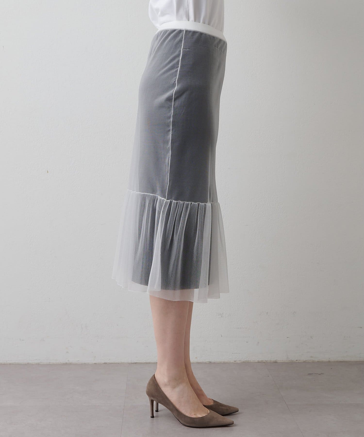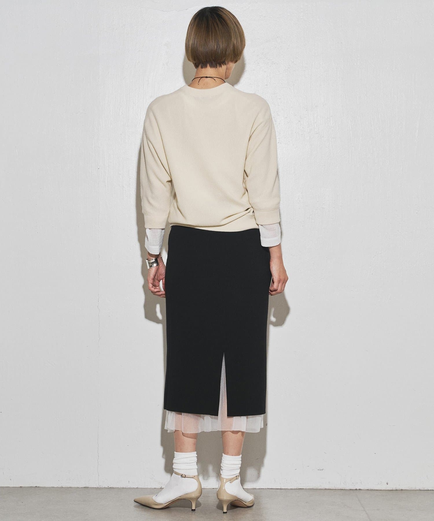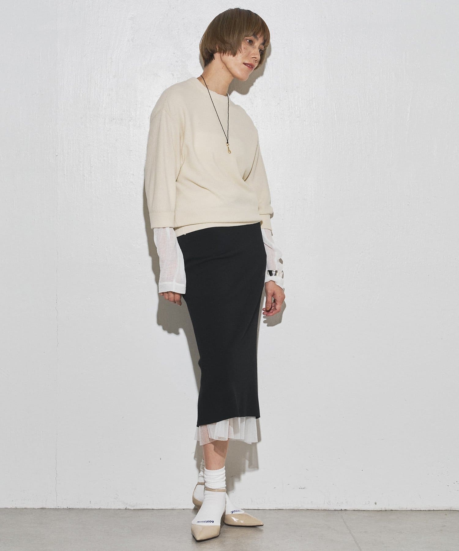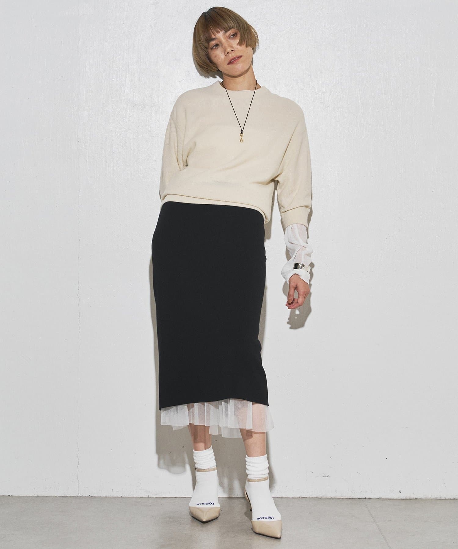 ■透け感のあるスカートをニットスカートにレイヤーして裾からフリルを覗かせるデザイン。