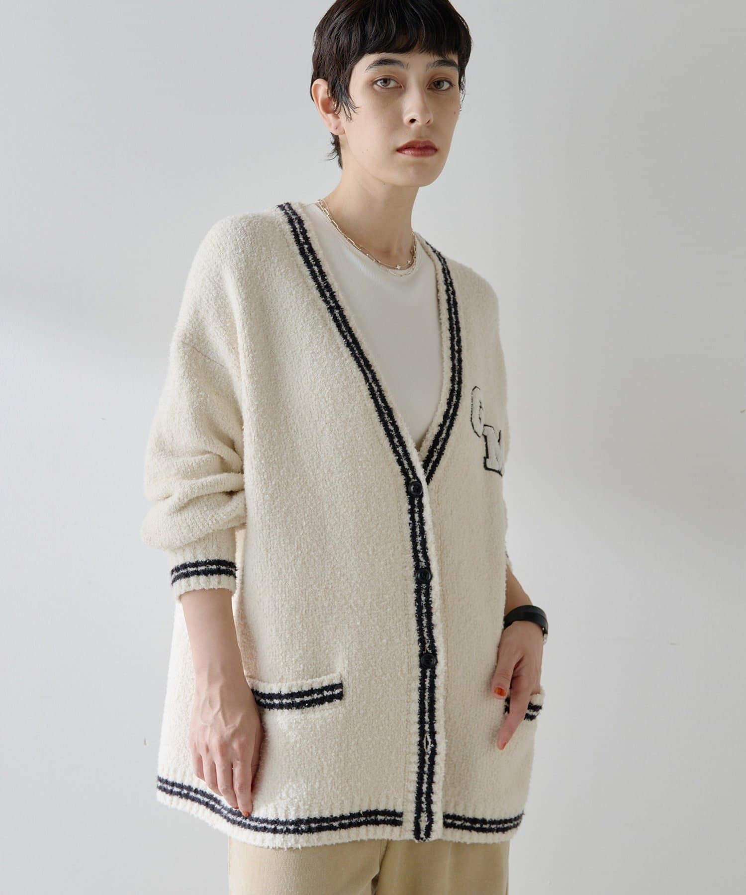 プレッピーに楽しめる、ワッペン付きニットカーディガン