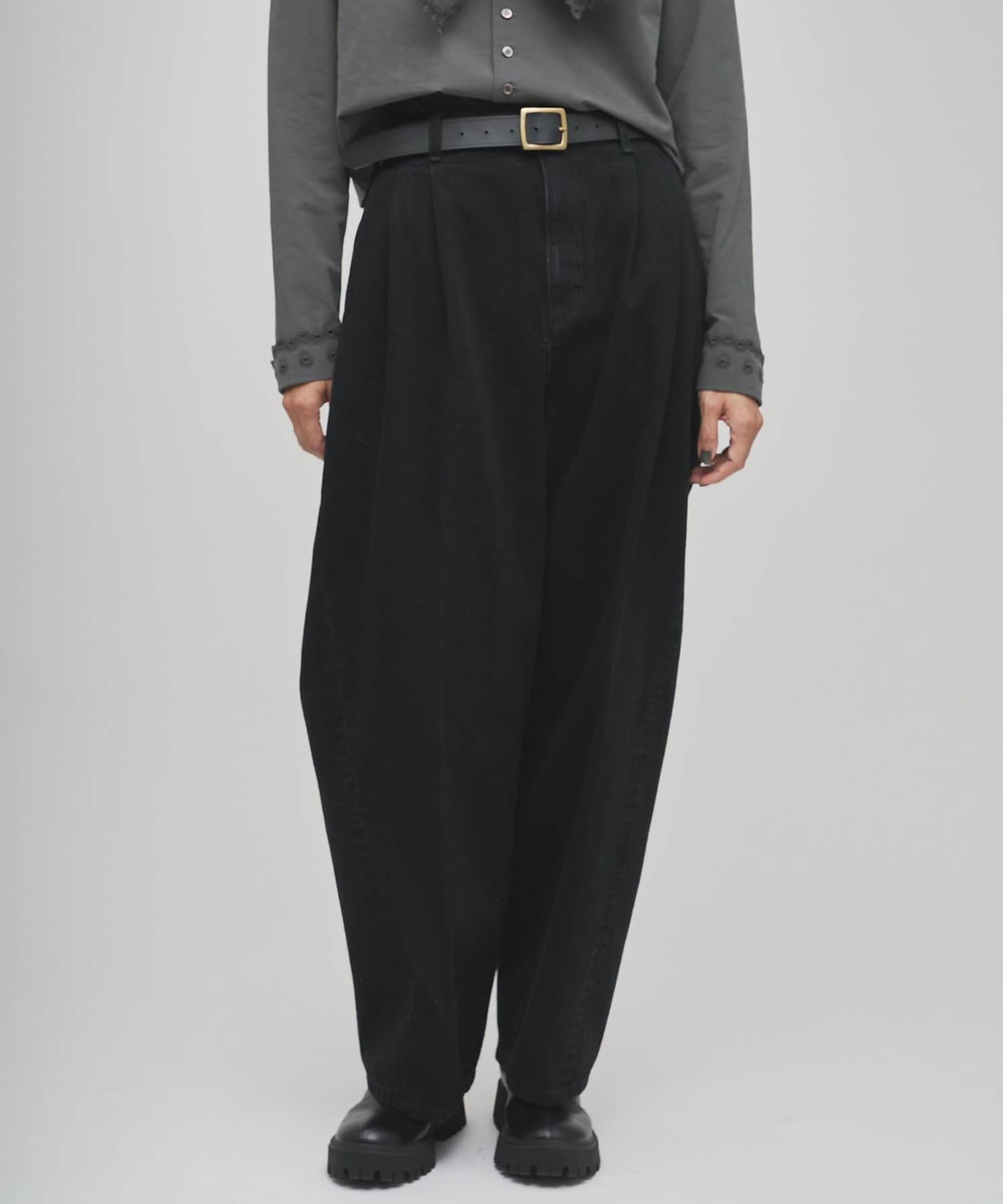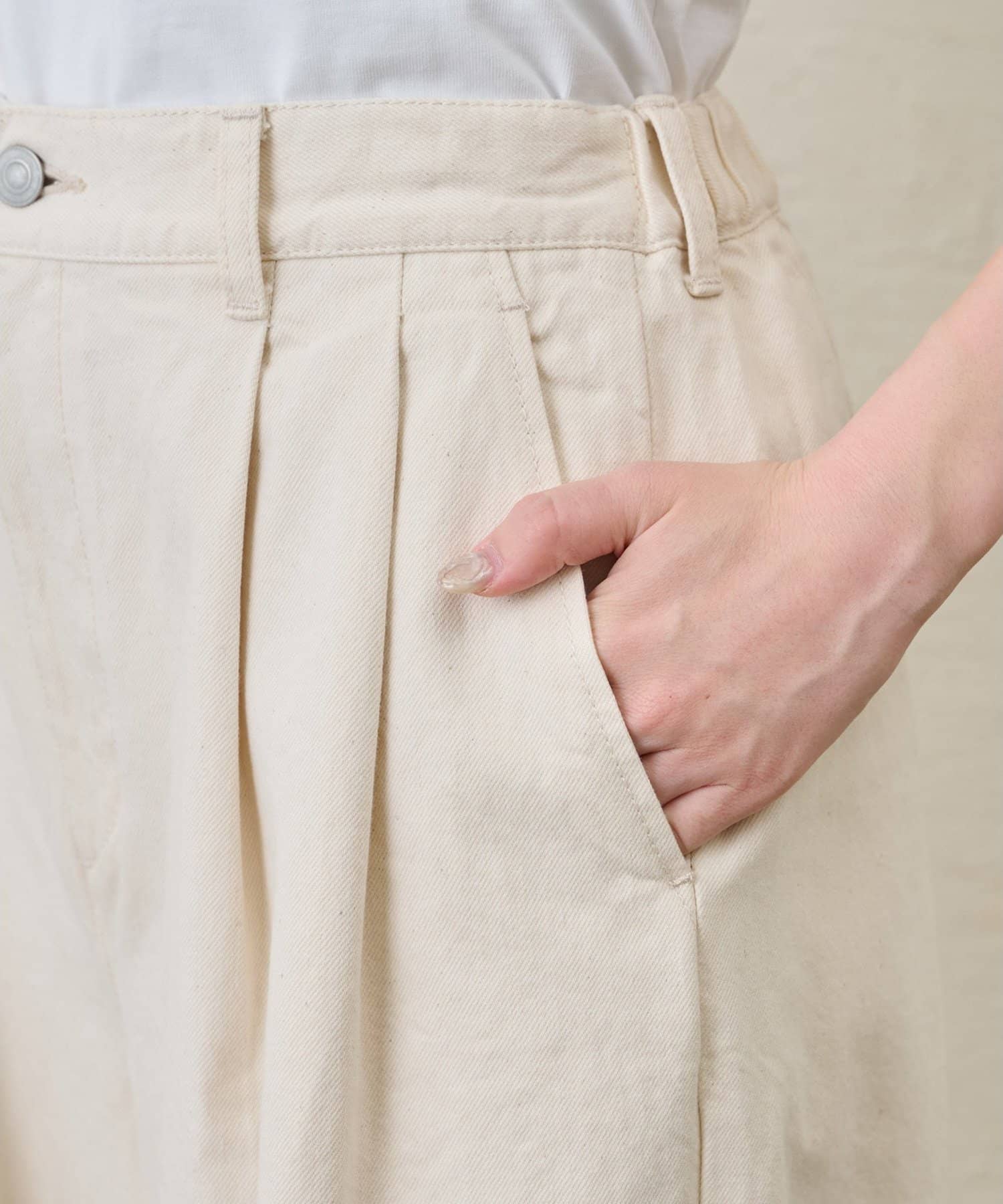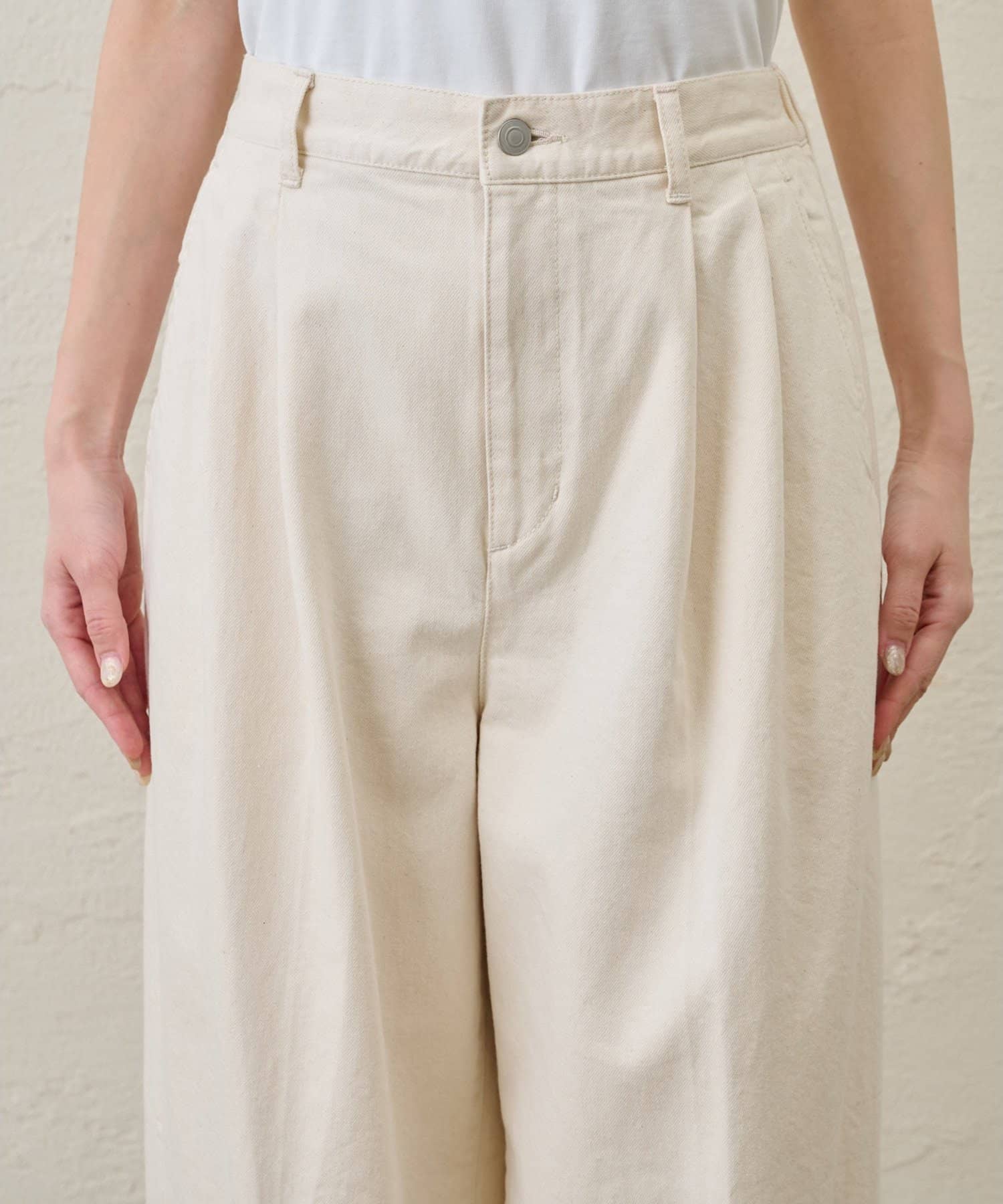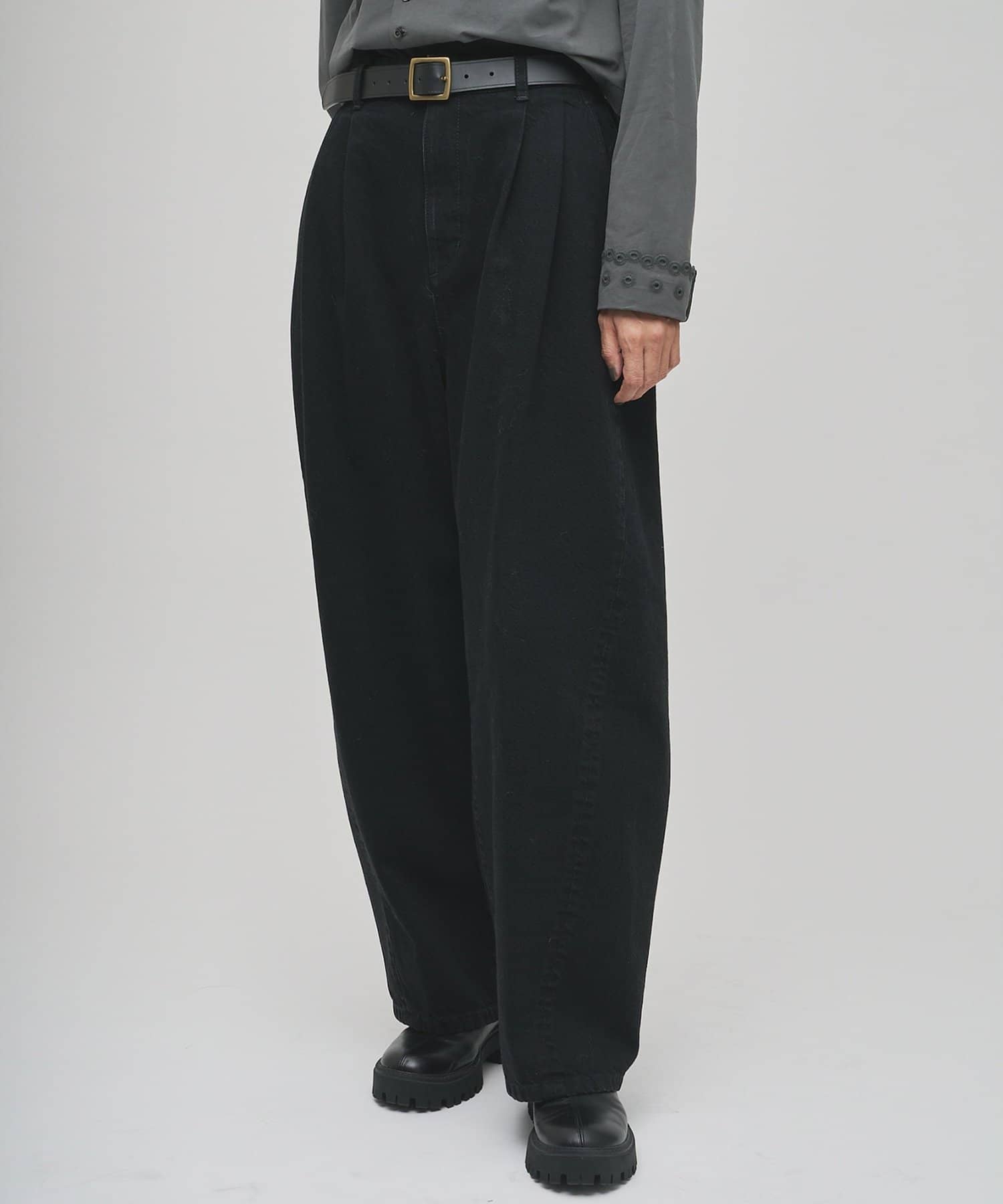 ■11オンスの国内デニム生地を使用したタックパンツ。