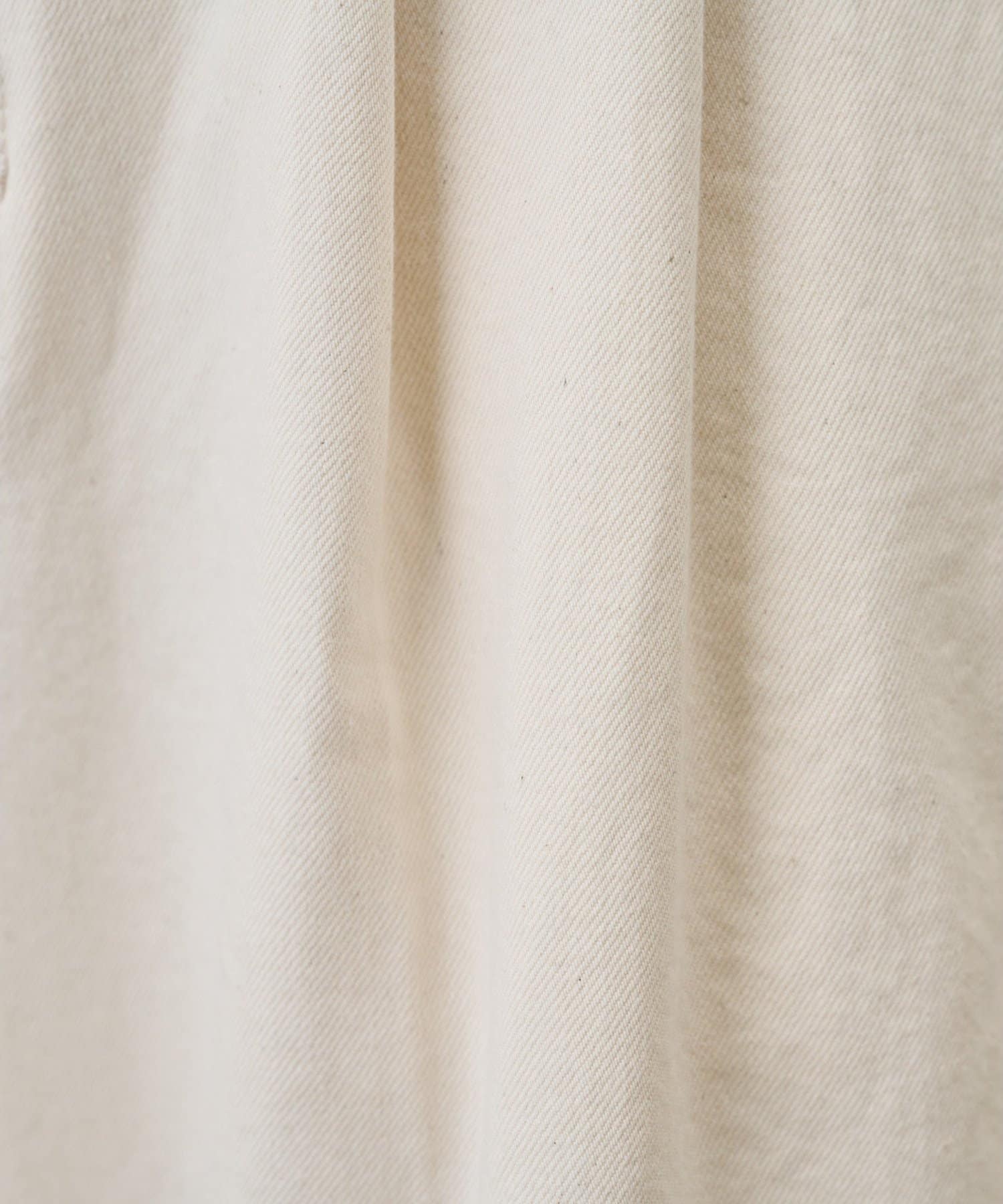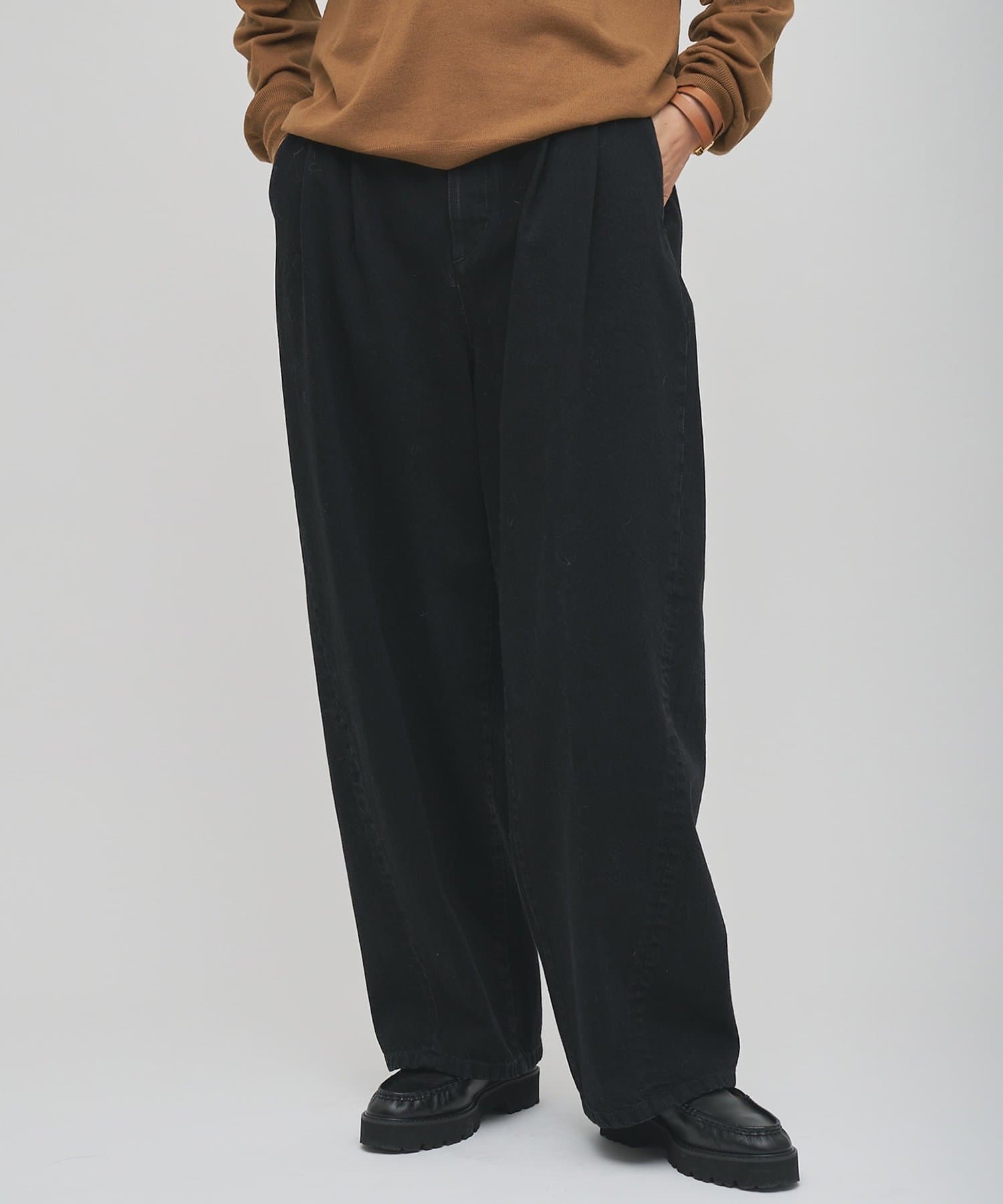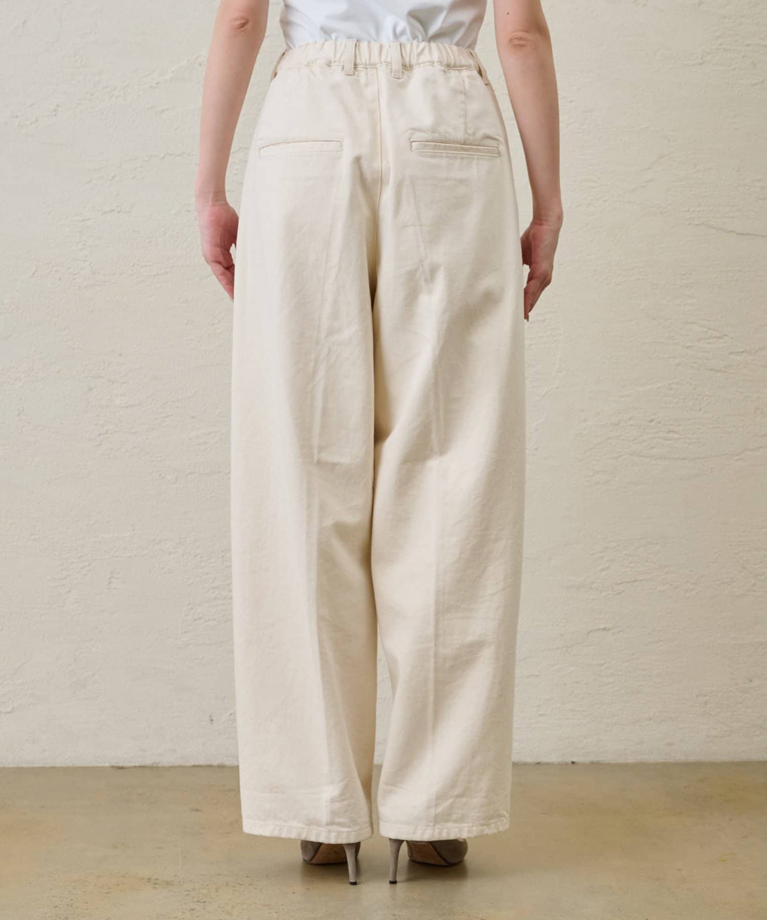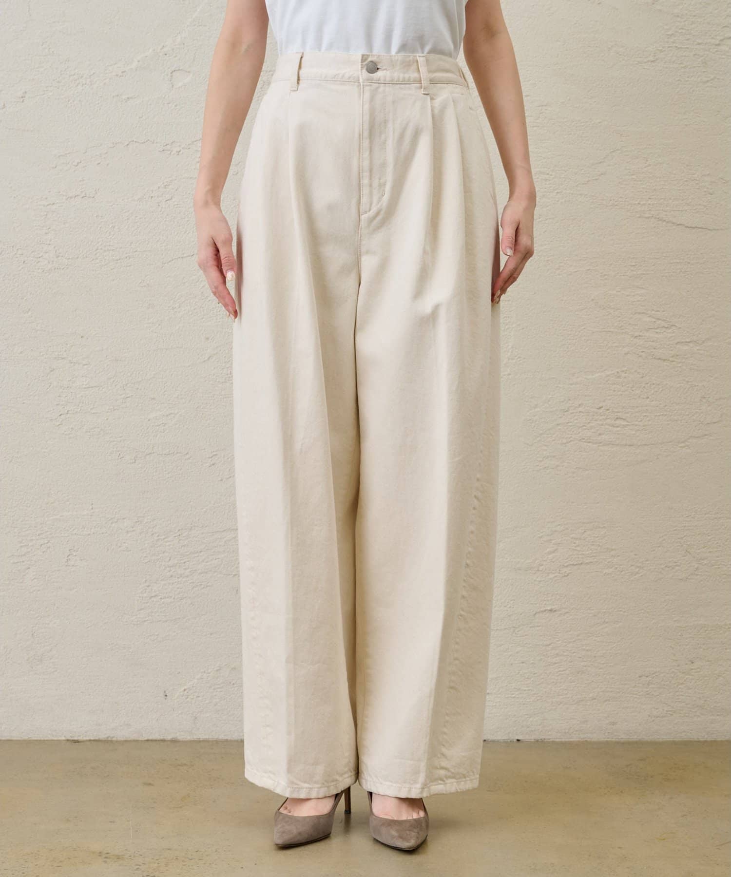 ■11オンスの国内デニム生地を使用したタックパンツ。