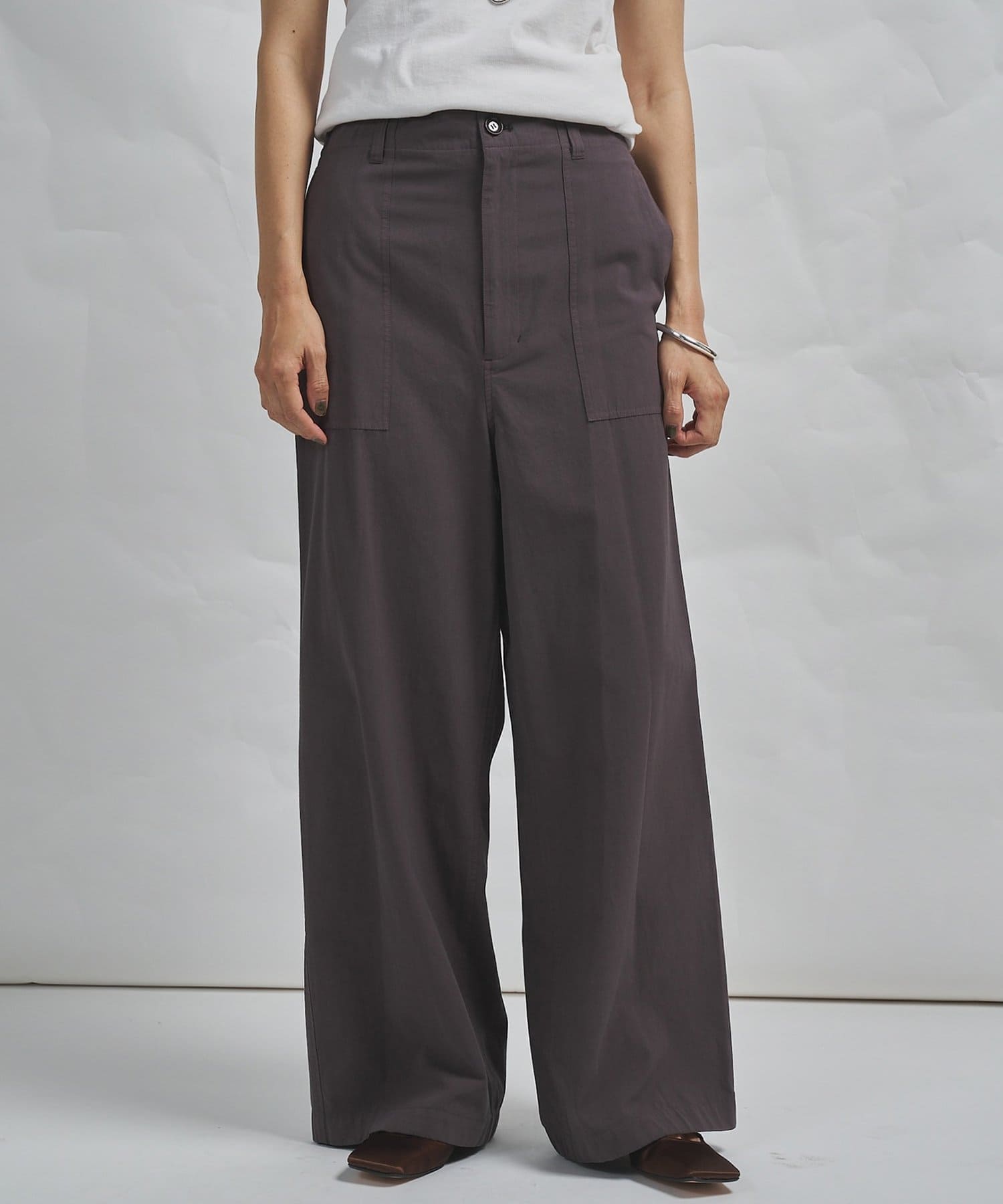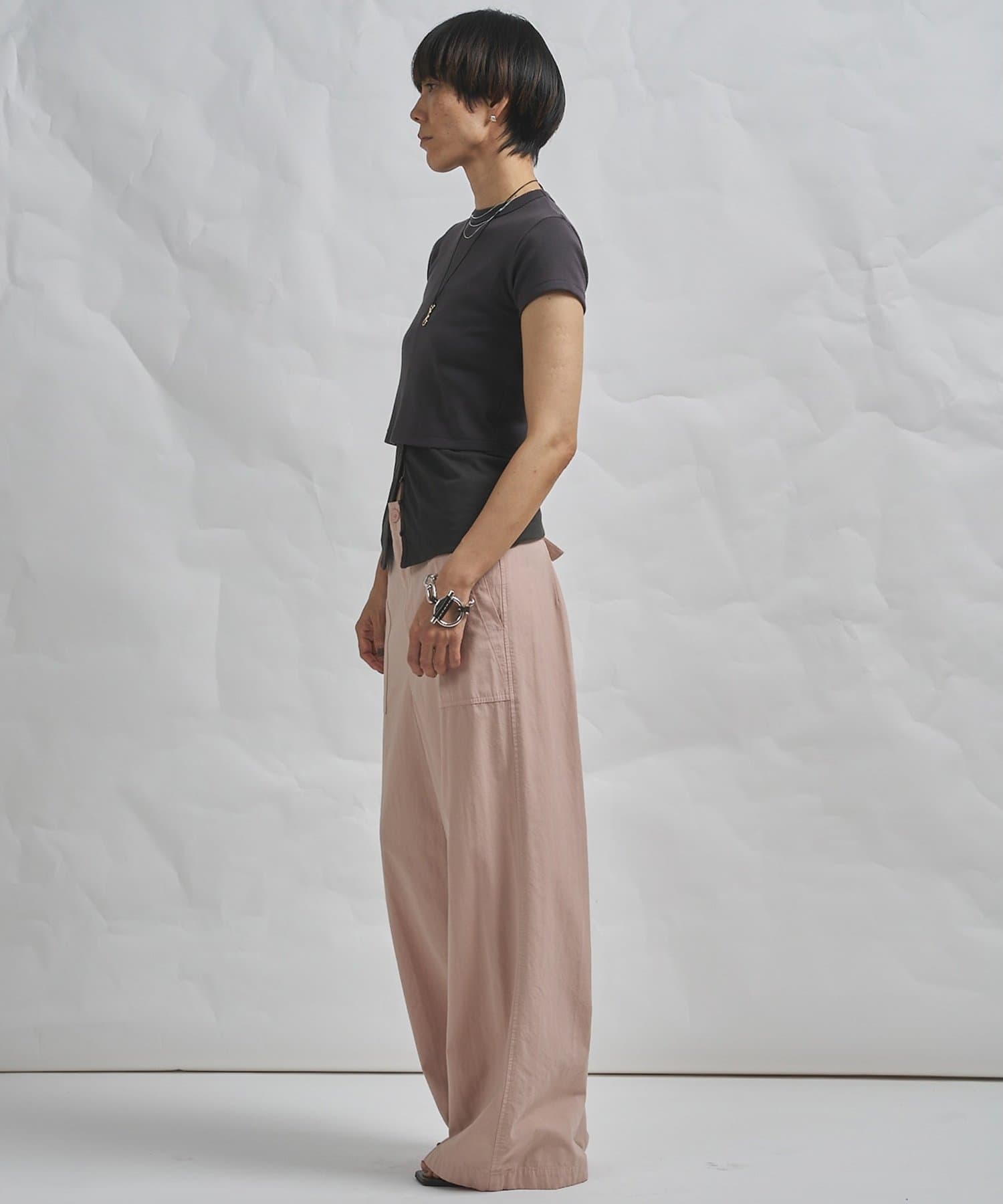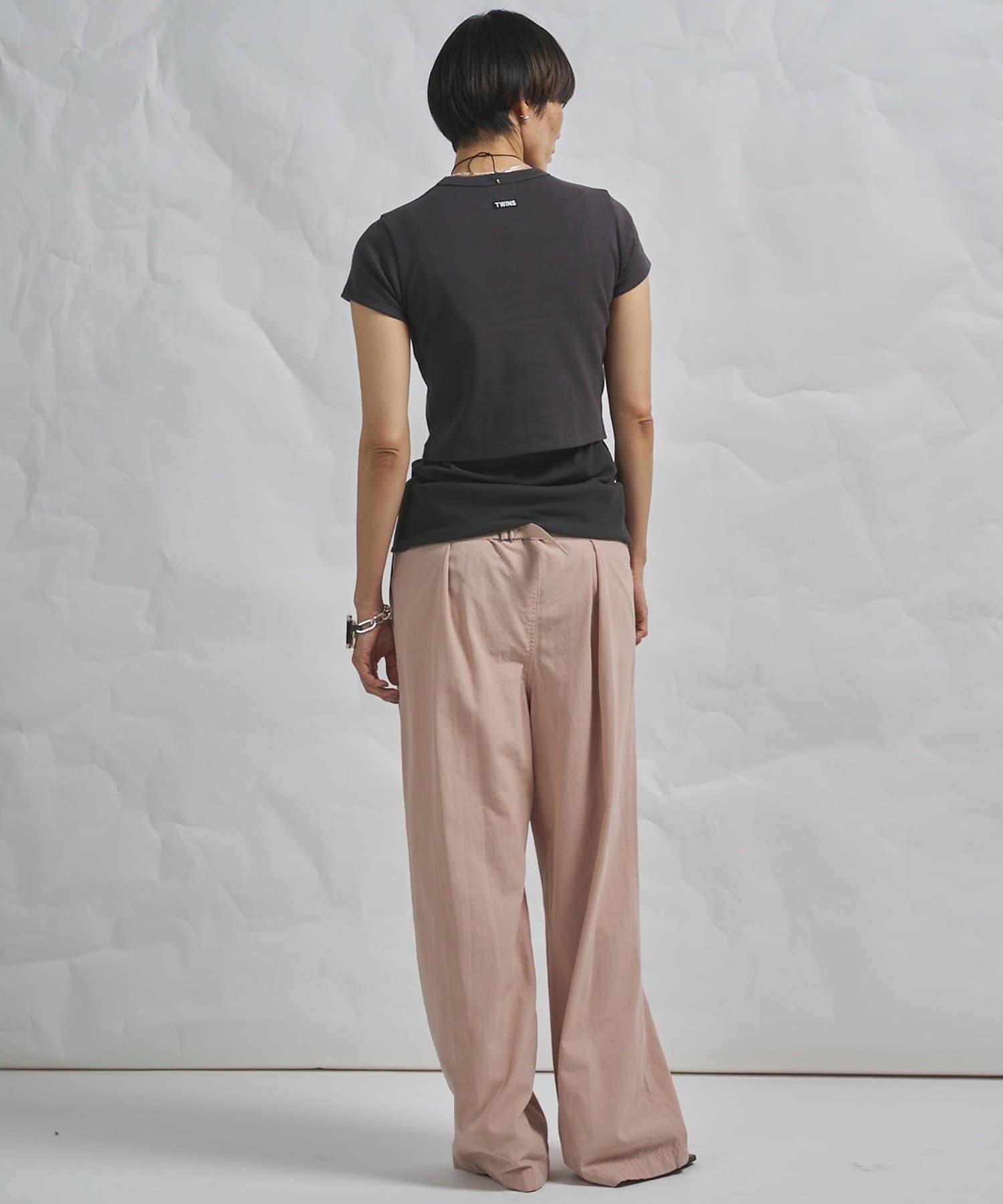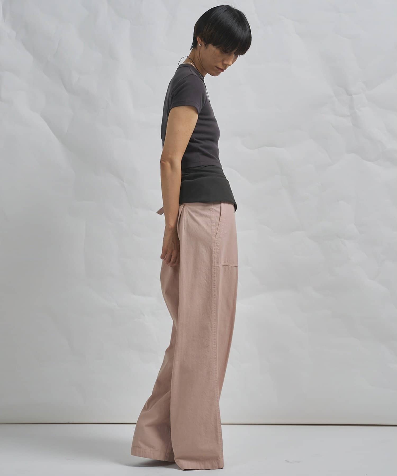 ■ガーメントダイで仕上げた強撚ガスボイルのオックス素材を使用したワイドパンツ。