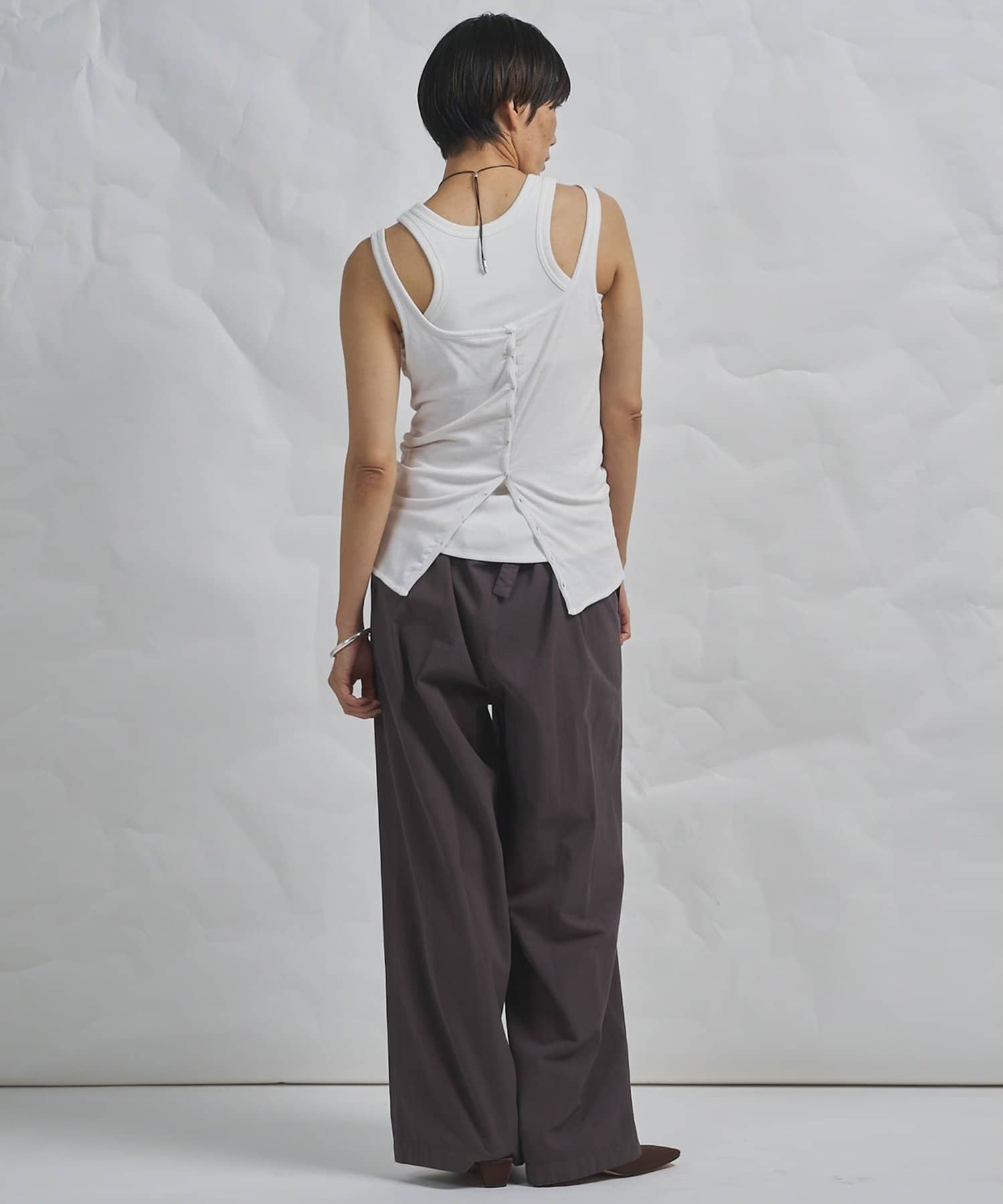 ■ウエストの内側のストリングを使用してイージーパンツとしても楽しめ、裾のストリングを絞れば裾のラインもアレンジ可能。