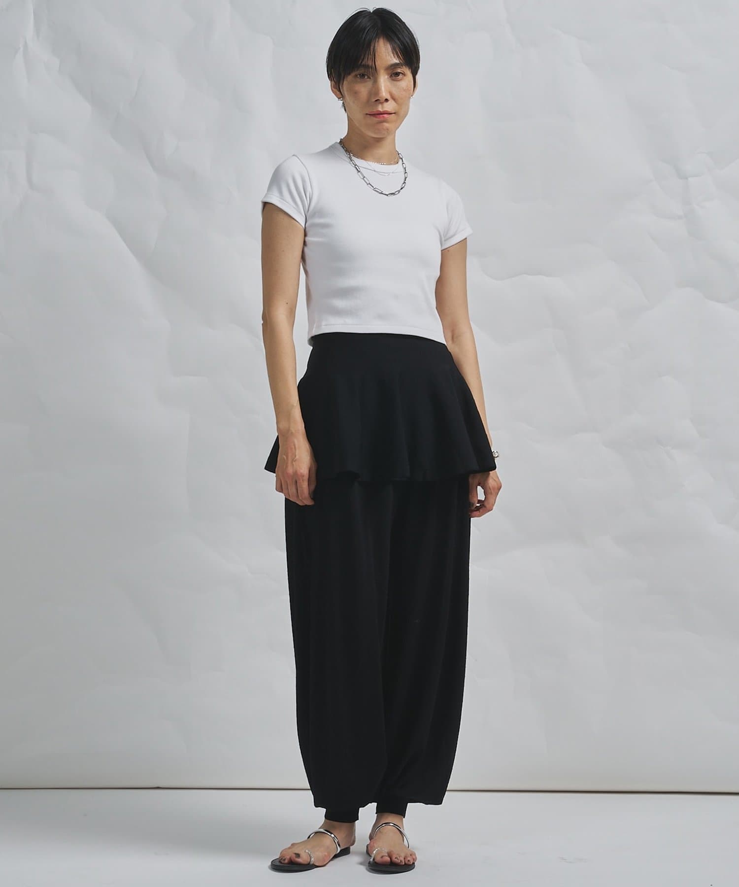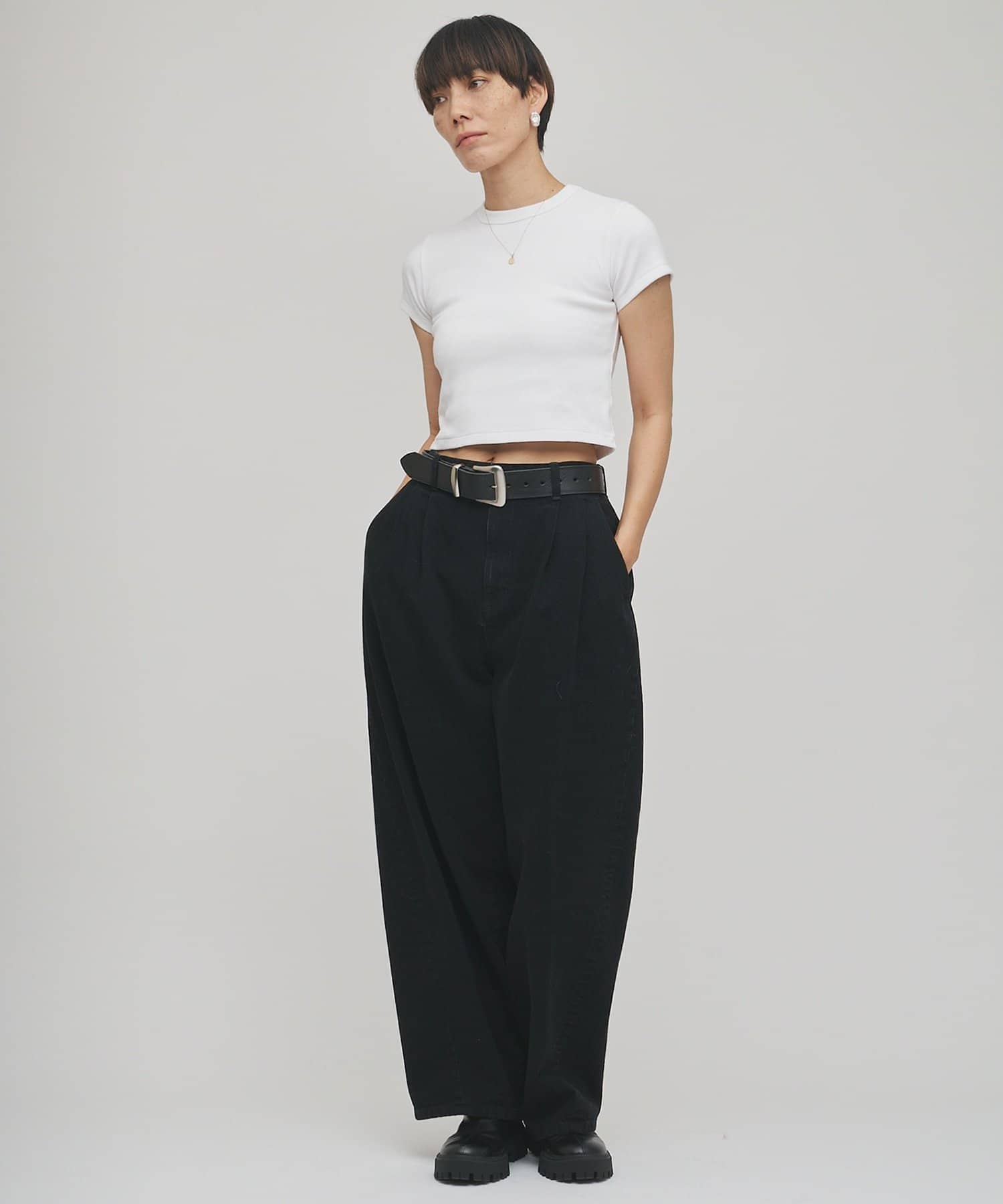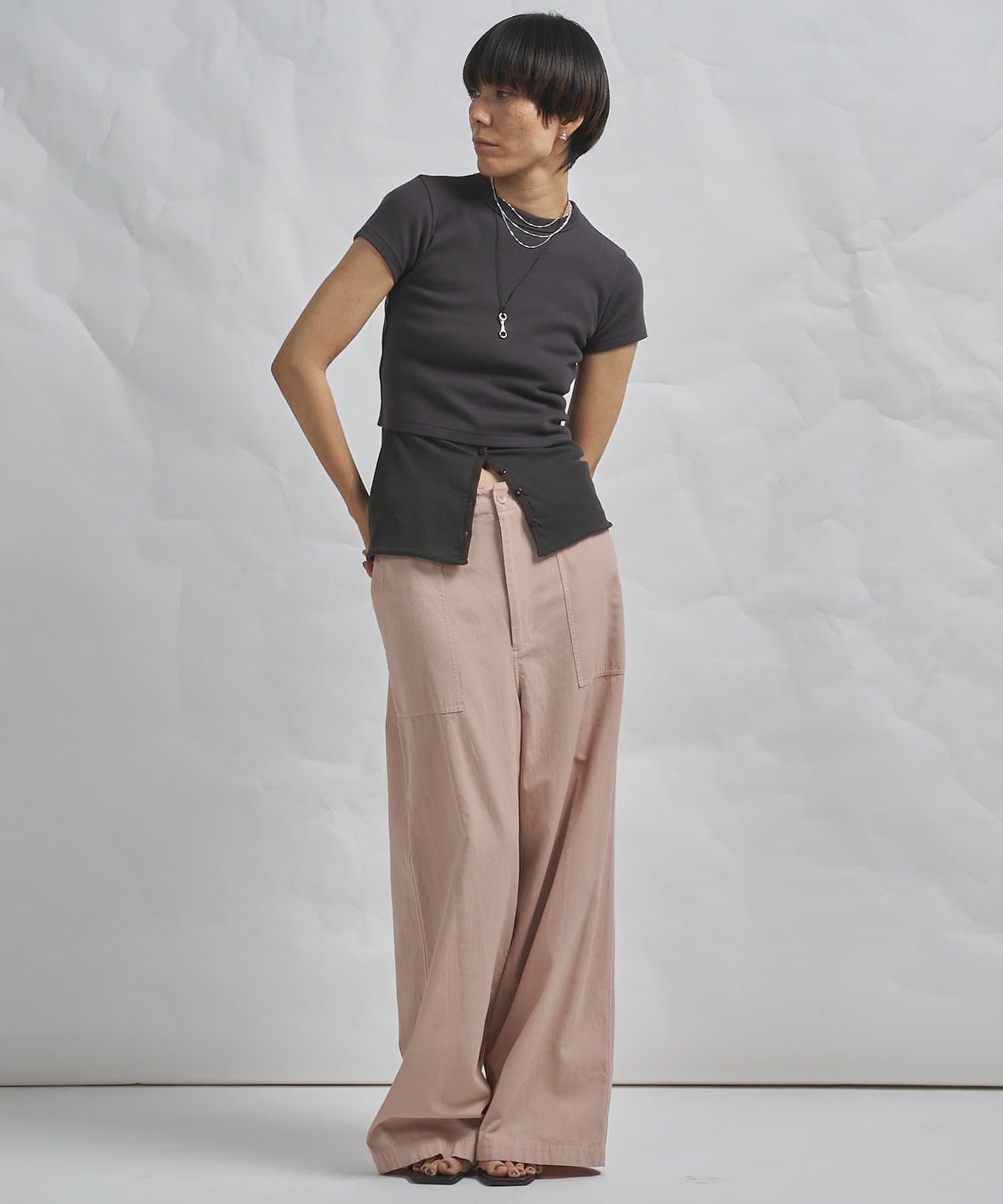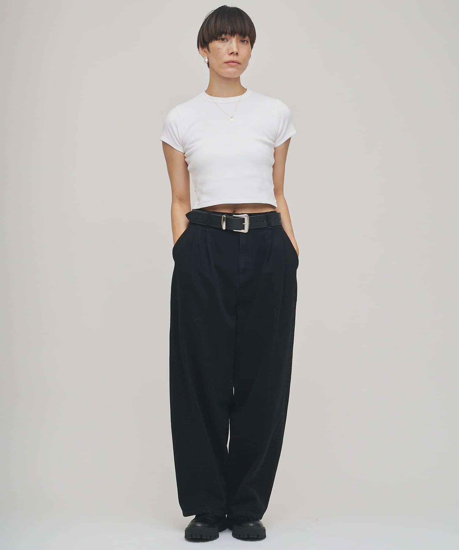 ■すっきりとしたタイトなシルエットは、ボリューム感のあるボトム合わせがおすすめ。