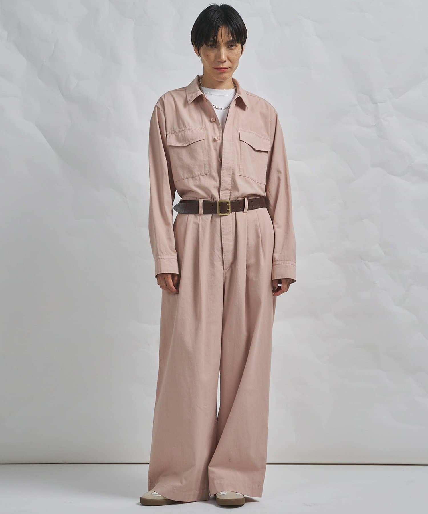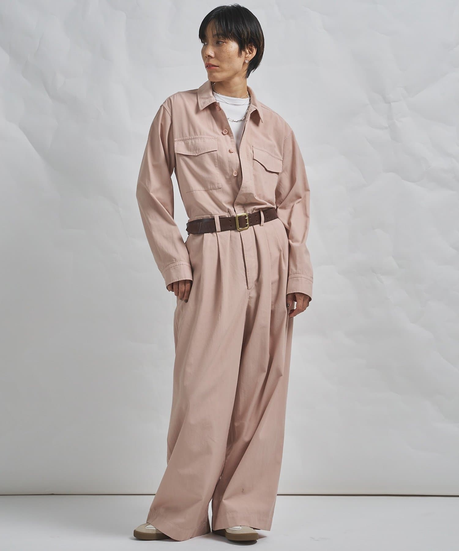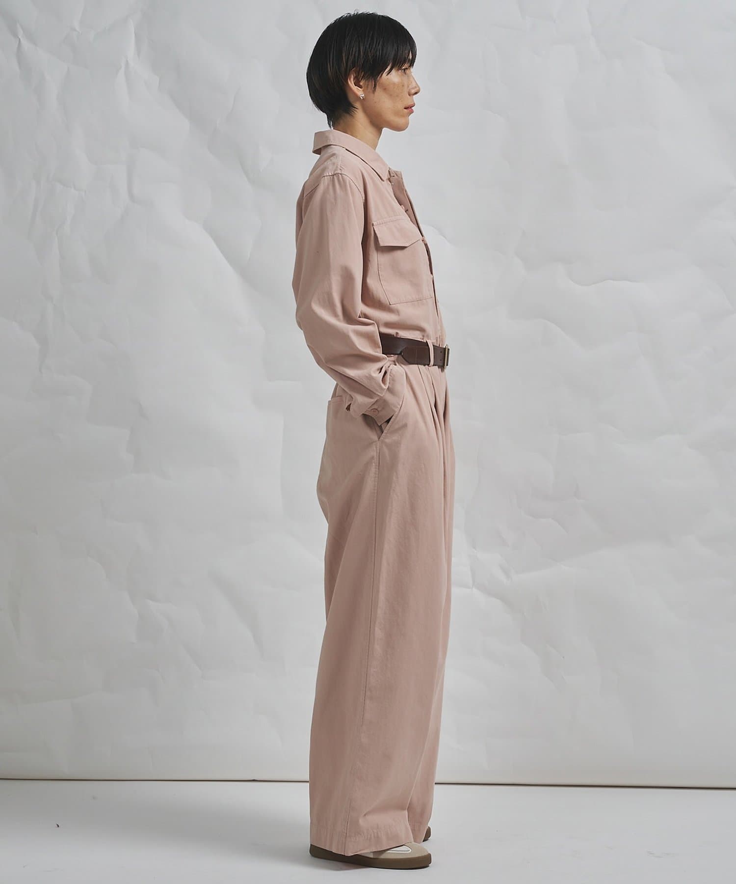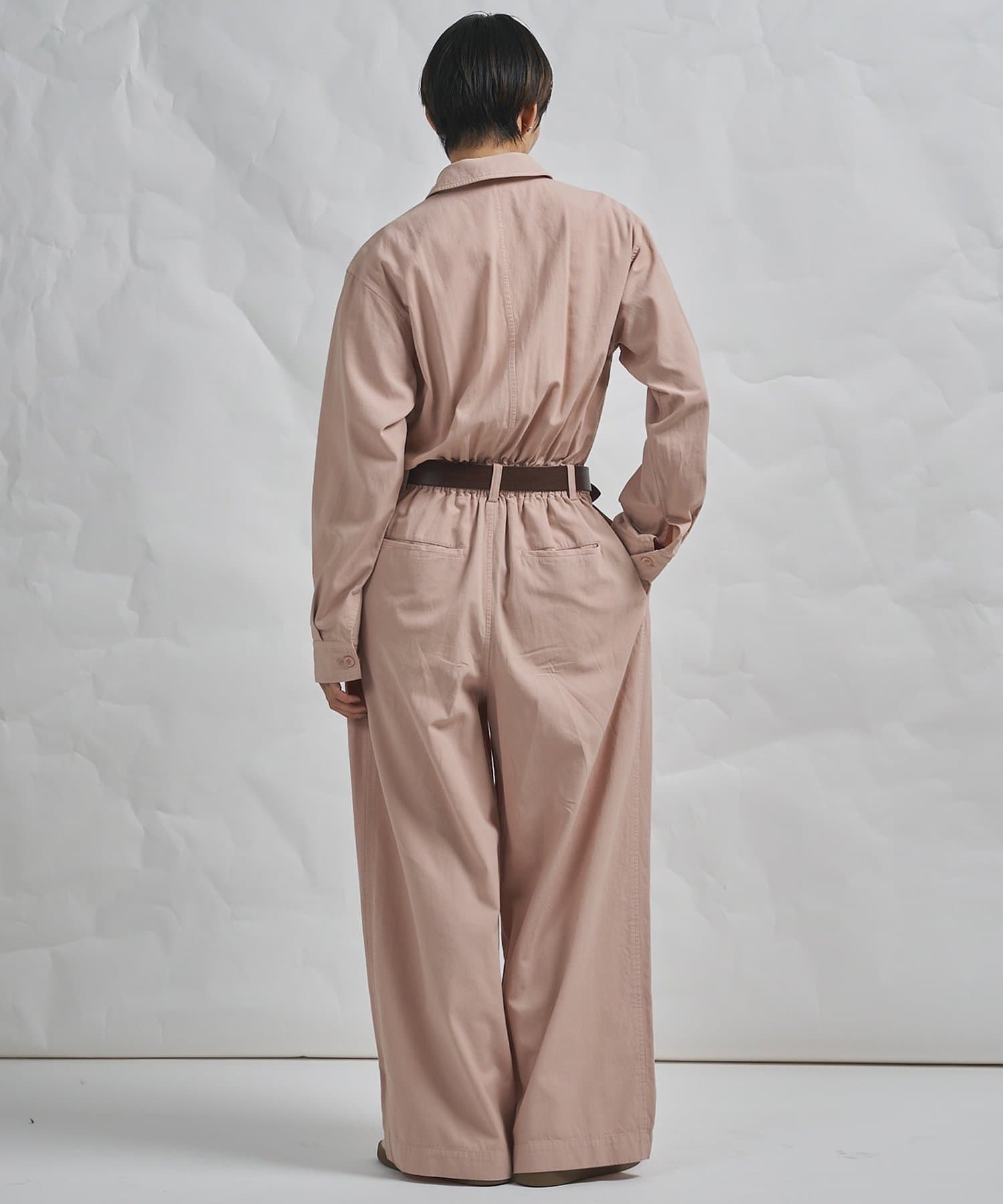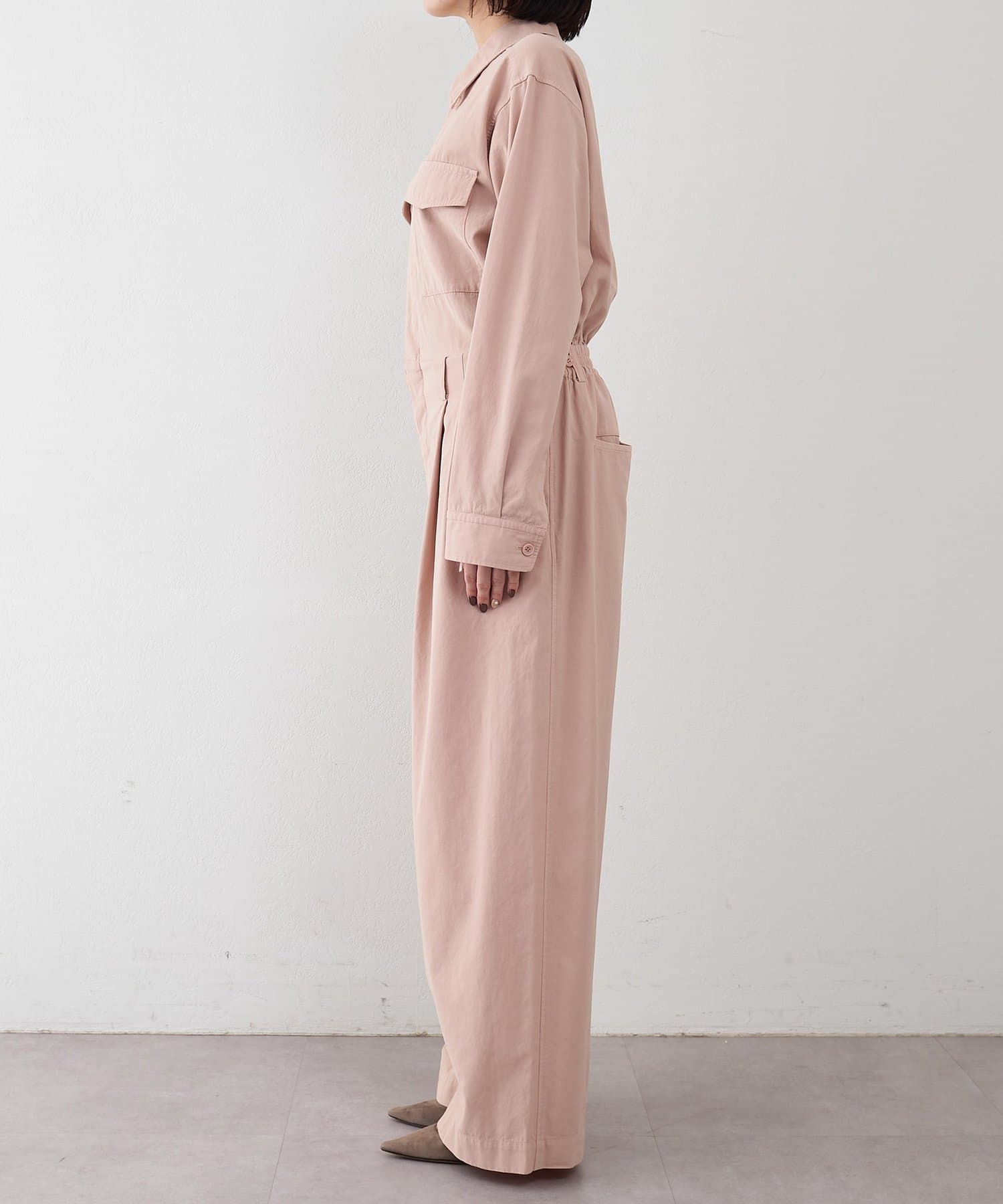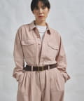 ■ガーメントダイで仕上げた強撚ガスボイルのオックス素材を使用したジャンプスーツ。