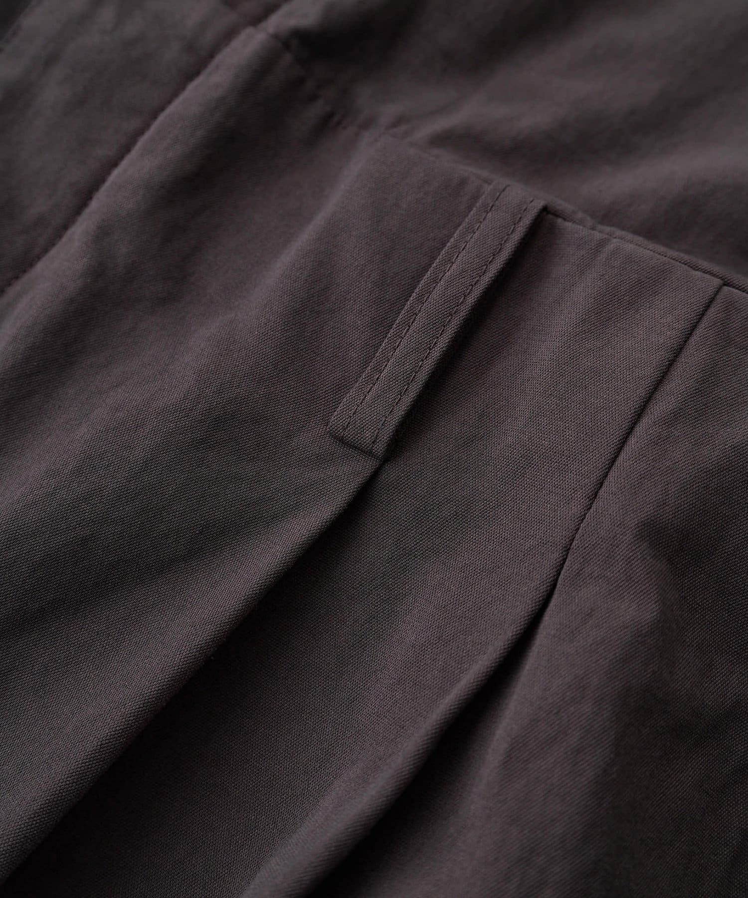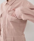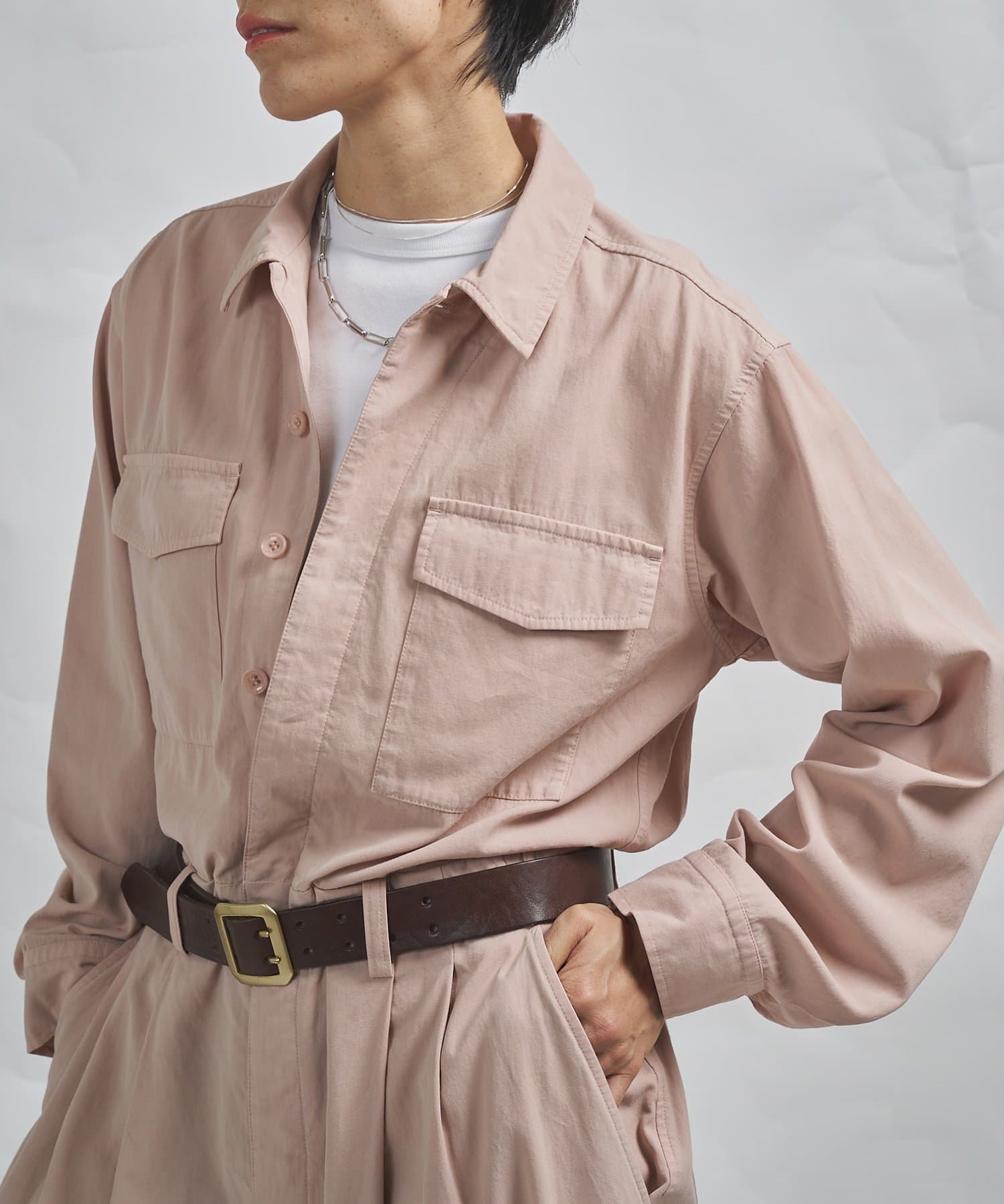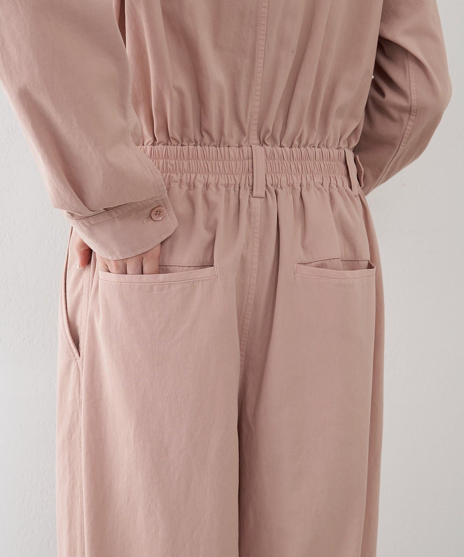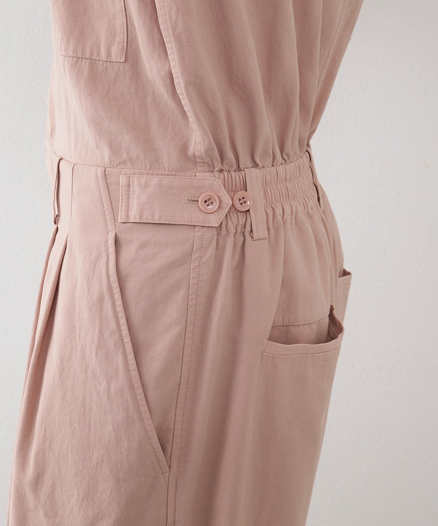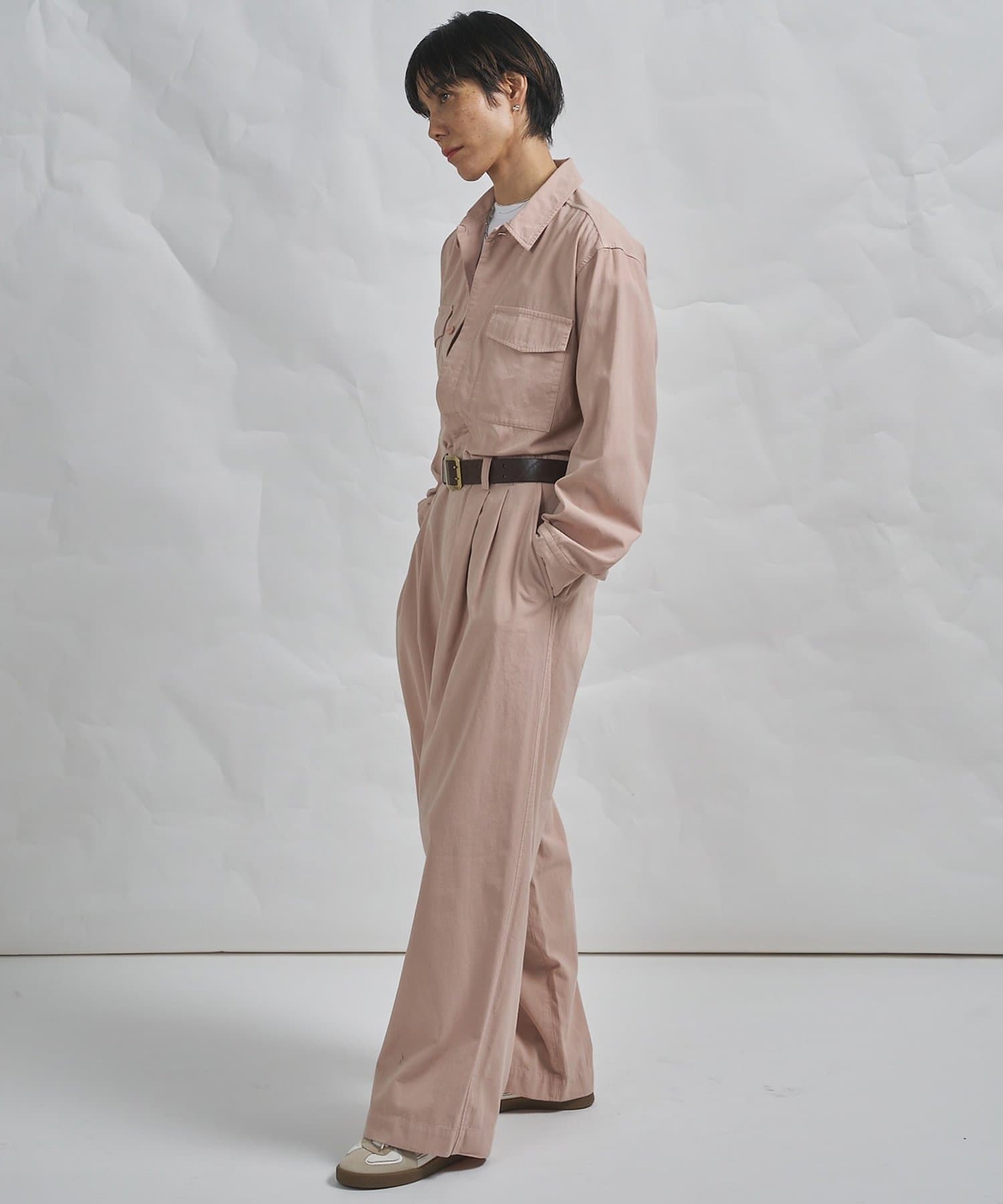 ■ガーメントダイで仕上げた強撚ガスボイルのオックス素材を使用したジャンプスーツ。