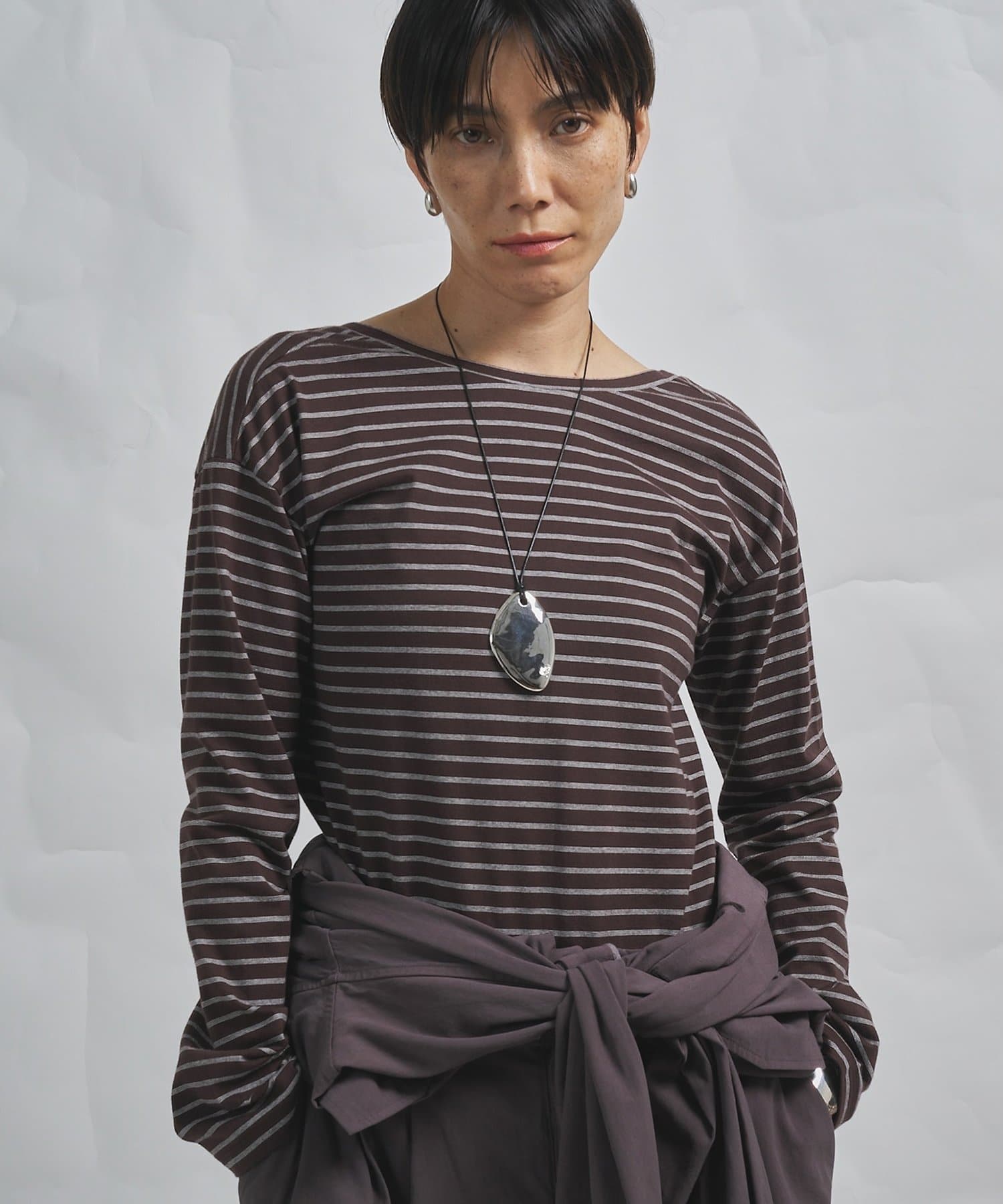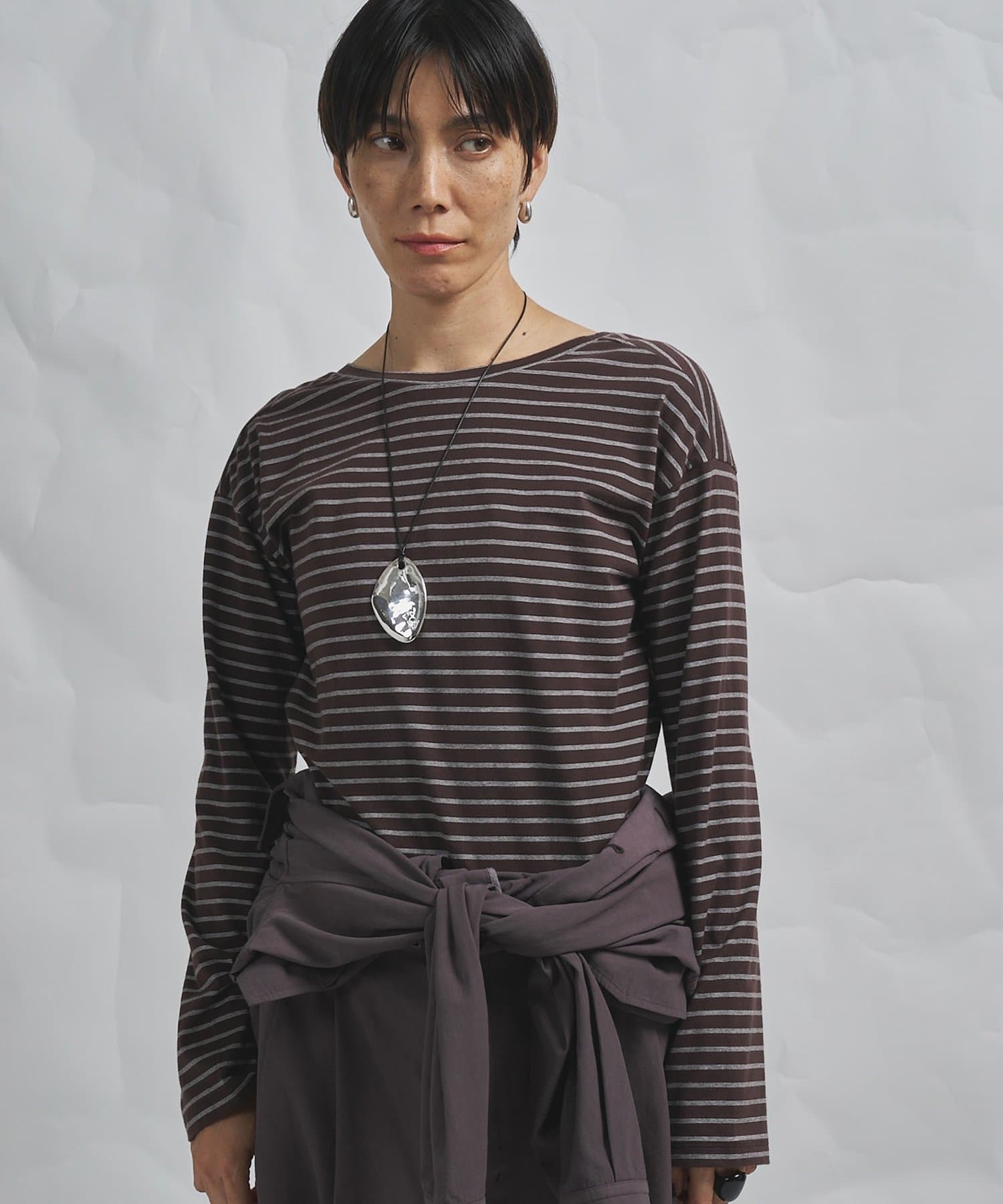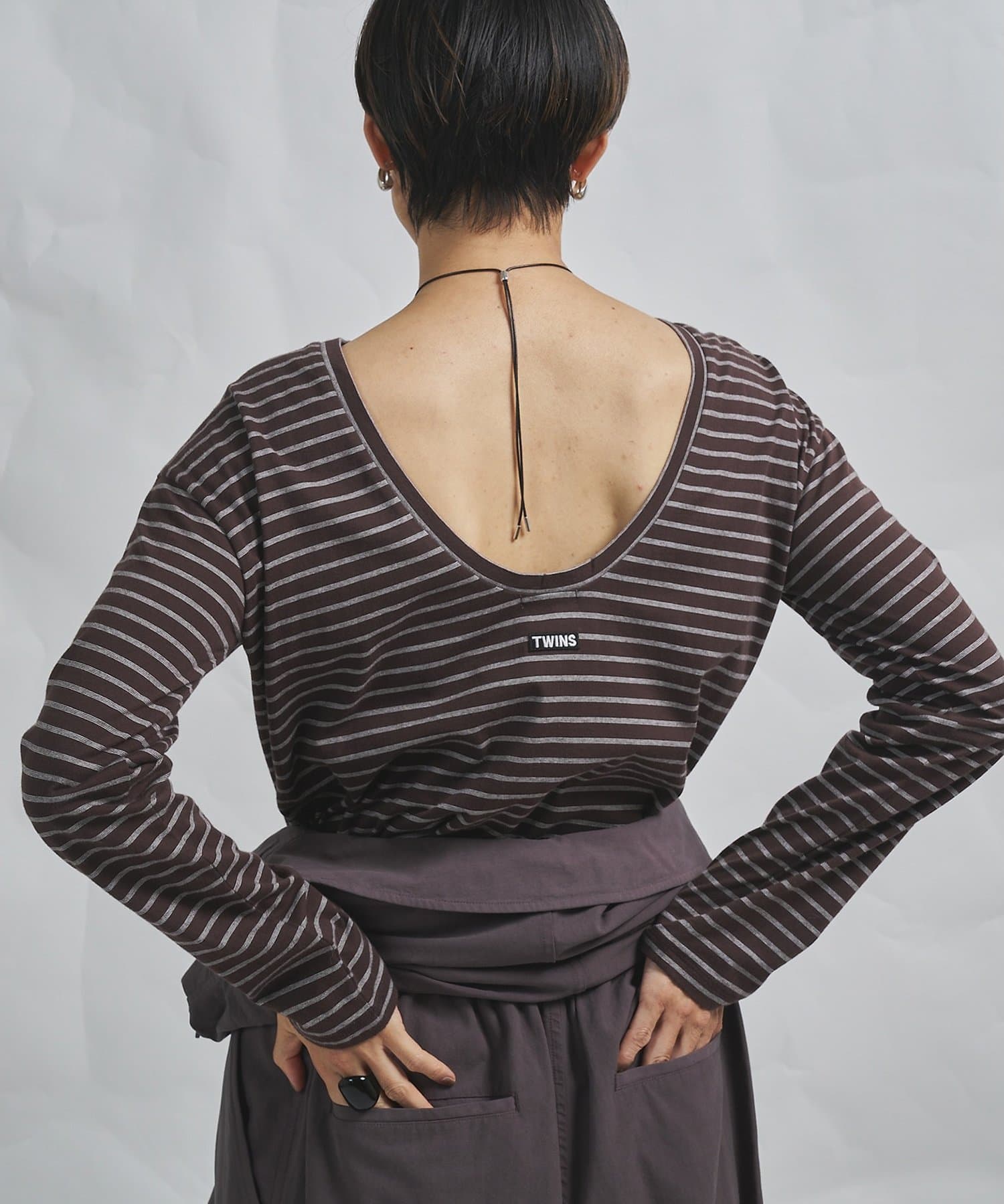 ■背中の開きが特徴的なロングスリーブのボーダーカットソー。
