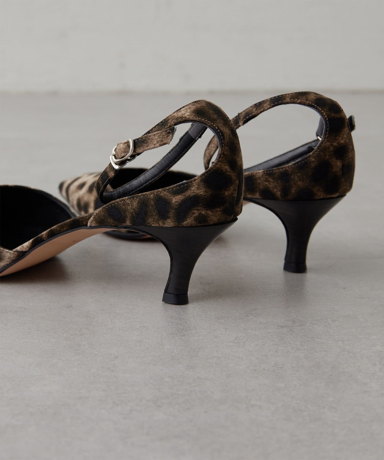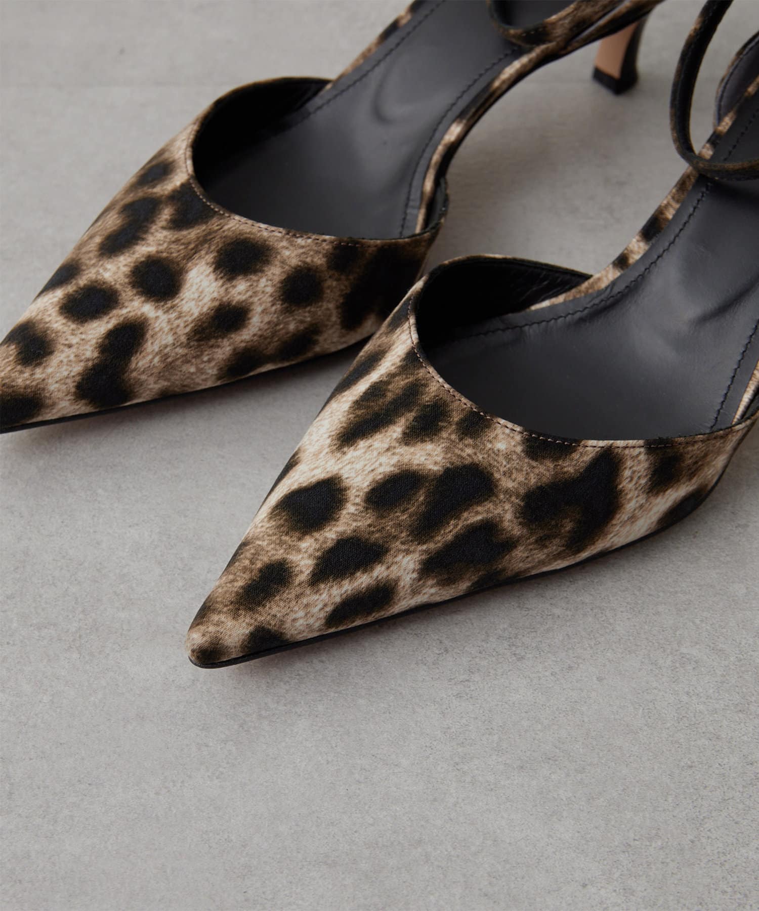 ■サテン素材のレオパードが目を惹くストラップパンプス。