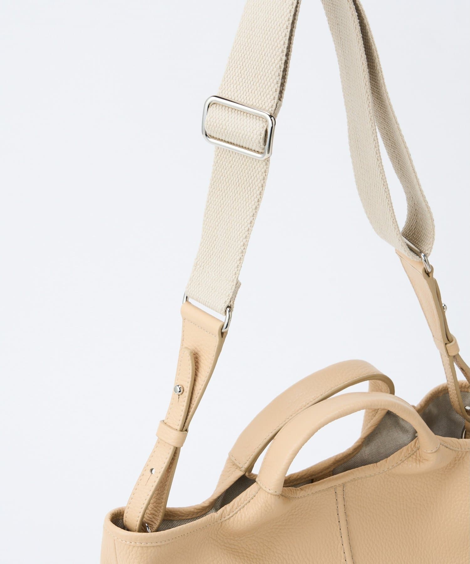 ■太めのテープショルダーストラップは付け位置の調整が可能で、スタイルやシーンに合わせた持ち方のアレンジも◎。
