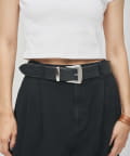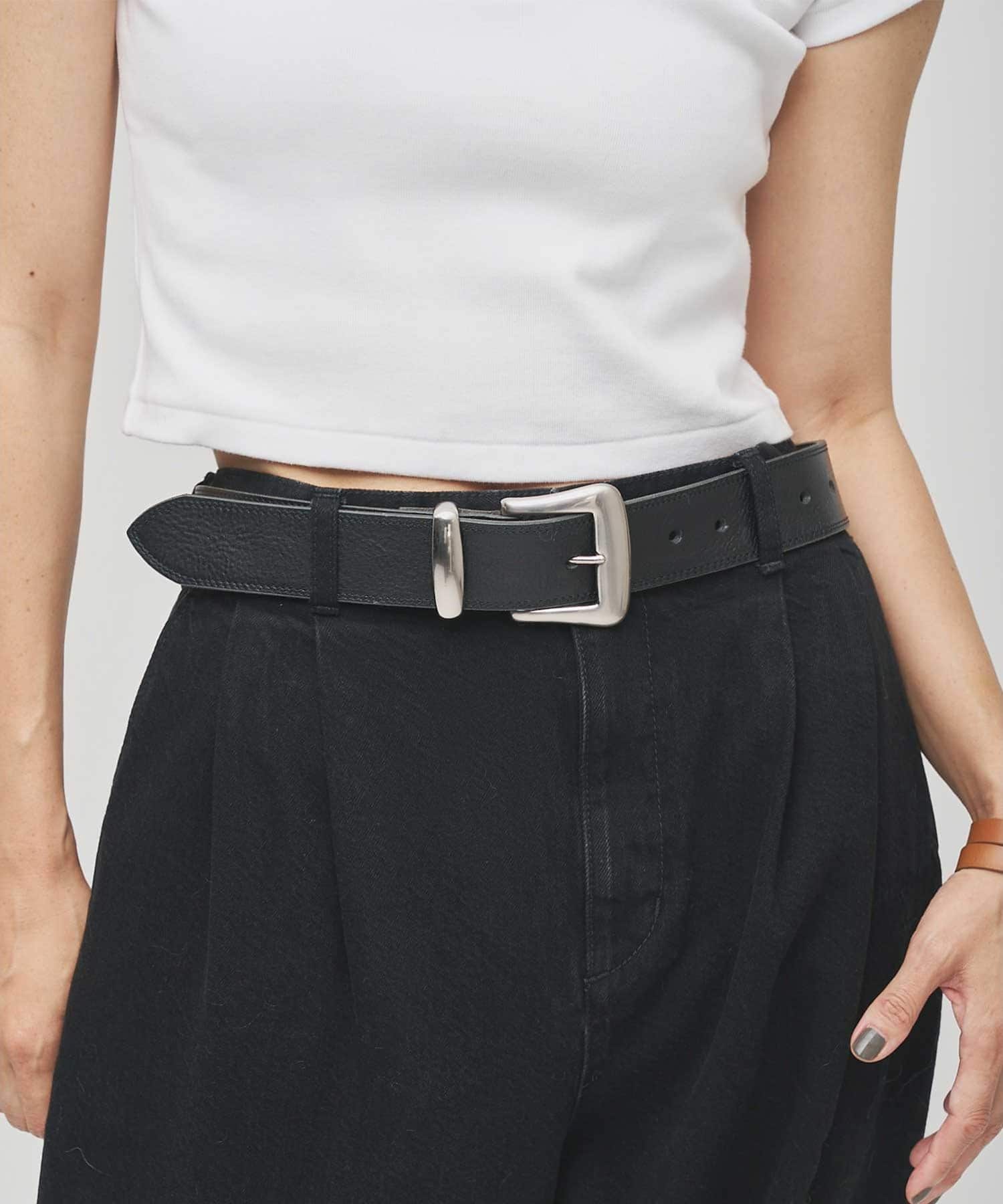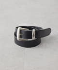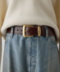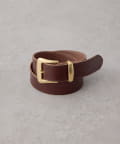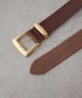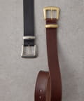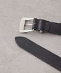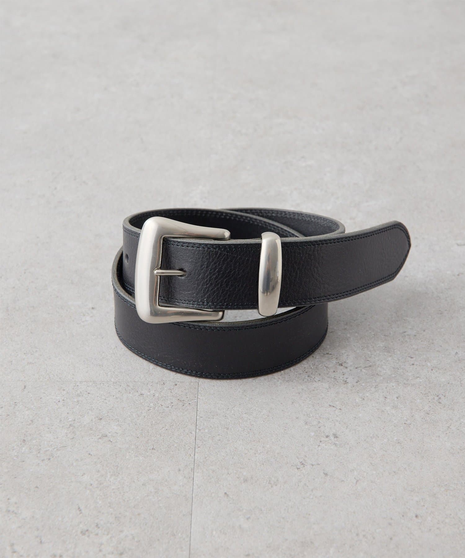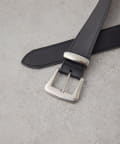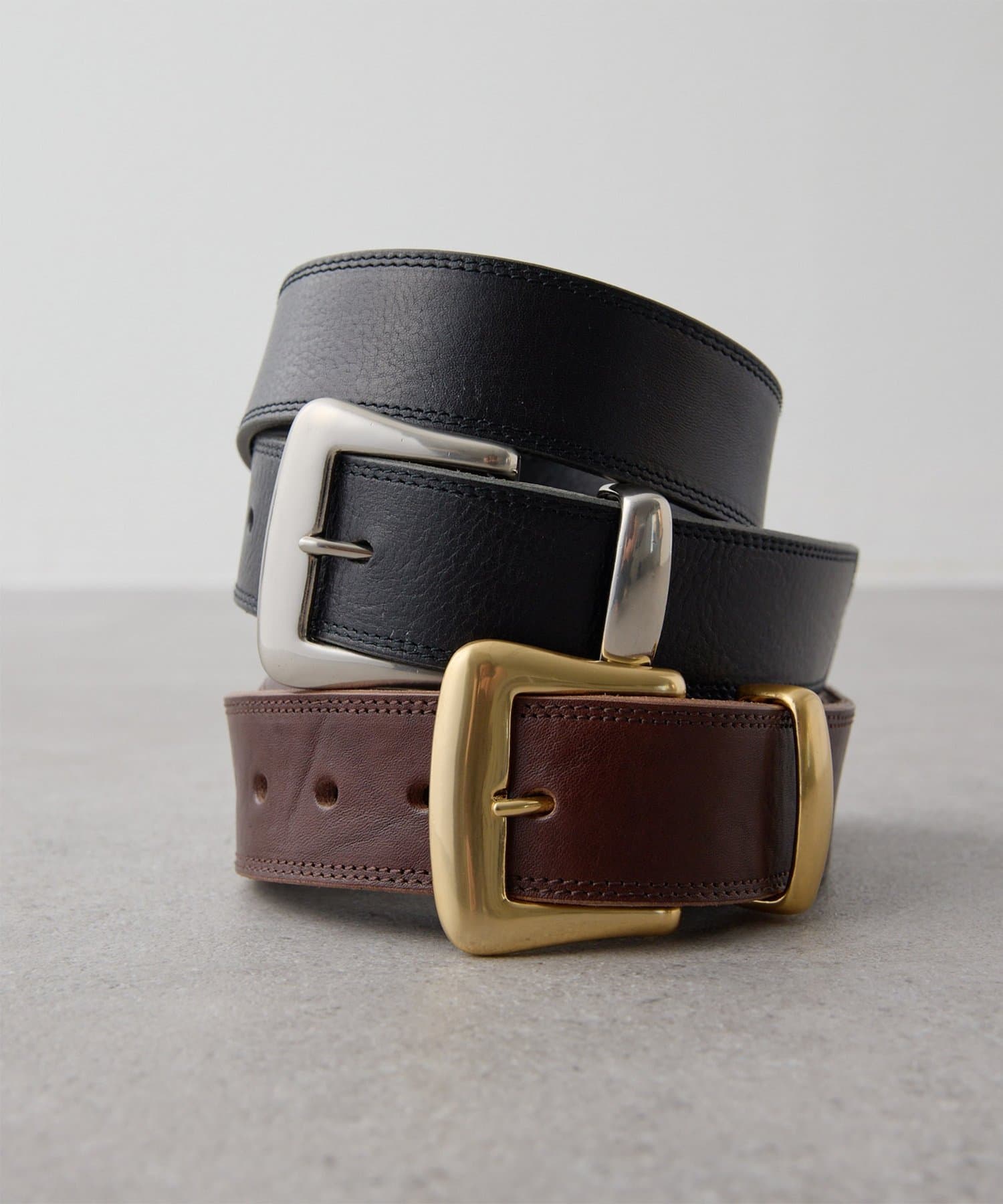 ■重厚なバックル使いがアクセントになるレザーベルト。