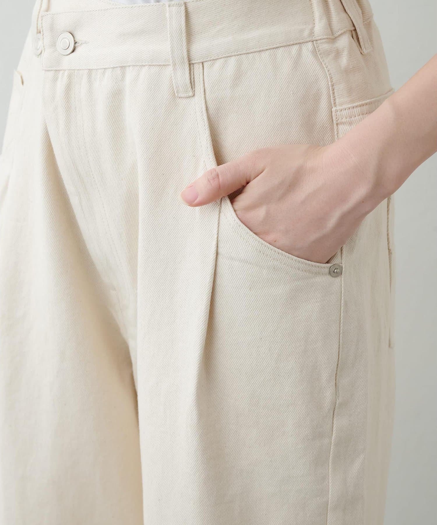■ウエスト部分はボタンでサイズ調整でき、幅広いスタイリングに対応できるアイテム。