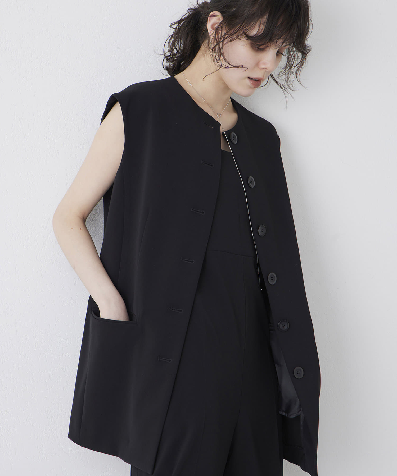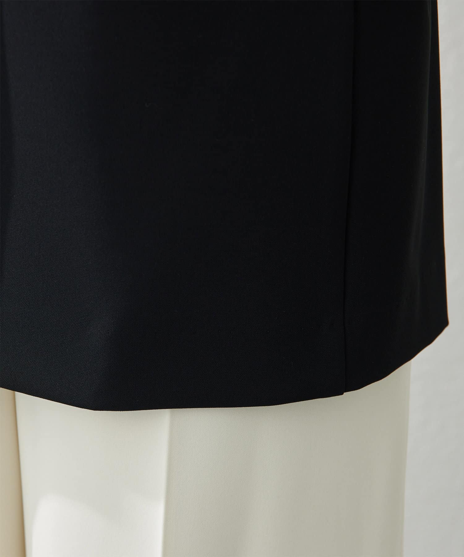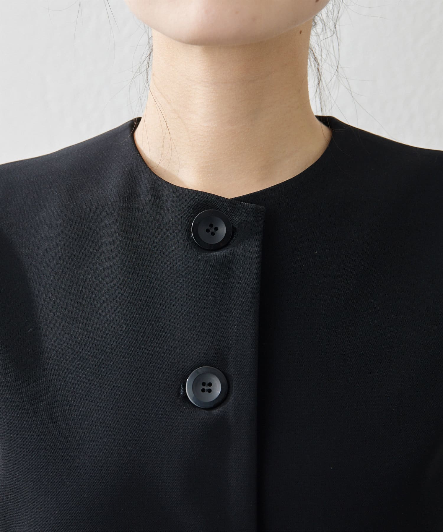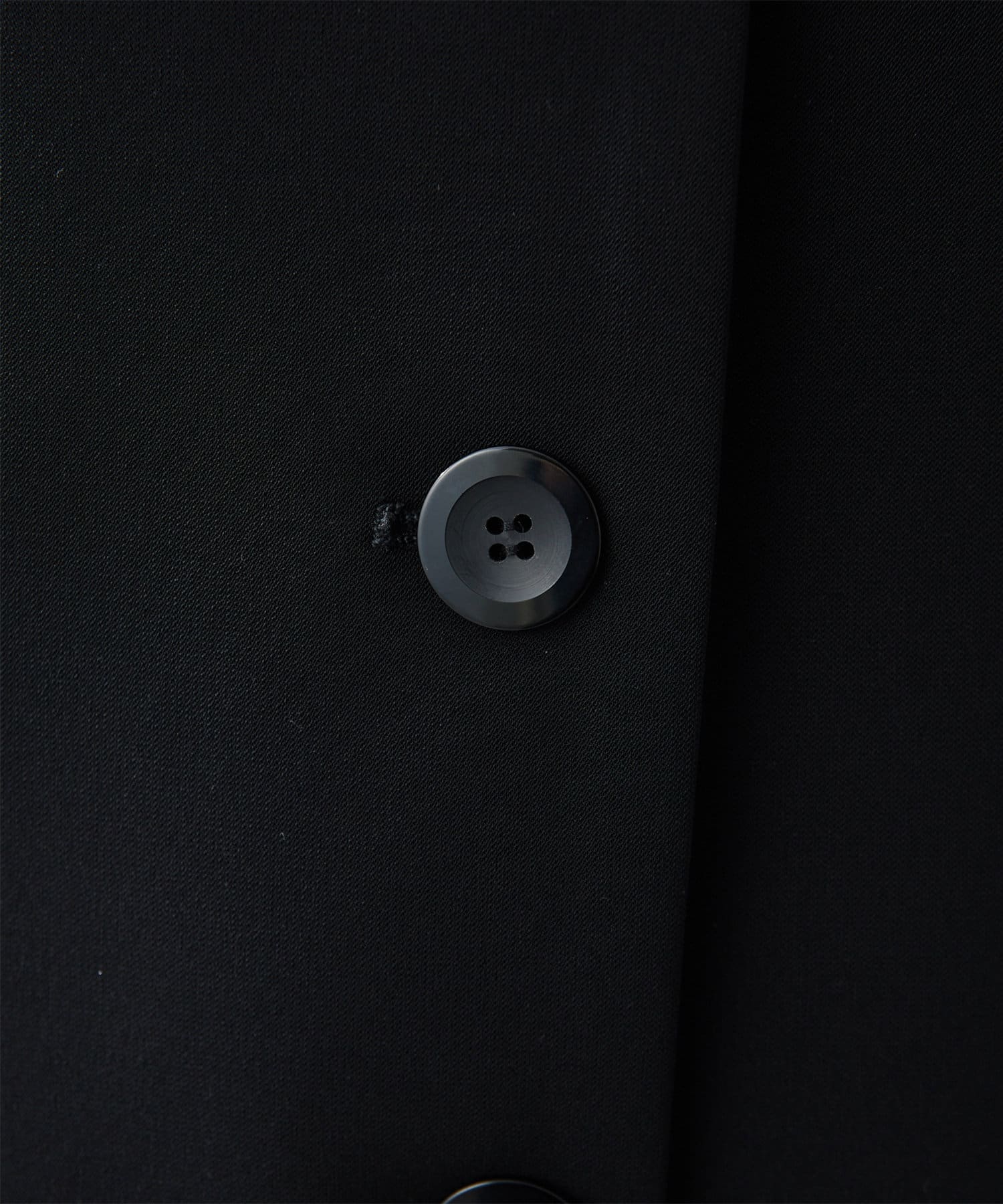 ■ウエストをシェイプさせた細身のデザインや、クルーネック、同色の釦など、ややモードでシックな印象に。